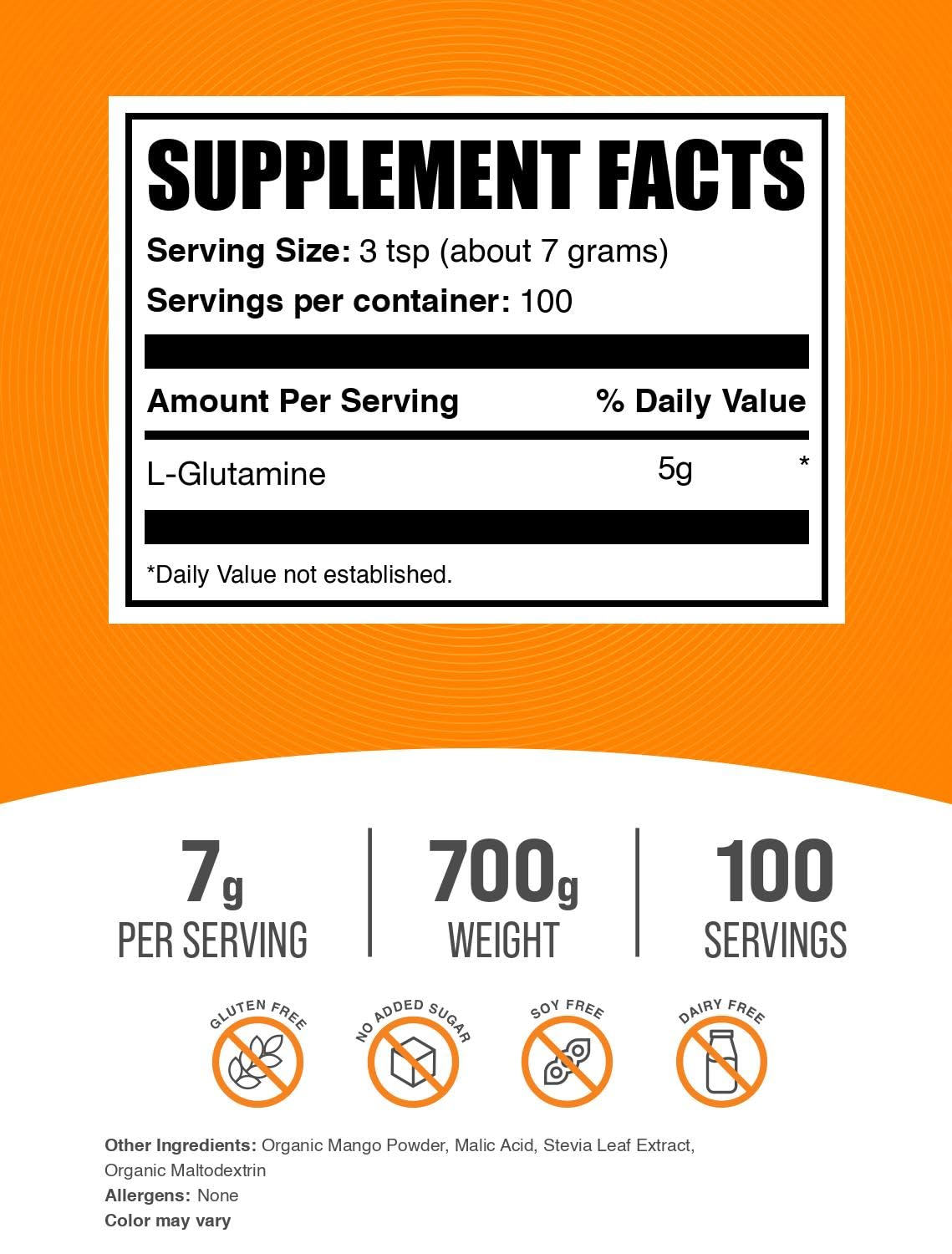 Optimized in every Serving: Our L-Glutamine flavored powder, in Mango Tango flavor, is free of unnecessary allergens, offering you a high-quality product that easily integrates with other supplements or your preferred shake or beverage.