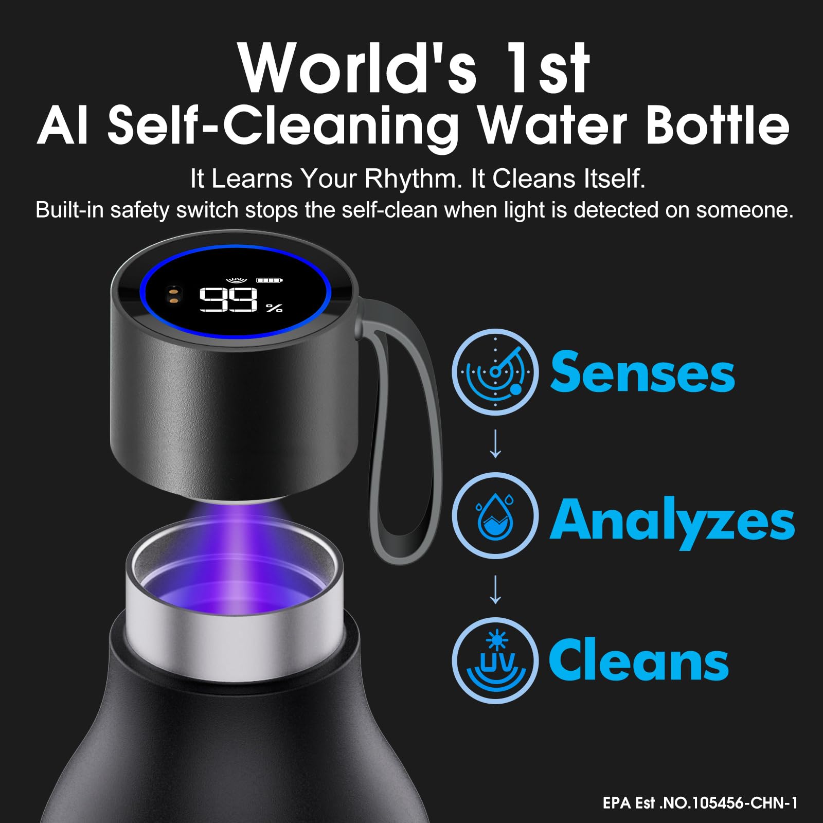 【AI-Powered Self-Cleaning with Safety Lock】This self cleaning water bottle features advanced AI that automatically activates the water bottle self cleaning function based on your usage patterns. The intelligent system includes a safety lock that pauses operation when directed toward the body, ensuring complete protection. With simple long-press activation, it delivers pure water through hands-free sanitization.