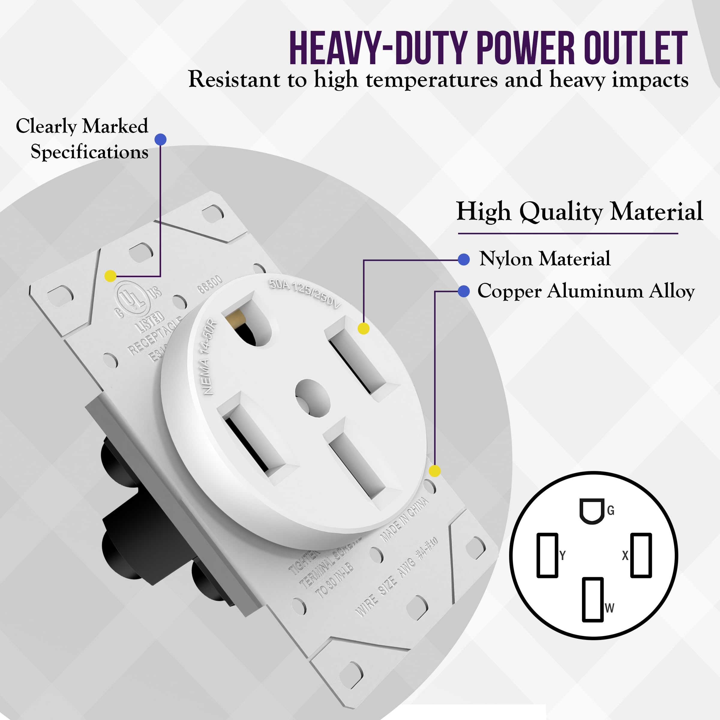 Easy installation: Fits in 2-Gang box styles, terminals marked for easy identification and fast wiring, all mounting hardware included. For wallplates for this 50 amp outlet, type in *Enerlites 7772 Wall Plate". 1-year warranty