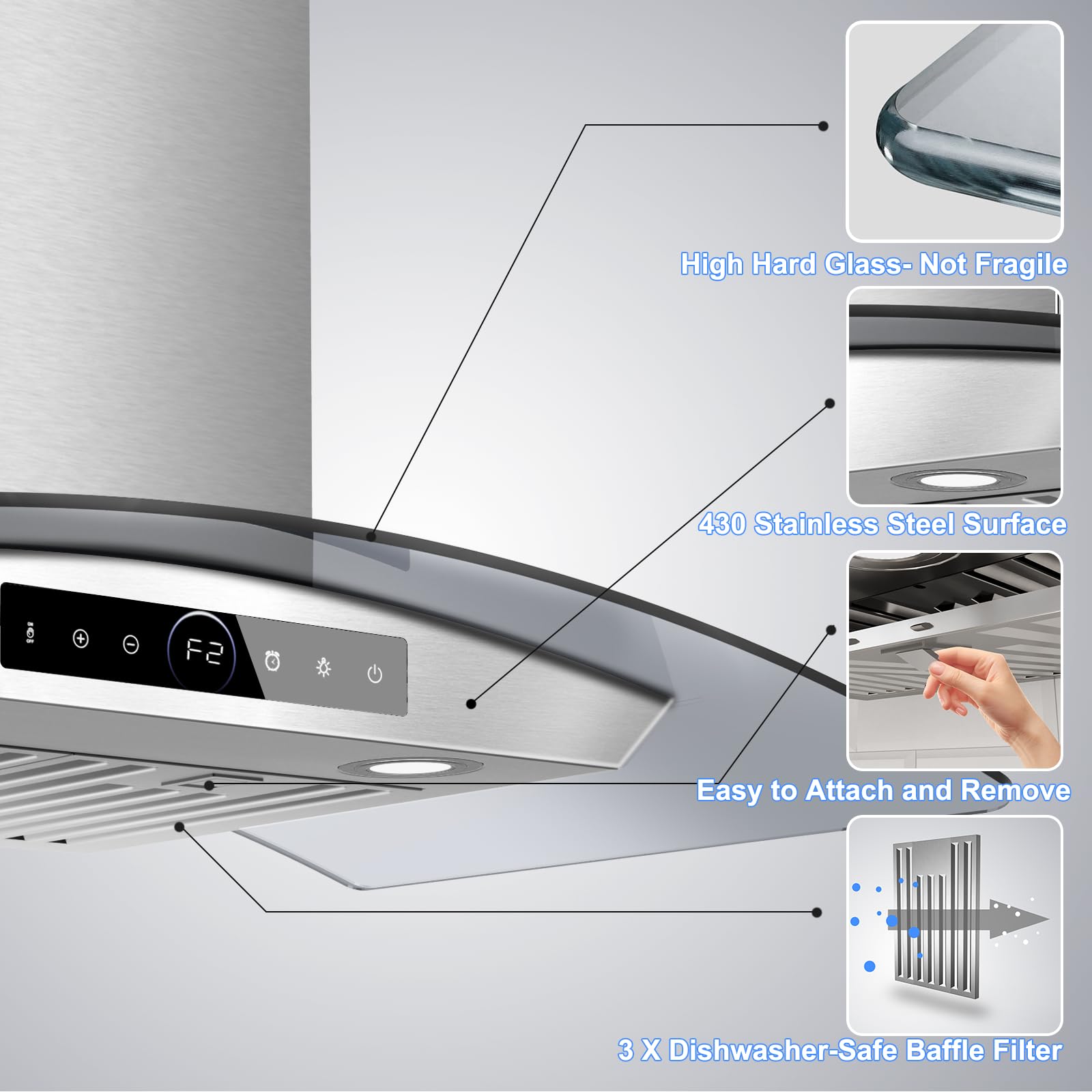 Machine-washable Stainless Steel Baffle Filters. The kitchen vent hoods equipped with two heavy-duty stainless steel baffle filters, they are heat-resistant and rust-resistant, and can effectively capture grease and impurities. The filters are easy to disassemble and reassemble, and can be directly put into the dishwasher for maintenance-free, long service life, and easy to create a clean kitchen.