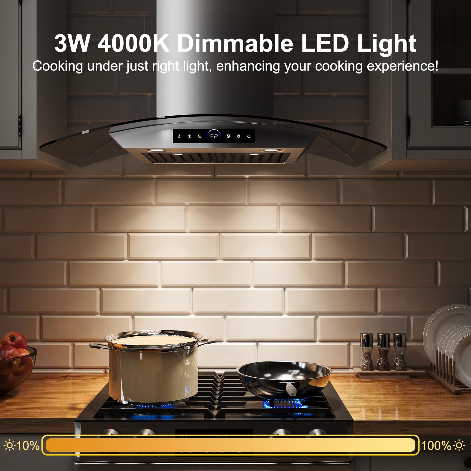 4 Powerful Wind Speeds and Adjustable LED Lights. This 36 inch range hood for kitchen equipped with four adjustable wind speeds, whether it is steaming, boiling, stewing, frying or grilling, it can effectively exhaust oil smoke, steam and odors, keep the kitchen air fresh, while saving energy and reducing cleaning troubles. 2 warm-toned LED lights provide soft and even lighting for your cooking area, and the brightness can be adjusted by pressing a button to create a warm and comfortable cooking atmosphere.