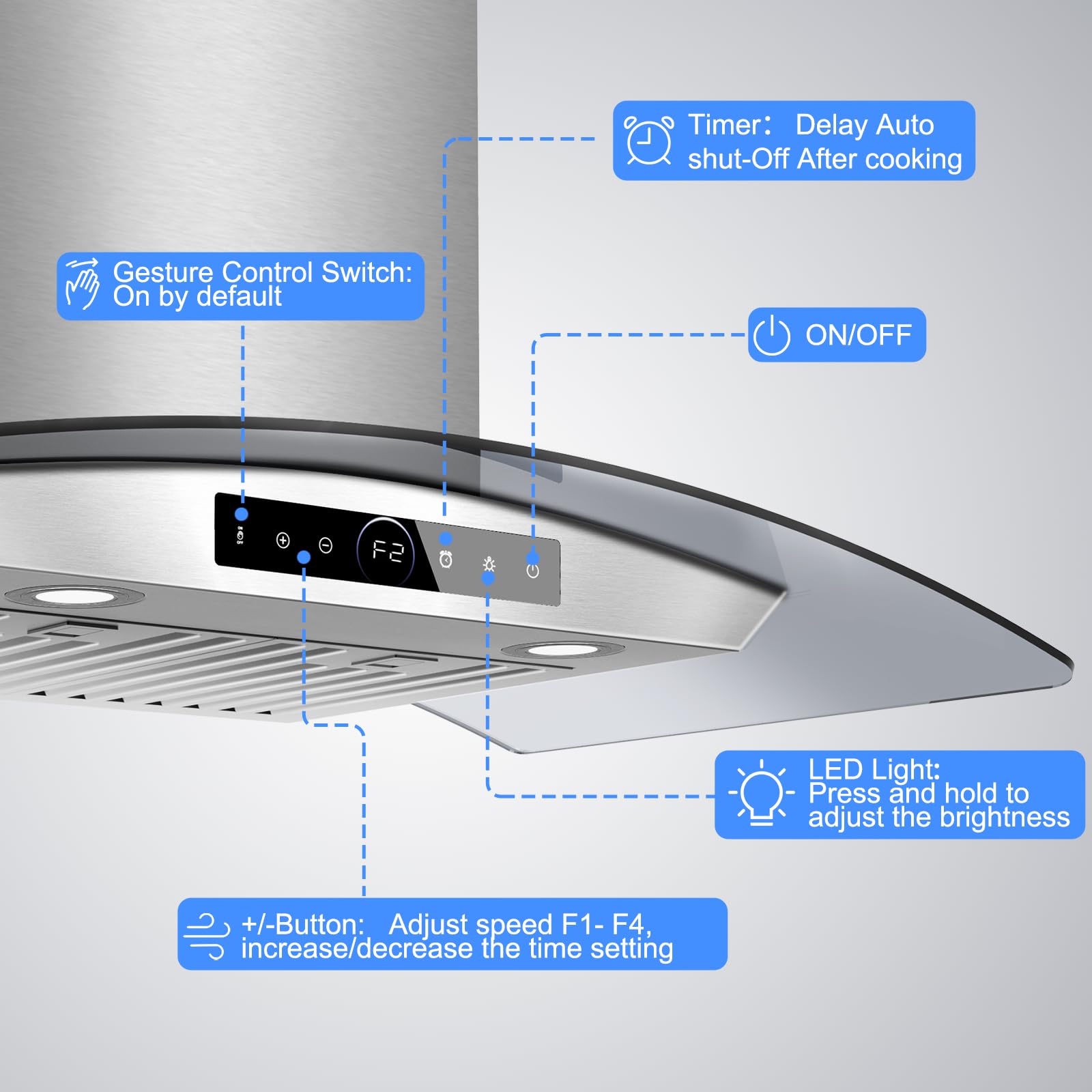 Touch & Gesture Control. This stylish and durable stainless steel under cabinet range hood combines modern elegance with smart features. The intuitive digital touchscreen allows for quick adjustments, and advanced gesture sensing technology allows you to precisely adjust the wind speed with a wave of your hand, with smooth operation and effective avoidance of accidental touches.