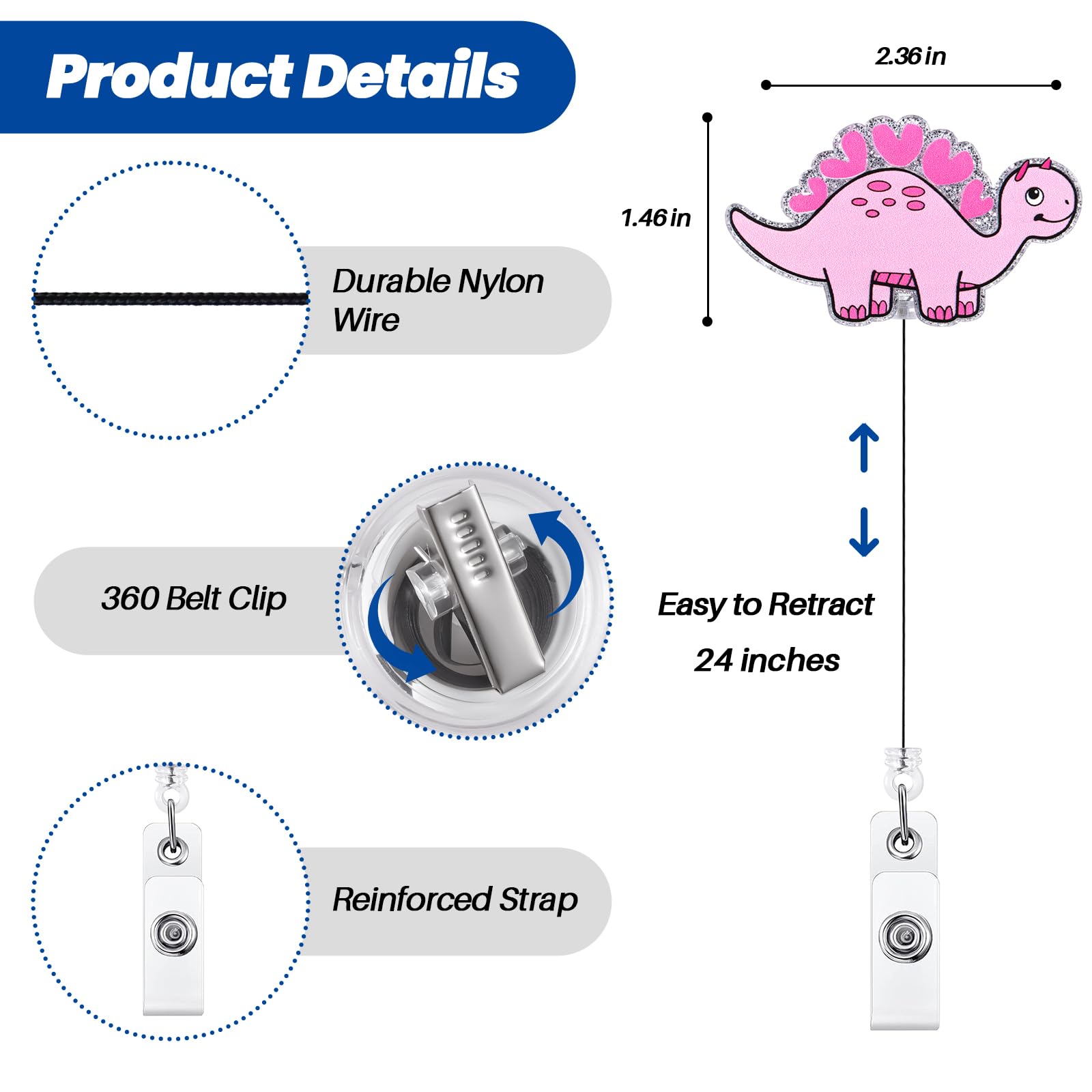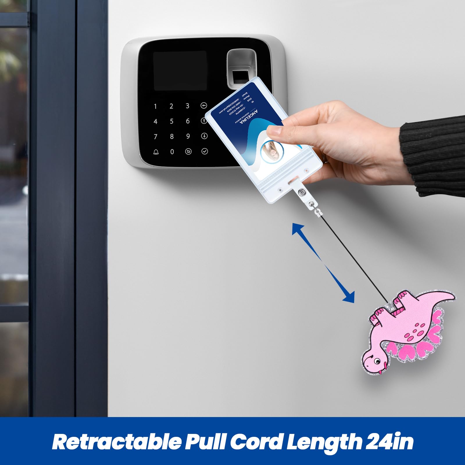 Retractable Cord: The retractable reel cord extends a maximum of 24 inches, more than enough to reach comfortably as far as your arm can reach. The flexible retractable feature enables you to effortlessly display your badge without removing it, enhancing your efficiency at work.