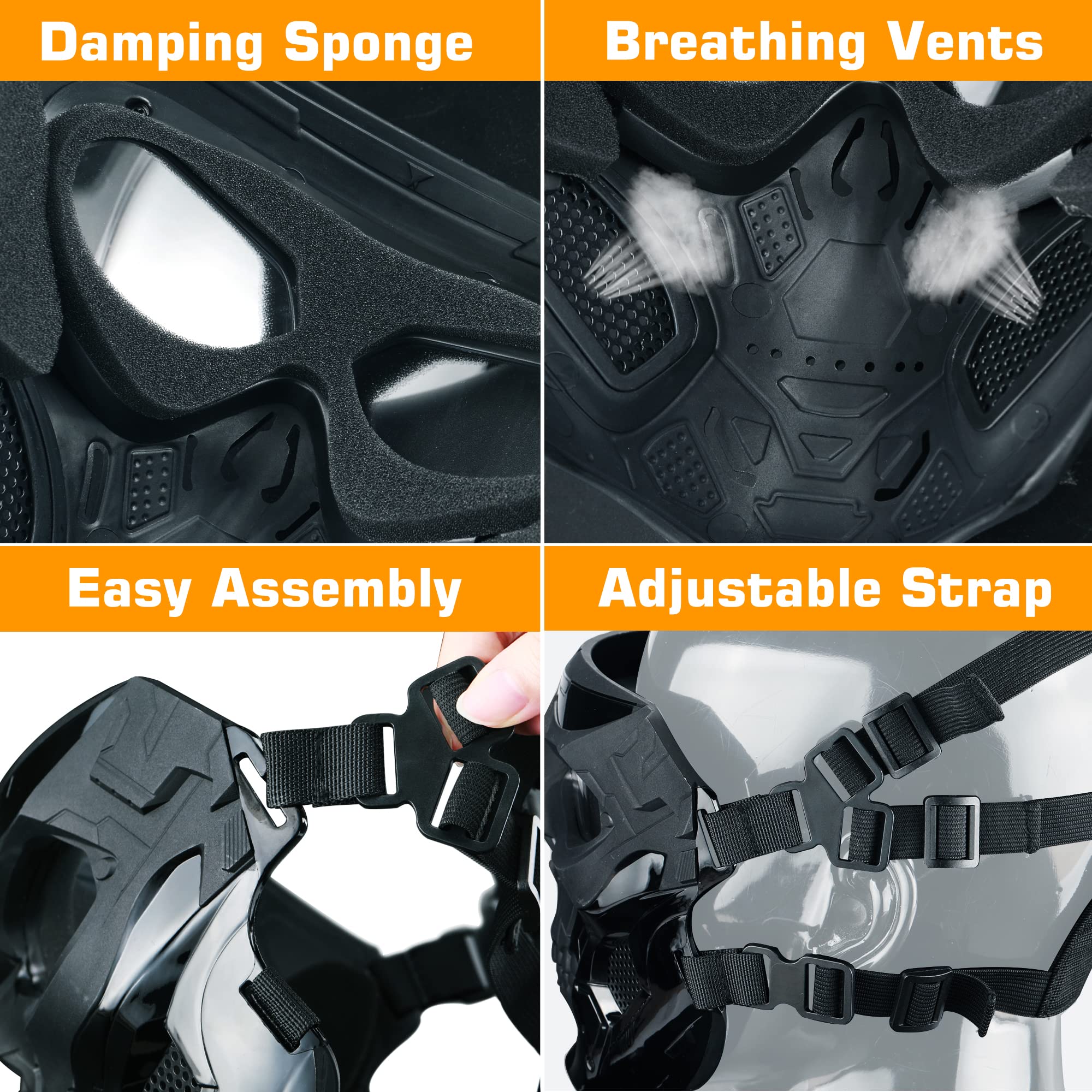 [ Comfortable & Breathable ] : Airsoft Full Face Mask is designed with multiple vents to allow for easy breathing.it's back of paintball mask has cushioning sponges to reduce impact and fully protect your eyes and face