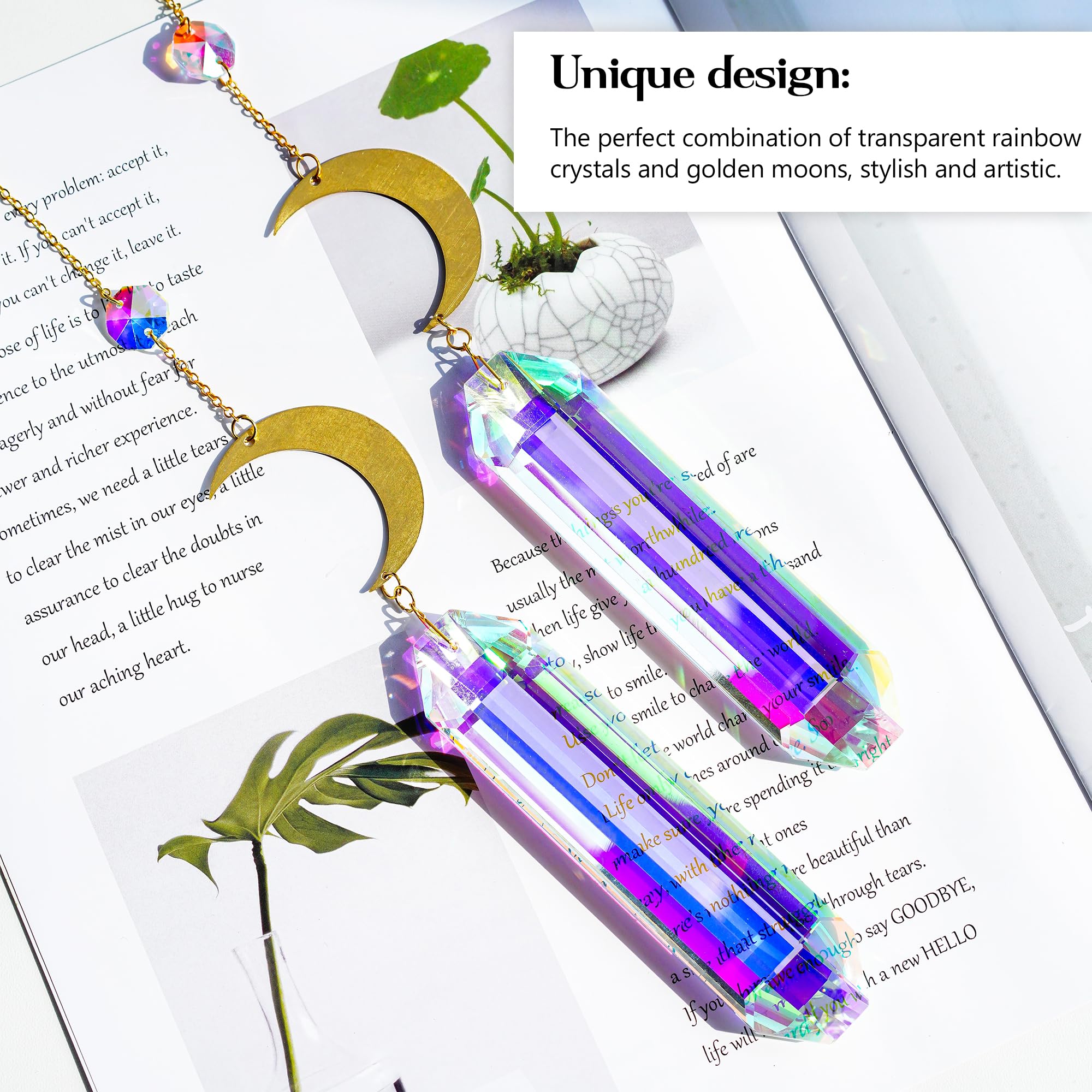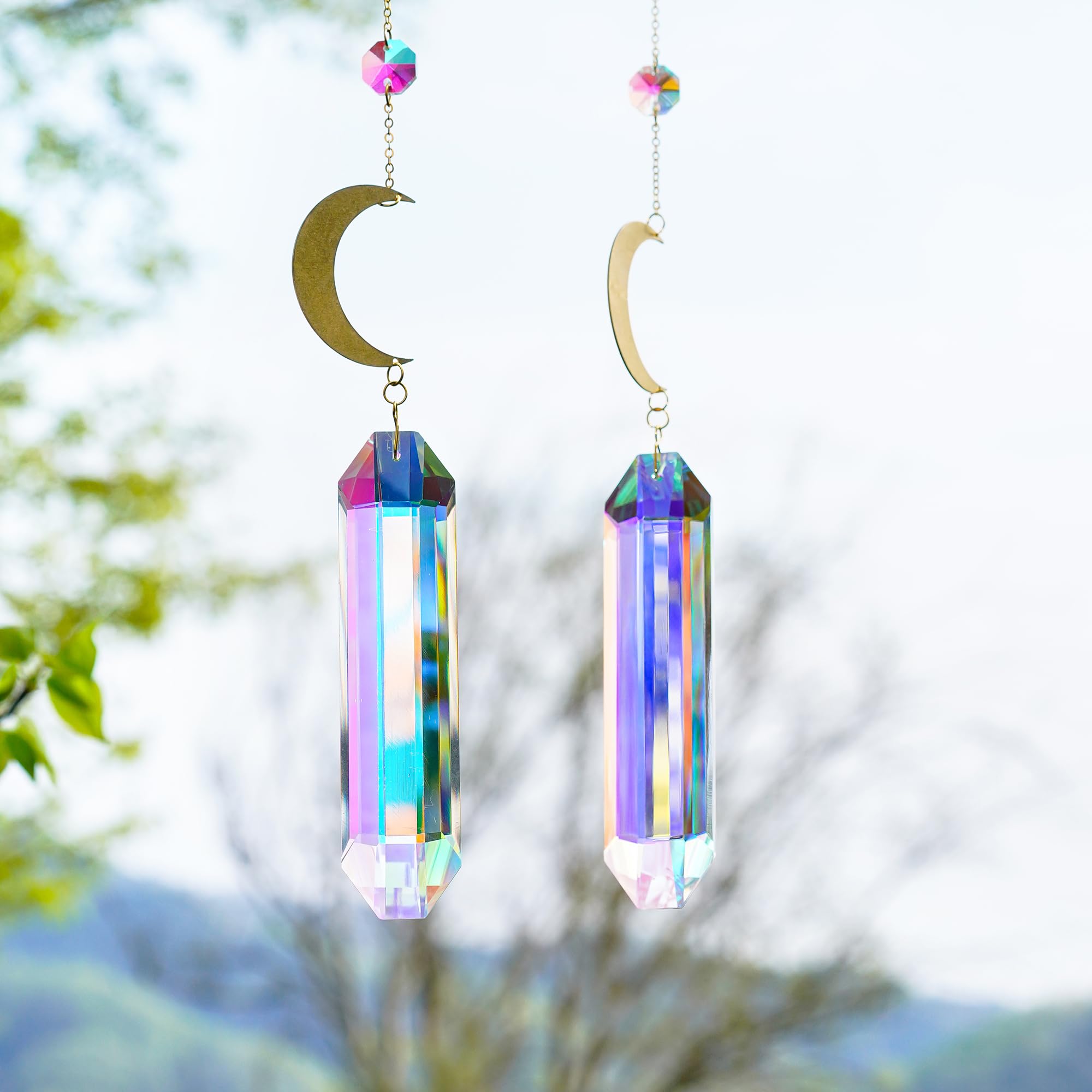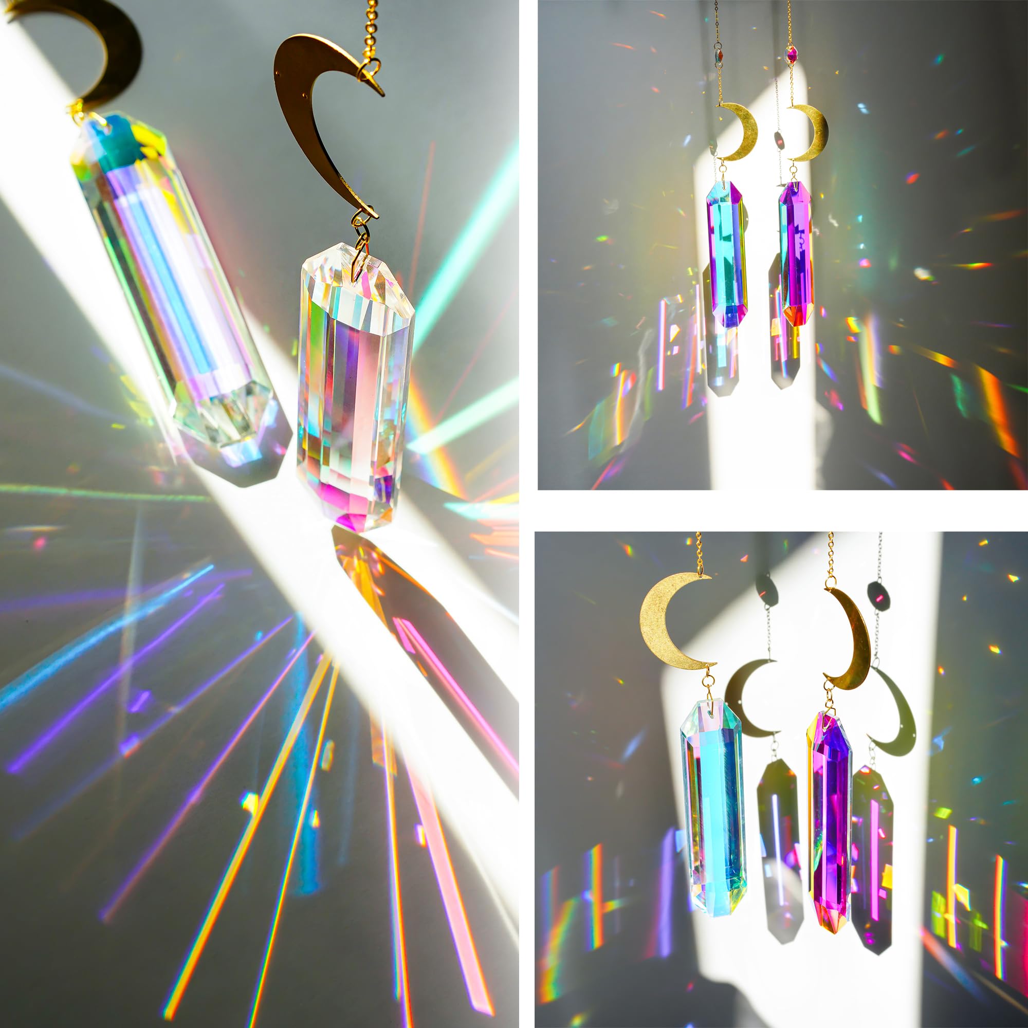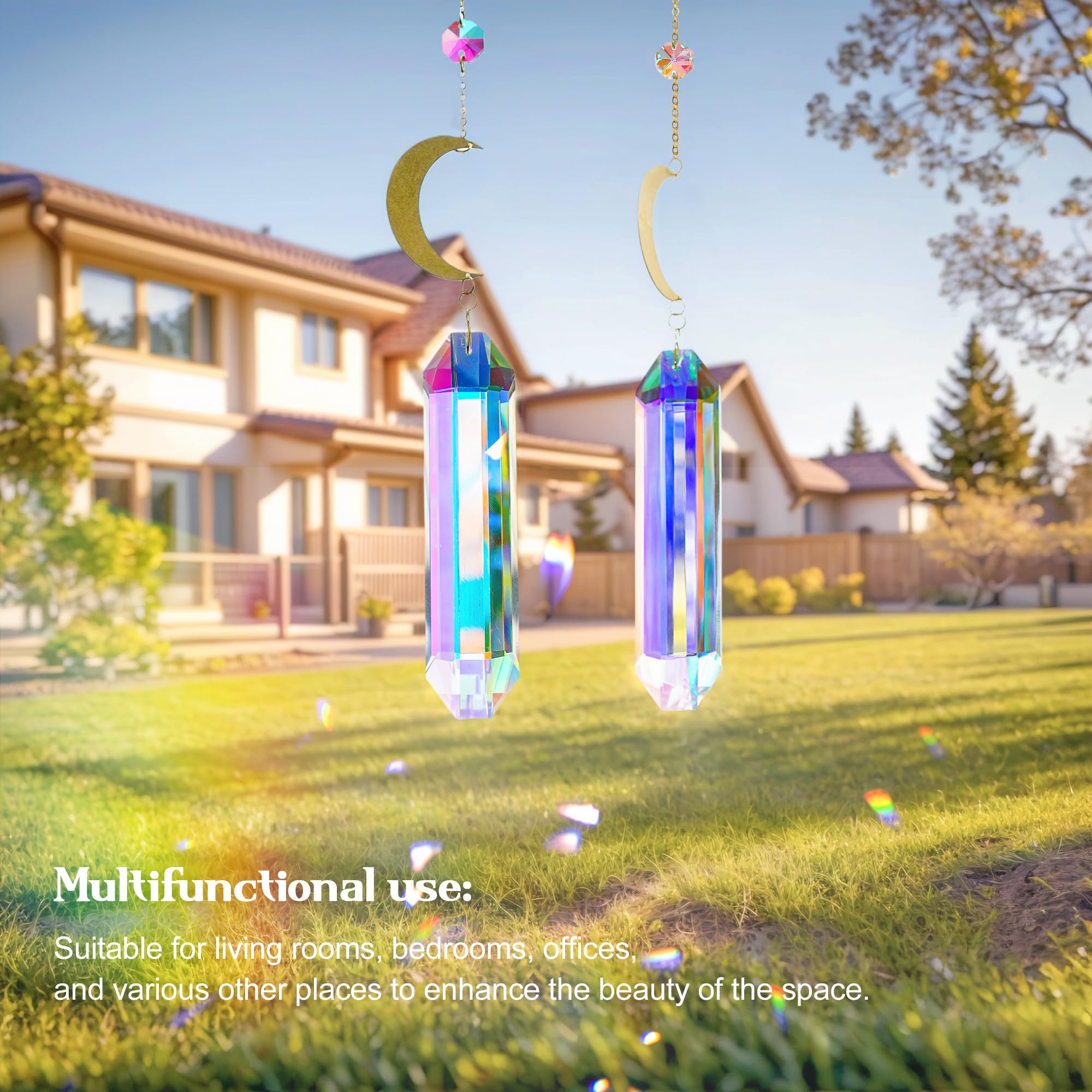Vibrant Crystal Suncatcher Set: This set includes 2 colorful crystal moon suncatchers. With diverse combinations at your disposal, you can effortlessly infuse vivid colors into your daily life. Equipped with a chain, they can be hung easily, illuminating your space and casting enchanting rainbows under natural light