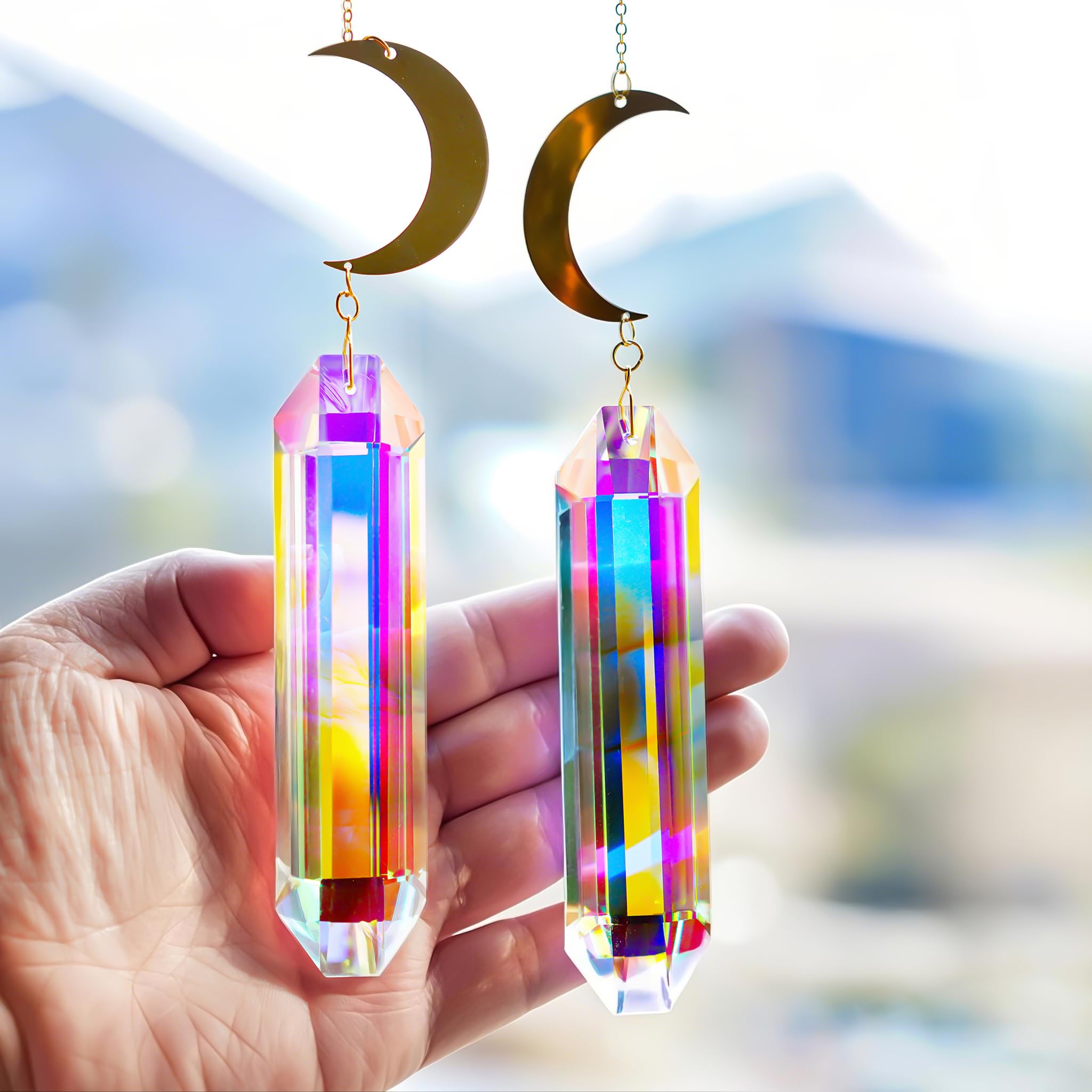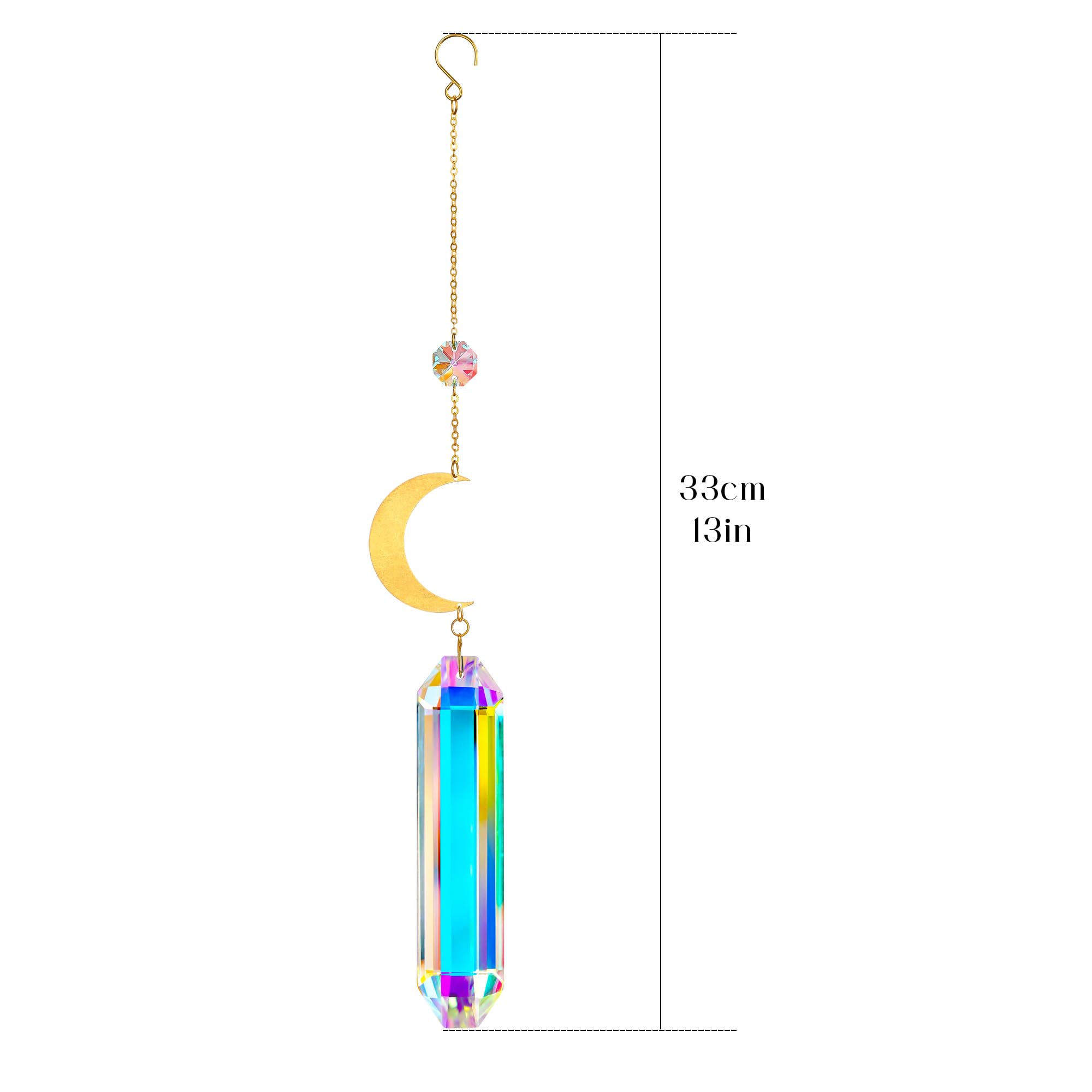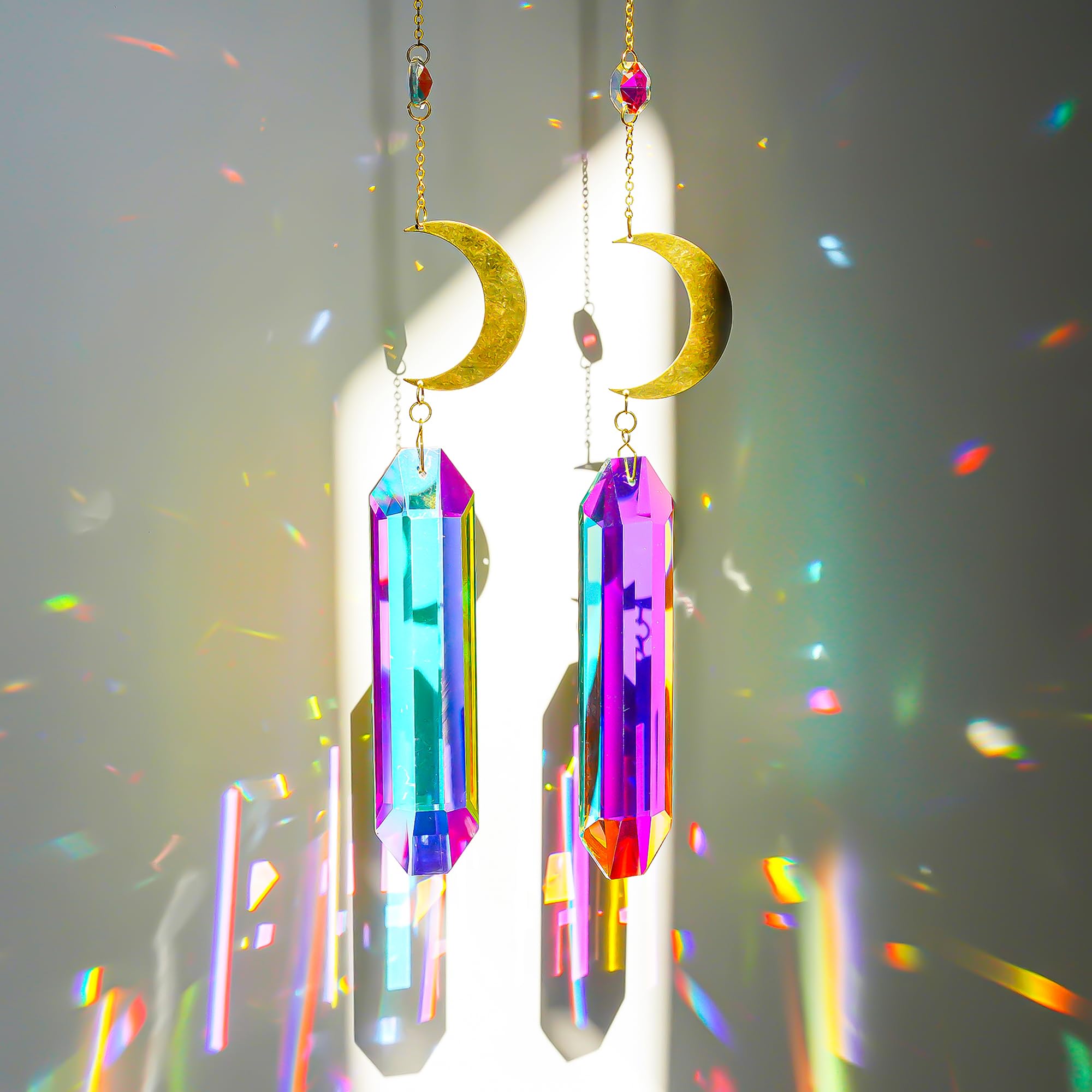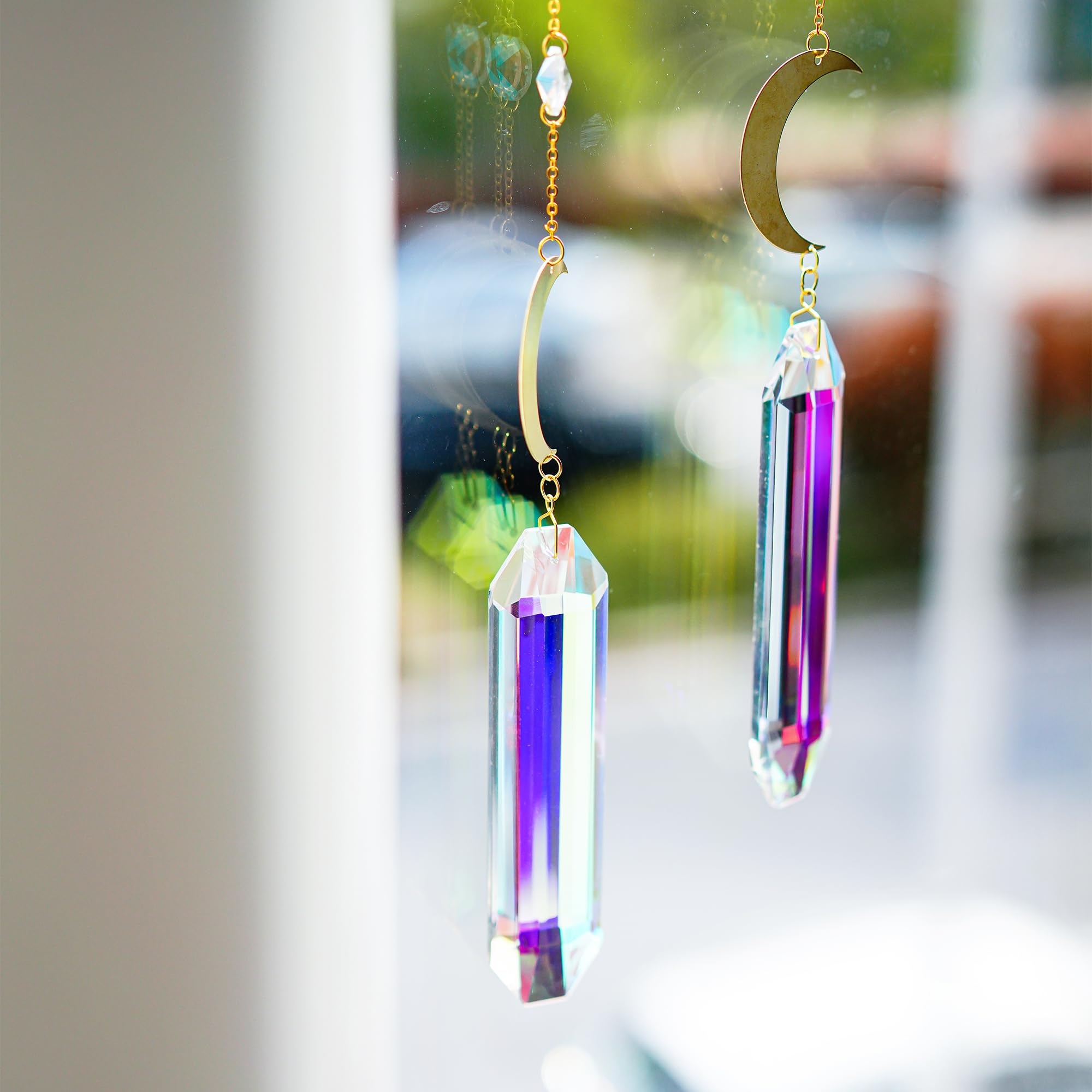 Vibrant Crystal Suncatcher Set: This set includes 2 colorful crystal moon suncatchers. With diverse combinations at your disposal, you can effortlessly infuse vivid colors into your daily life. Equipped with a chain, they can be hung easily, illuminating your space and casting enchanting rainbows under natural light