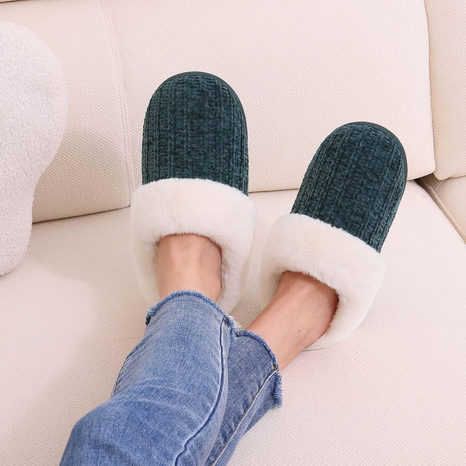 𝐂𝐥𝐚𝐬𝐬𝐢𝐜 𝐖𝐢𝐧𝐭𝐞𝐫 𝐊𝐧𝐢𝐭 𝐒𝐥𝐢𝐩𝐩𝐞𝐫𝐬: Featuring a breathable chenille knit uppers design, along with high-quality and comfort fluffy faux fur collar trim, lined with thickening fleece, the house slippers wrap your feet very well, keep your feet nice and toasty whether in socks or bare feet.