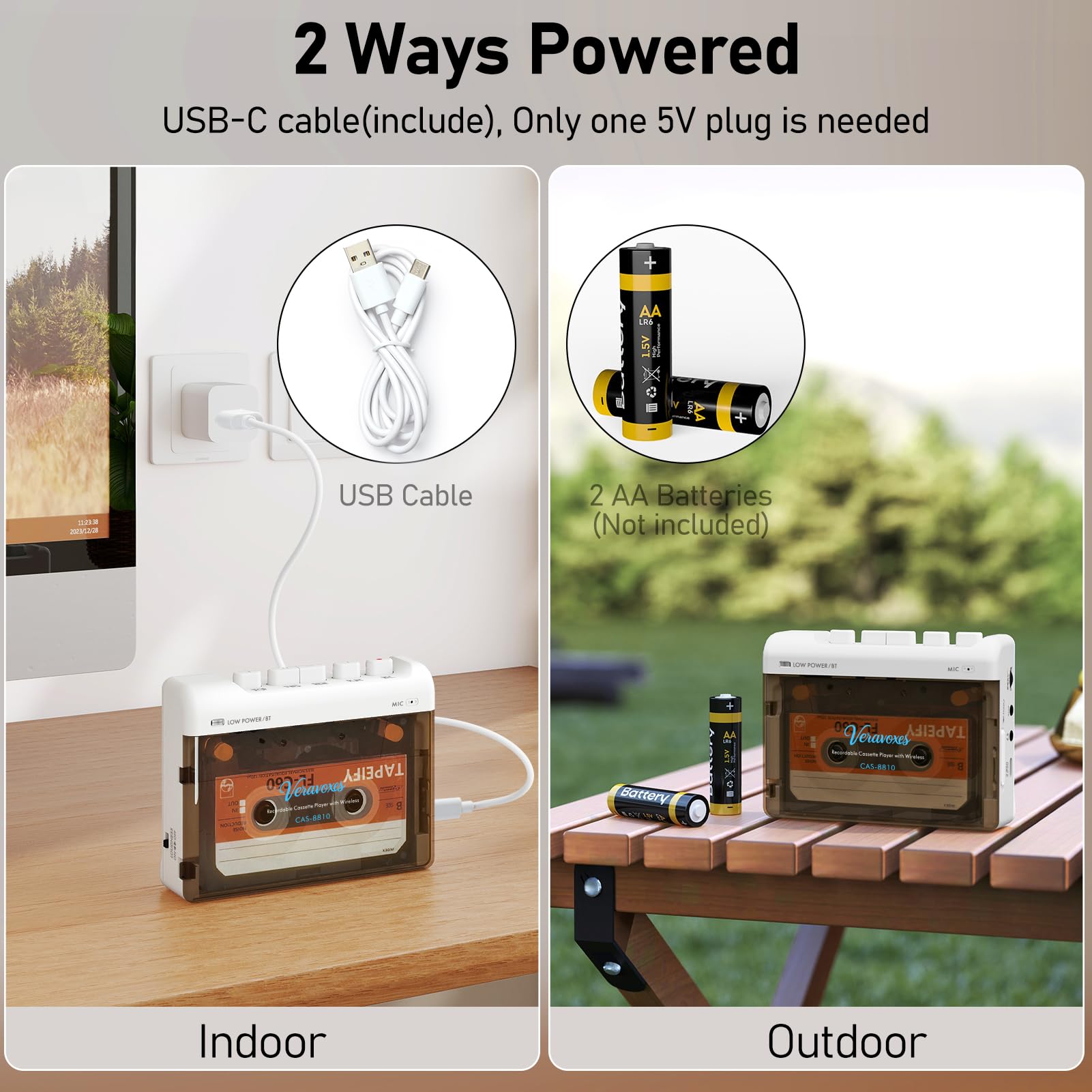 【Dual Power Supply】The cassette recorder supports two power options: two AA batteries or a DC 5V power source. When an external power source is available, connect the included USB to Type-C cable to a 5V power adapter (sold separately). In outdoor settings without power access, using two AA batteries (sold separately) is generally recommended. Select the power source based on your actual needs.