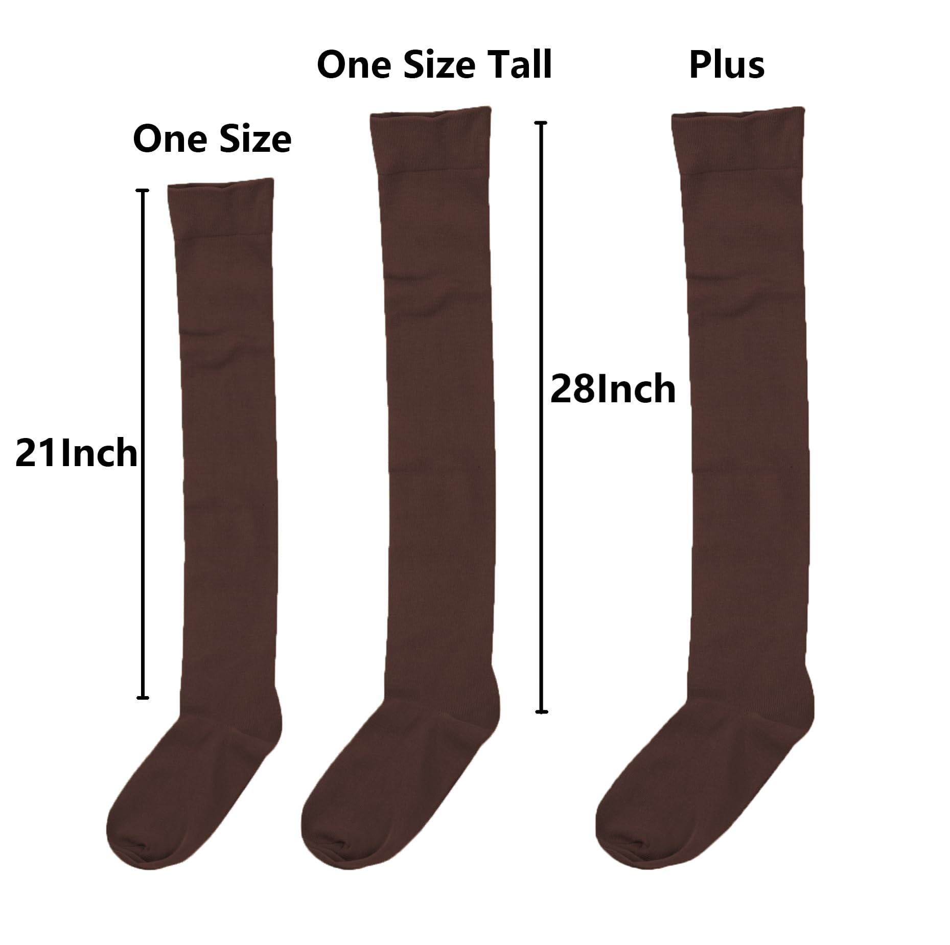 3 Size: One size: the length from the top to the heel is about 21 Inches/53 cm, maximum thigh circumference is about 21in, Recommended for heights 5.0 - 5.7ft. One size tall: the length from the top to the heel is about 28 Inches/72 cm, maximum thigh circumference is 23in, Recommended for tall heights 5.4 - 5.9ft. One size plus tall: the length from the top to the heel is about 28 Inches/72 cm, maximum thigh circumference is about 25in, Recommended for heights 5.5 - 6ft