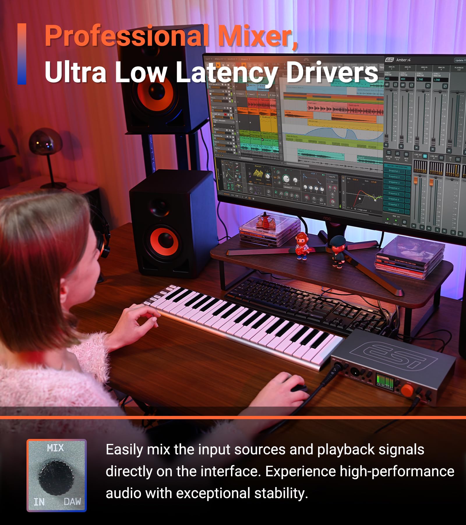 FLEXIBLE MONITORING WITH ADM: ADM (Advanced Direct Monitoring) allows you to directly and independently control the level of all input signals on the hardware and blend them with DAW signals, enabling flawless recording.