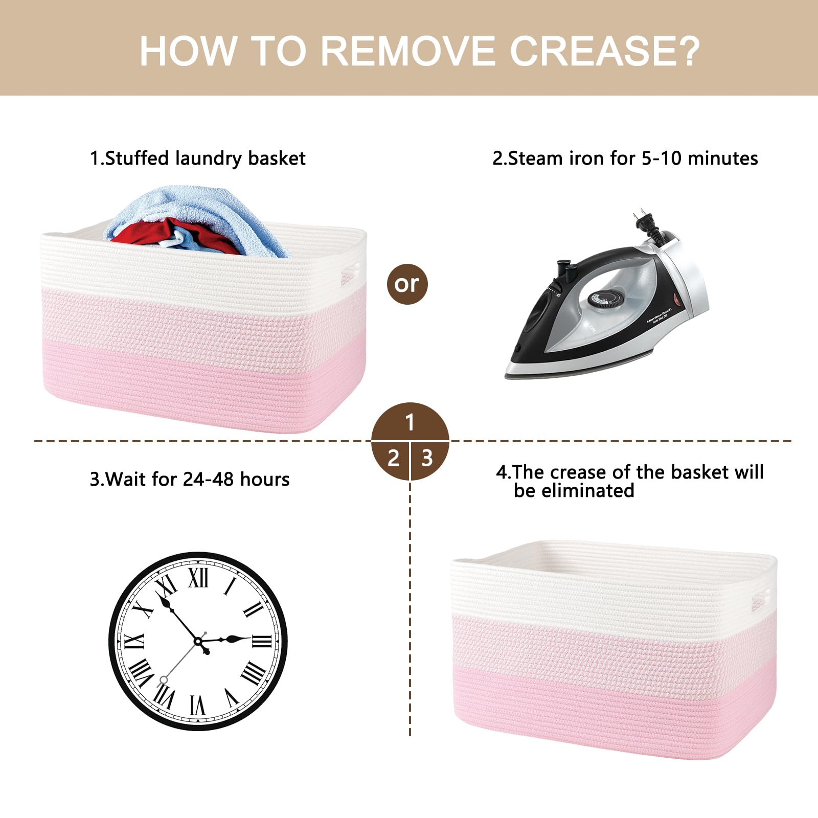 Washable Large Basket: This large basket can be washed by hand or machine with gentle detergent. If machine washed, please put them into a laundry bag. NOTE: These cotton rope baskets are folded when shipping, but it will turn back to its elegant shape quickly if you fill it with some towels or clothing, and iron is great idea to remove the creases