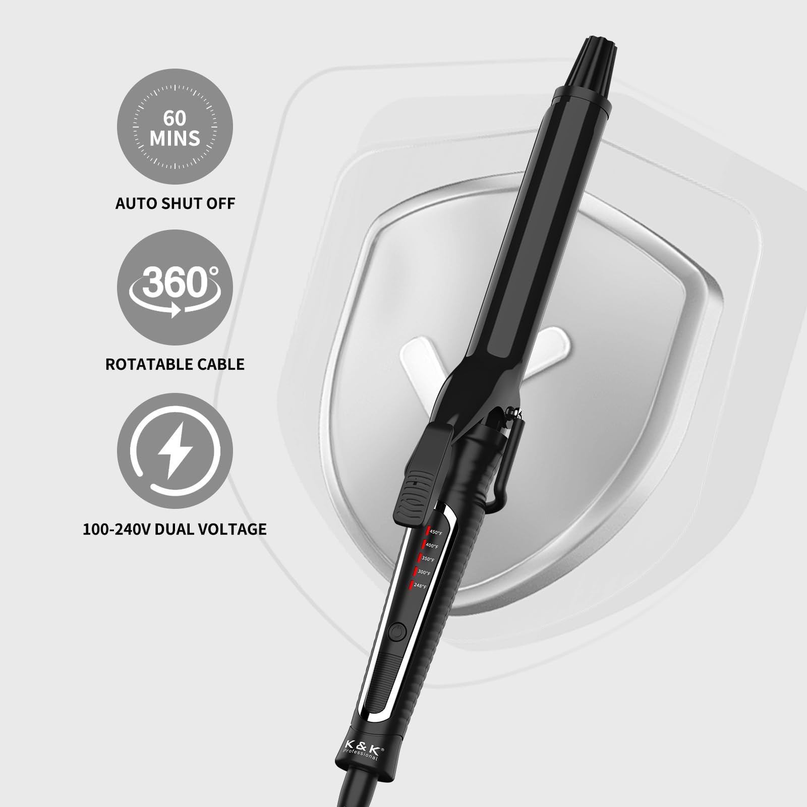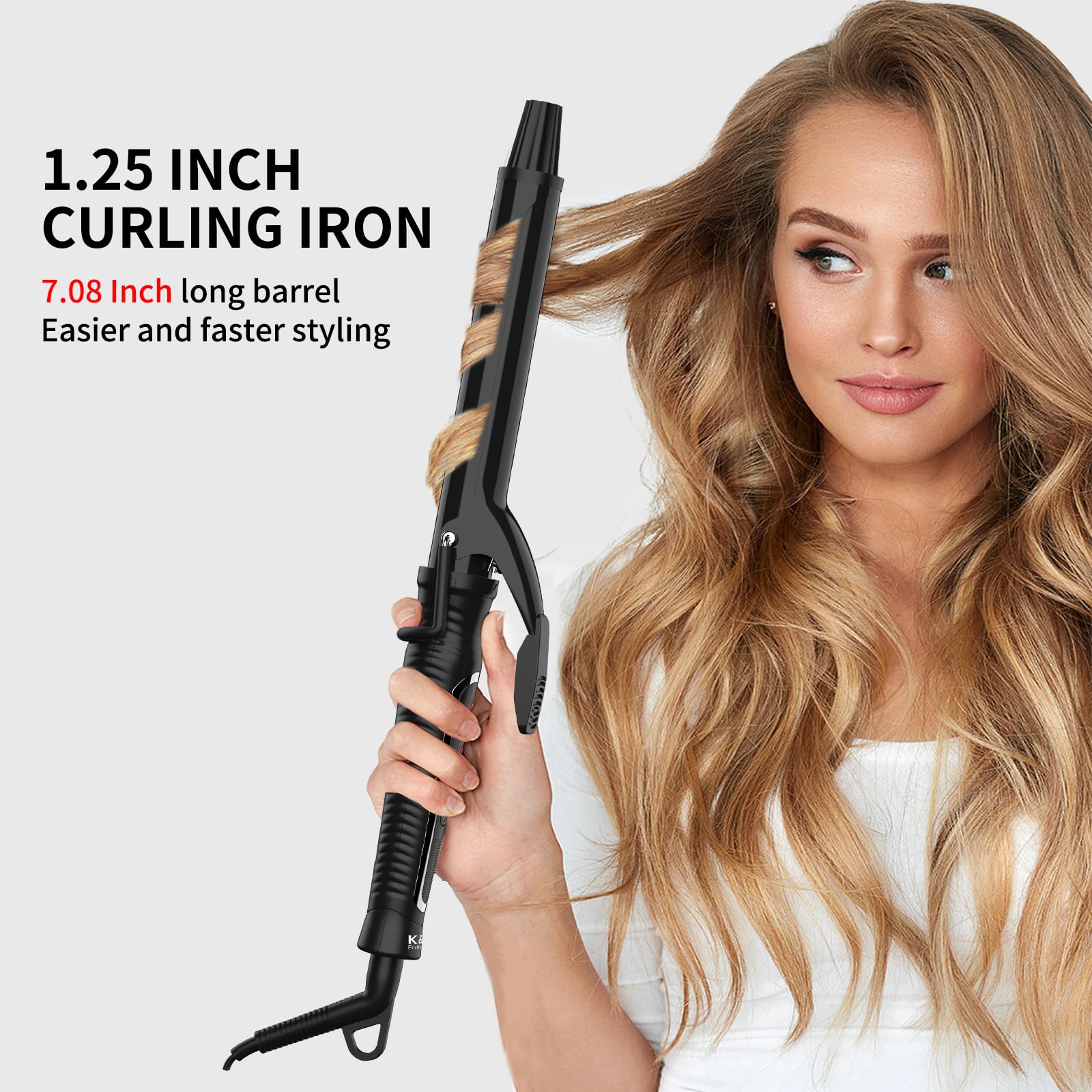 THOUGHTFUL DESIGN & PORTABLE:The 1.25 inch curling iron with a 60min auto-off function, universal dual voltage 100V-240V for worldwide use; temperature lock function:; 360° swivel cord with long cable; it includes two clips., anti-scald glove.