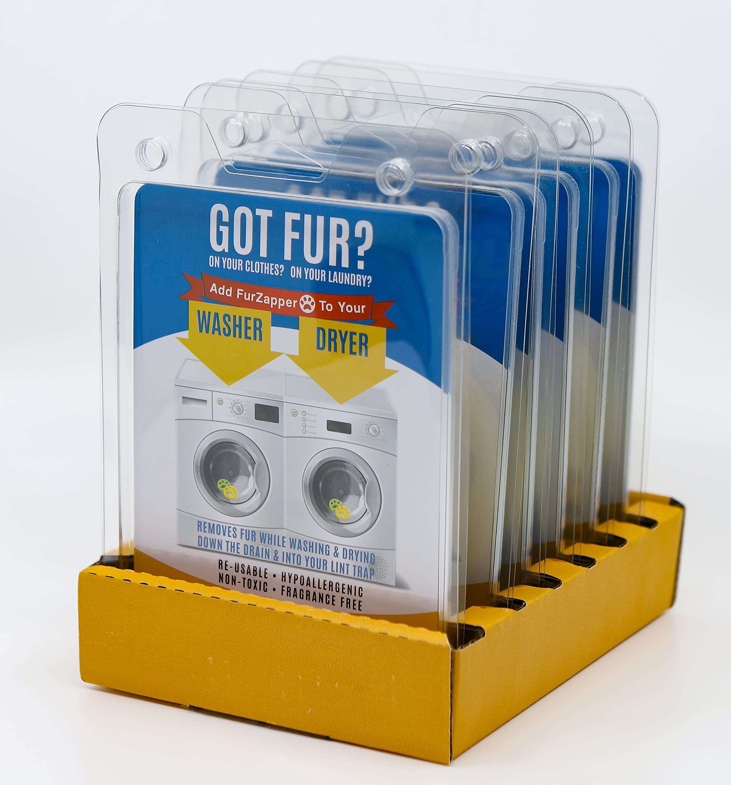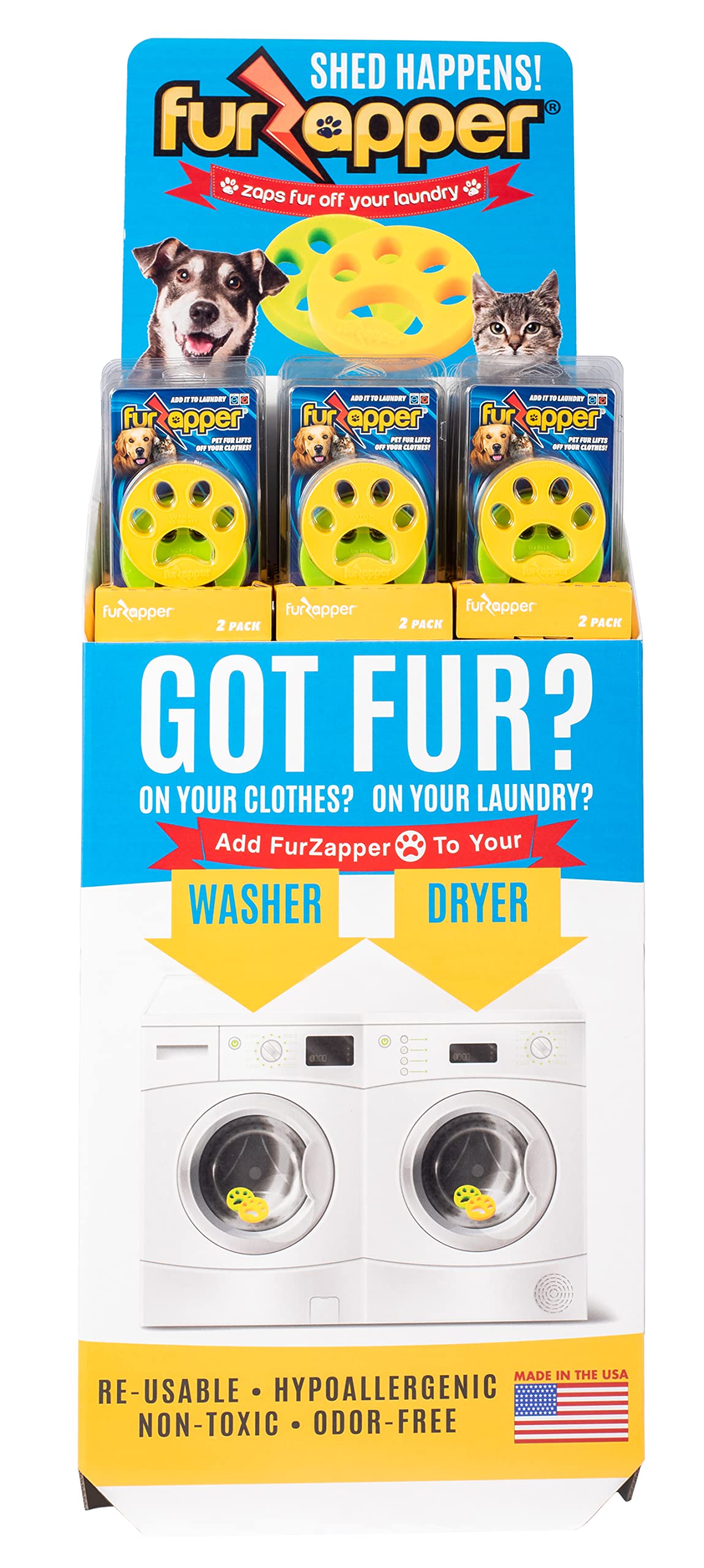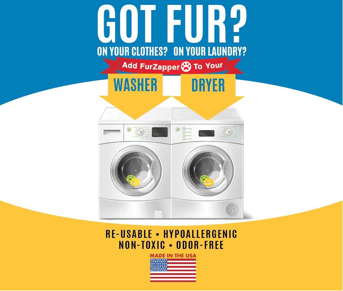 IMPORTANT! DO NOT USE FABRIC SOFTENER WITH FURZAPPER! GOT PET FUR? ON YOUR CLOTHES? ON YOUR LAUNDRY? DO YOU WASH AND DRY AND STILL HAVE PET HAIR ALL OVER? FurZapper removes pet hair from your clothing while you wash and dry your clothes. Works in both washer AND dryer. Safe for all clothing, non-toxic, hypo-allergenic, Re-usable, easy, and self-cleaning! FurZapper is made from a very soft, tacky, flexible material that grabs dog or car fur and hair, pulls it from the clothes, and washes it down the drain or into your lint trap. The patent-pending pet fur remover helps remove fur, hair, lint, dander and more on your clothes, pet bed, jackets, blankets, and more. The FurZapper is very tacky, and very flexible, and is gummy enough make fur, hair, dust, and debris cling to it. A washer and dryers movements helps FurZapper cling to fur as it tumbles 100% Made in the USA! Not a cheap Foreign product! This product was invented out of necessity by a work at home dad who was constantly washing and re-washing clothes to try to remove the dog and cat hair. This patent-pending product helps remove fur, hair, lint, dander and other debris on your clothes, bedding, jackets, dresses, blankets, sheets and anything that you wash and dry. #FurZapper #PetFurRemover #PetHairOnClothes #PetHairRemoverWasher #PetHairRemoverDryer We know the FurZapper is Better than using Pet Lint Rollers on your laundry! Good for both Cats and Dogs! Looking for a lint roller for dog hair? We have an better option that even out performs the best lint rollers or fur rollers. The best pet hair remover is here- better than a pet fur roller, or lint roller for getting all the pesky cat and dog hair off your clothes in the washer or dryer. Got CAT FUR or cat hair on clothes? Add the FurZapper to your laundry as you wash and dry your clothing. Blankets, shirts, jackets, dresses, especially dog blankets and beds!