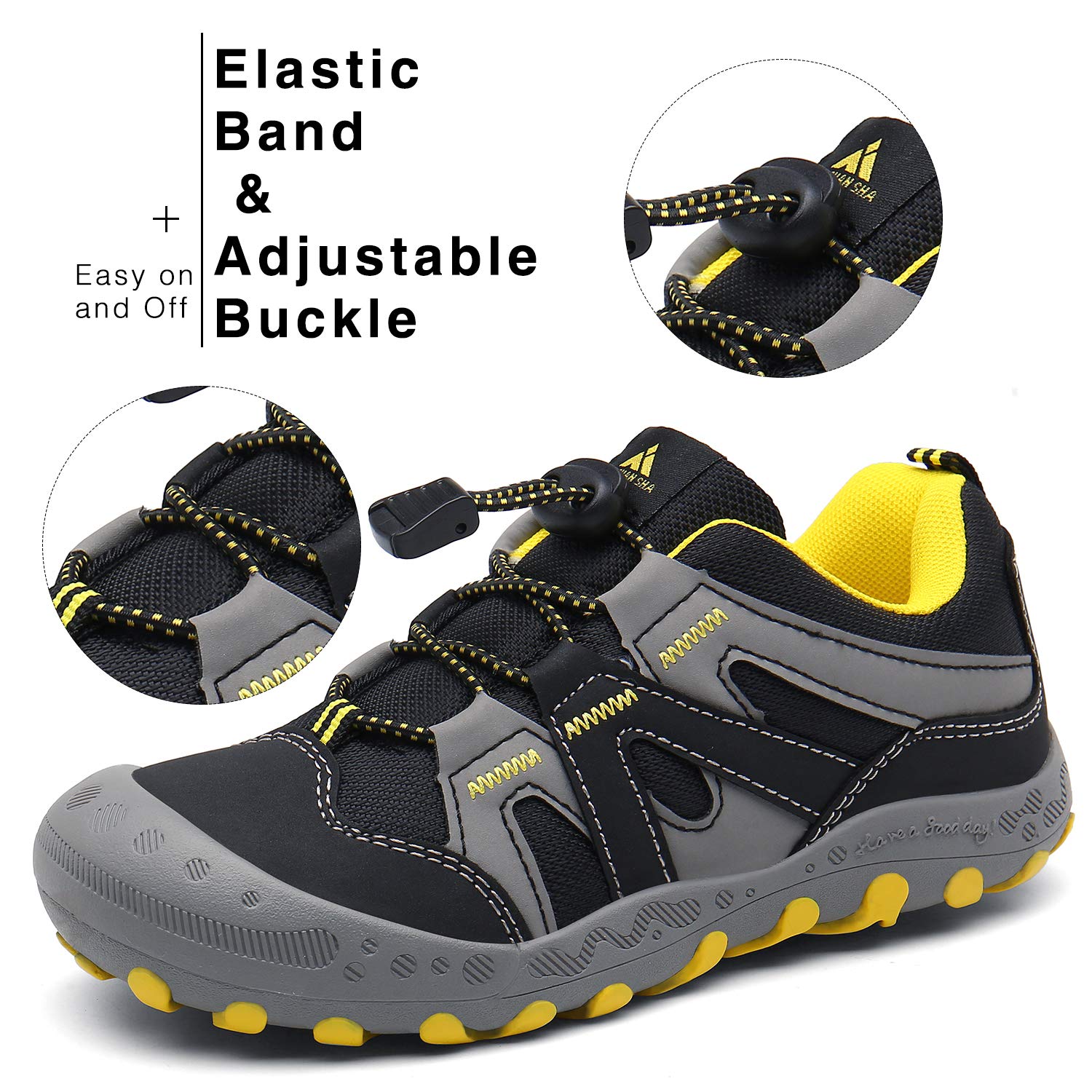 Adjustable Closure: Toddler hiking shoes are featuring adjustable buckle closure make it easy for kids to put on or take off by themselves and keeps the kids hiking sneakers snugly in place during activities