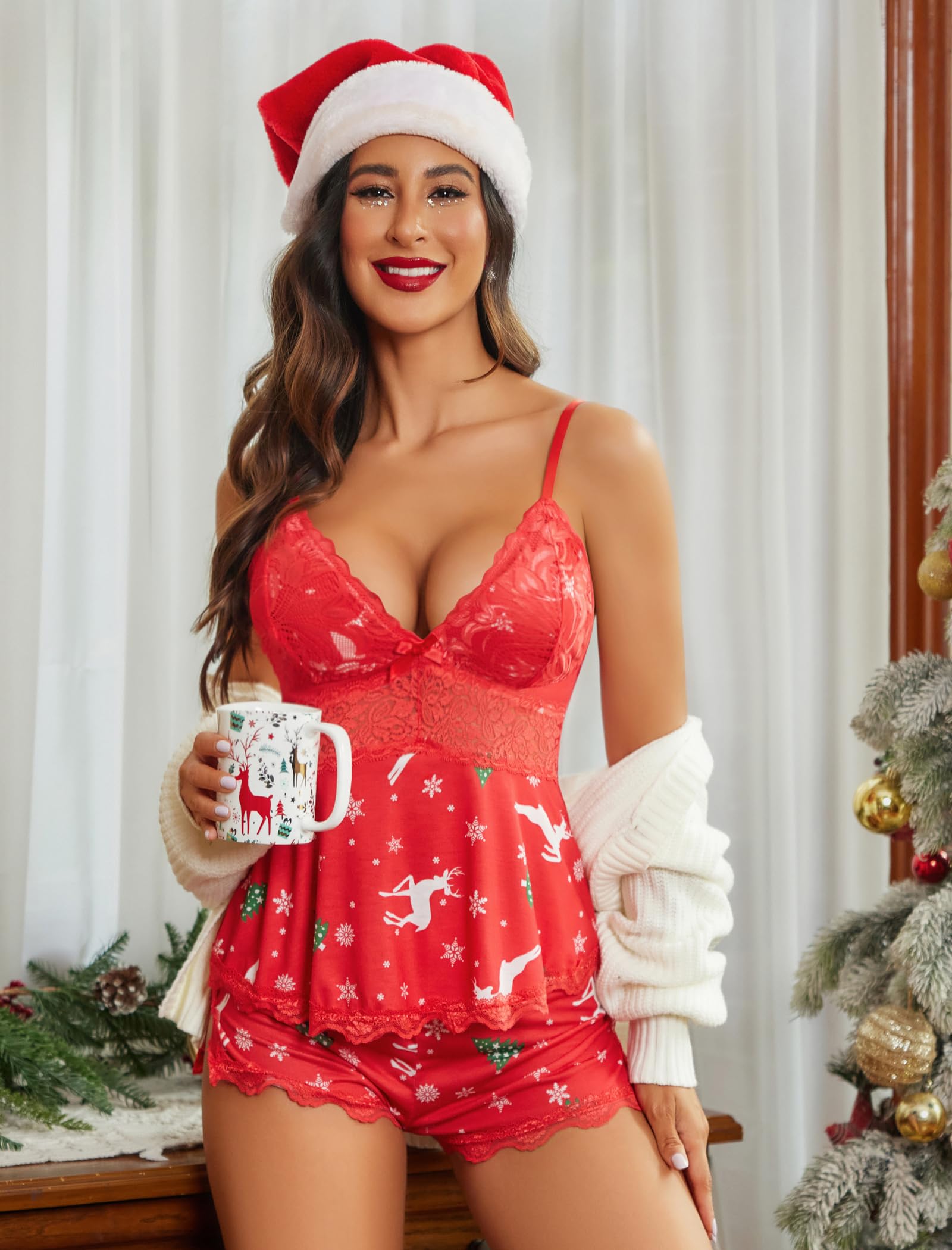 Avidlove short pajamas camisole Set featuring lace cups patchwork, adjustable spaghetti straps, drawstring waist. Very cute. Its casual style makes it not awkward even when kids at home or guest visits. The Pajamas Set is comfortable for your life