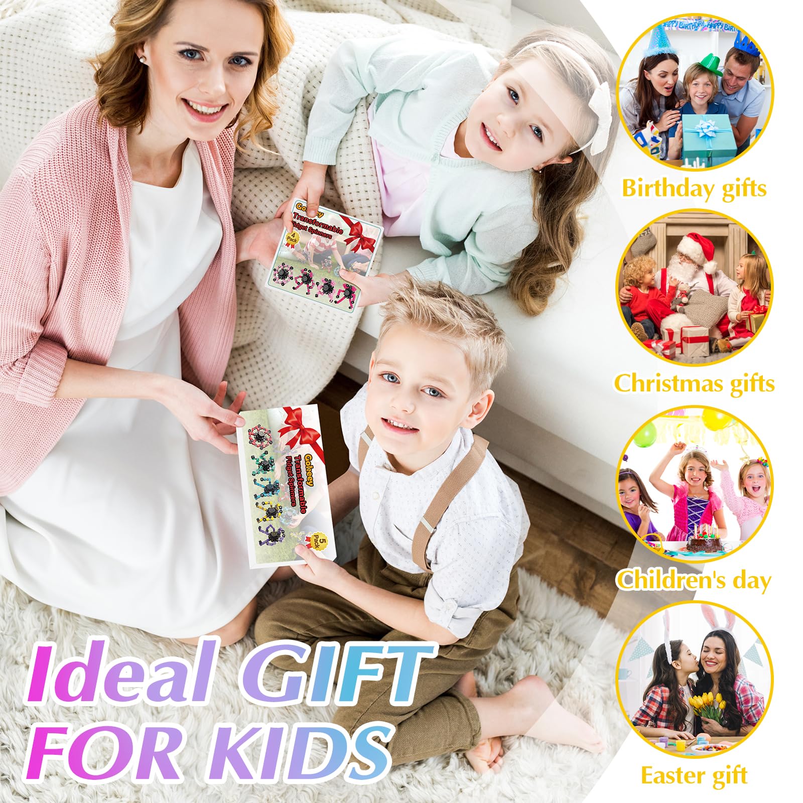 5 colors (red yellow blue purple green) fidget spinners included. Each of them has a a high speed bearing in the center to ensure the smoothest rotation and consistency. 6 deformable chains around the spinner to increase centripetal force and spinning time. So these finger spinners can spin for several minutes. Each fidget toys has six deformable chains. Each of the links can pivot and lock into 5 positions, you can create any shapes you want, such as various shapes of spinners, robots and even mobile phone holders. It can also exercise your kid’s hands-on ability, hand-eye coordination and logical thinking ability by changing the shape of the toys. It can effectively reduce stress, anxiety and can increase focus and attention by spin the fidget spinners or change the toys’ shape. This is very helpful for children with energetic, obsessive-compulsive disorder, ADHD, autism and adults with high stress and anxiety. Such a creative sensory toy is very suitable as birthday gift, party bag fillers, party supplies, party favor, Christmas gifts, wonderful incentives classroom prizes ect. These toys are small and can be put in your pocket. Whether you are in the office, school, or on the bus or airplane, you can have fun with these toys anytime, anywhere. The four-pack design also allows you to share your happiness with your family, friends and classmates.