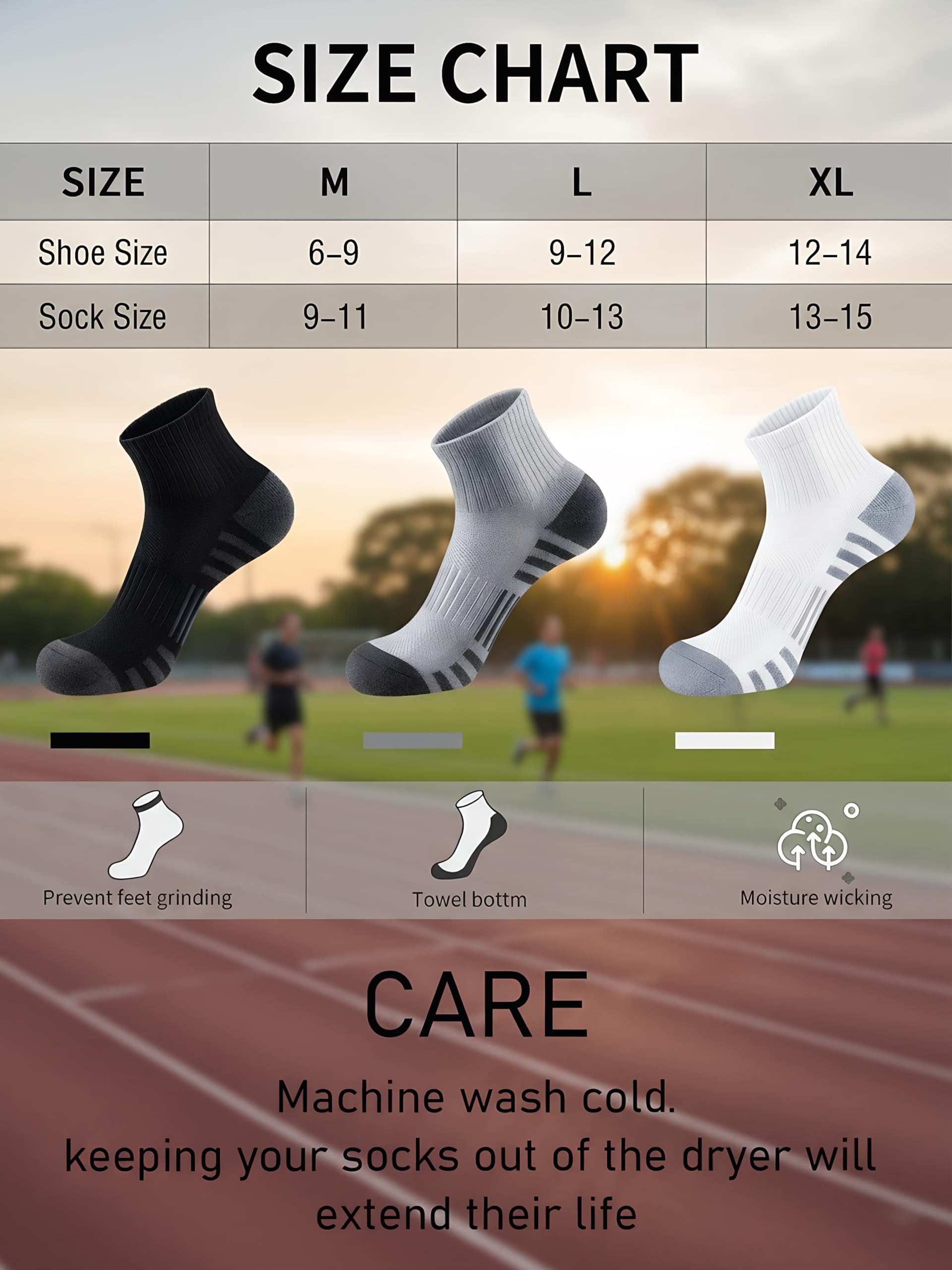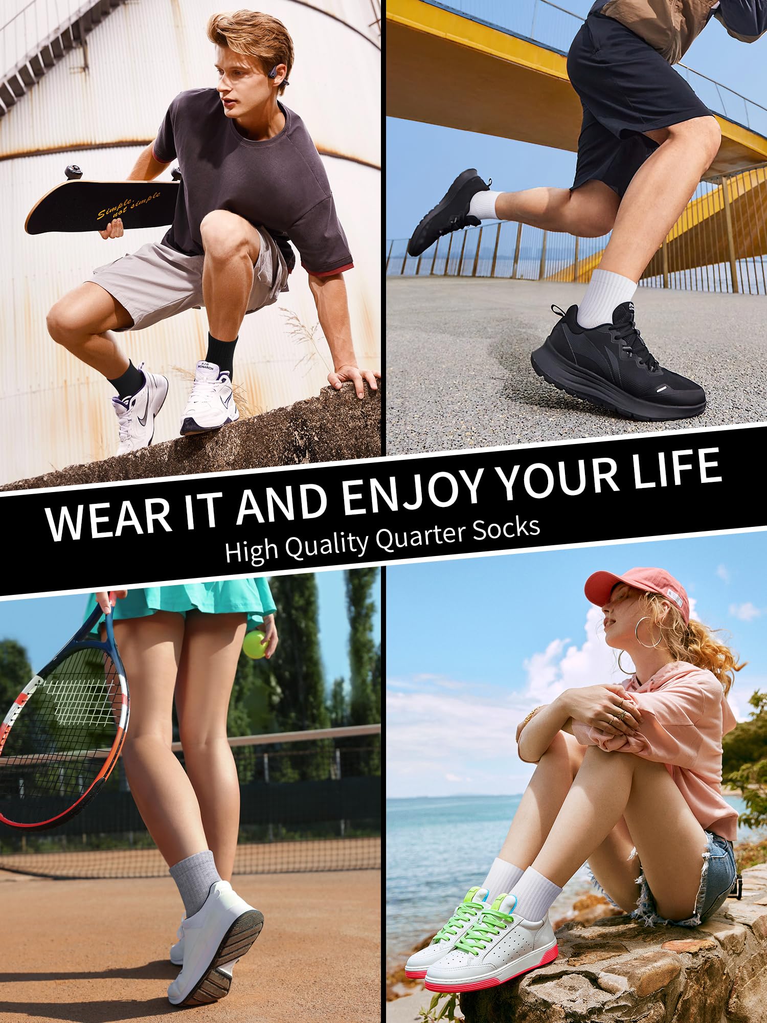 Description Airacker Men&Women Unisex High Quality Quarter socks For Running, Walking, Tennis, Golf,Climbing, Cycling,Yoga, Exercise and other sports activities, also suitable for casual or home daily wear FEATURES: -【Features】-Mesh Zones for Breathability + Versatile+ Moisture Wicking + Max Cushioning + Reinforced heel and toe +Arch Support + Well Made Cuff + High Stretch + All Seasons-friendly. -【Fine Workmanship Athletic Socks】- High weaving precision makes socks much more durable soft. Cushioned toes and soles add extra stability and comfort, effectively reducing friction and injury caused by sports. The innovative screw elastic cuff design ensures that the socks remain securely positioned around the ankles without causing discomfort or excessive tightness.They are quick-drying,machine washable. -【Reinforced Heel and Toe】 - Reinforced heel and toe prevents holes and maximizes the life of the sock. -【Moisture Wicking】- Keeps your feet dry and breathable all day long without odor. -【No-Slip】 - The ankle socks are crafted from soft and stretchy material, conforming better to the shape of your foot and ensuring they stay in place all day. Our socks features a ribbed cuff design that ensures a comfortable fit and prevents slipping without feeling tight. SPECIFICATION: -Package: Includes 6 Pairs Socks. -Fabric: 87.5% Polyester, 12.5% Spandex. -Size:Suit for US Women&Men's Shoe Size 6-9/Sock Size 9-11 and Shoe Size 9-12/Sock Size10-13 and Shoe Size 12-14/Sock Size 13-15 WASHING INSTRUCTION: -Machine wash cold and tumble dry low. -Suggest using wash bag and air dry. -Do not iron, bleach or put socks in hot water or suds for long time.