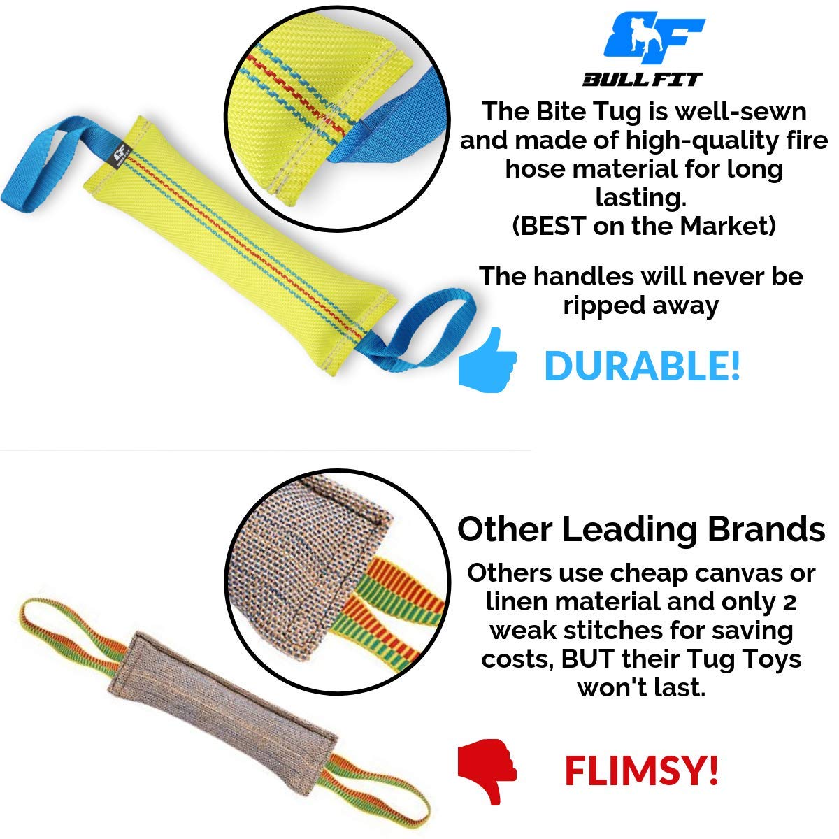 Our promise to you - If you’re tired of spending money on those cheaply made linen or jute tugs and dog ropes that get destroyed within a few hours, this tug is the ONE you’re looking for. Our tug is made of the highest quality fire hose material to ensure that your dog will never tear it when having fun.