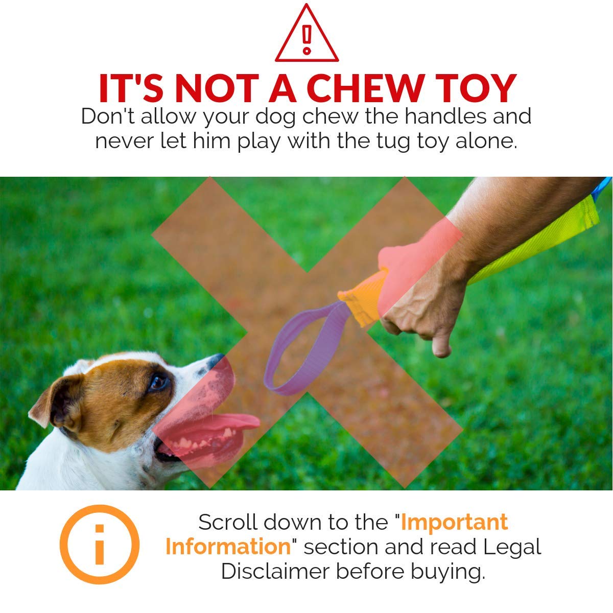 It's not a chew toy - This dog tug toy is built safe and tough but no toy is indestructible. It’s perfect training tool for medium to large breeds and big puppies, but NOT a chew toy. Don’t allow your doggie to keep the toy after interaction has finished and don’t let him bite the handles! However, it will hold up to the daily rigors of Police K-9, Military, Sport and other Working Dog use.
