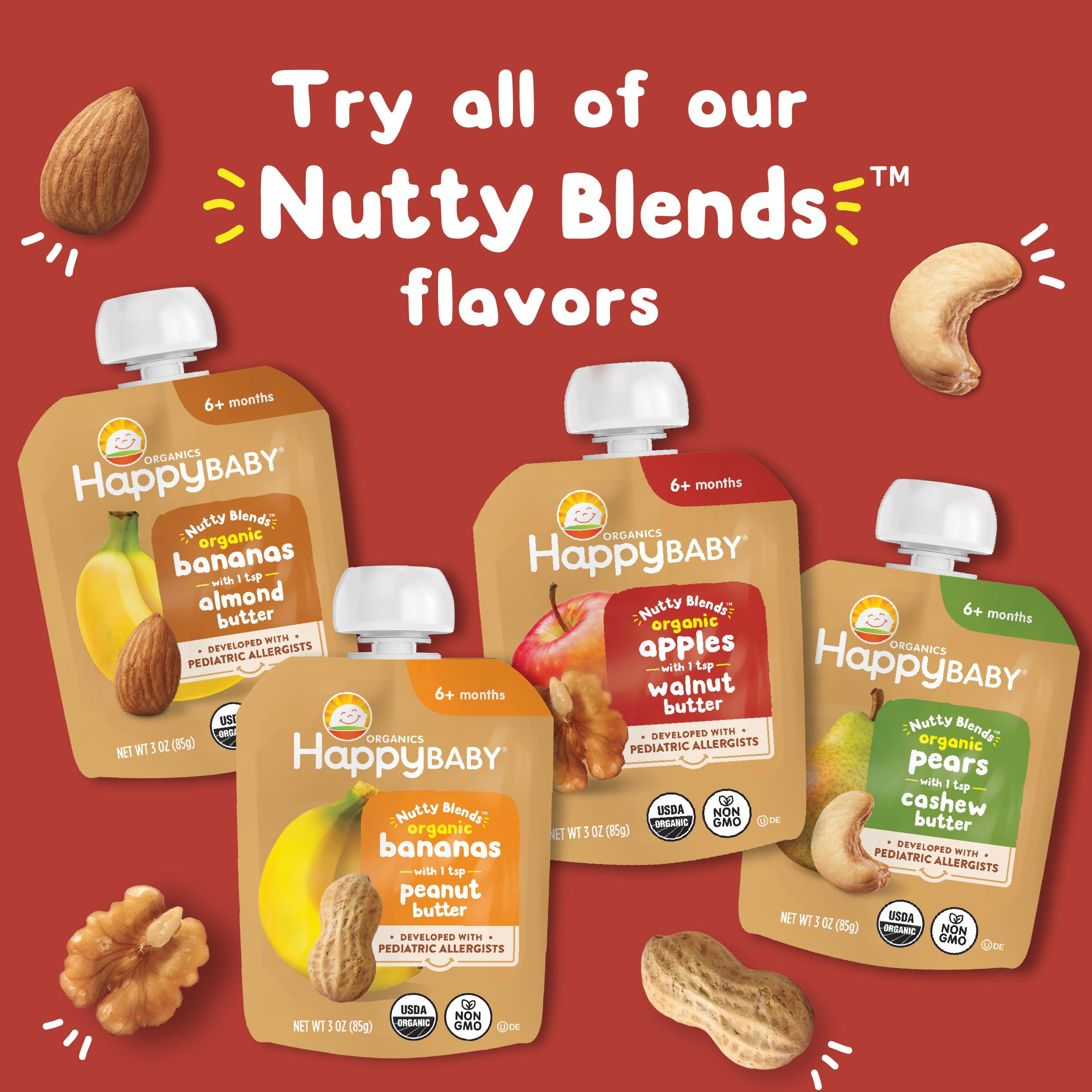 Happy Baby Nutty Blends pouches, developed with pediatric allergists, are designed to help you introduce tree nuts to your baby’s diet gradually and easily. These smooth purees, which combine familiar fruits with 1g of tree nut protein, make it easy for your baby to enjoy new flavors. These blends combine organic bananas with 1 teaspoon of almond butter and peanut butter, organic apples with 1 teaspoon of walnut butter, and organic pears with 1 teaspoon of cashew butter in a smooth, baby-appropriate texture. Always consult your pediatrician before introducing allergens to your baby. Nutty Blends pouches are produced in a facility separate from Happy Baby Organics nut-free pouches. All Happy Baby products are certified USDA organic, made with ingredients that are non-GMO and grown without the use of toxic persistent pesticides.