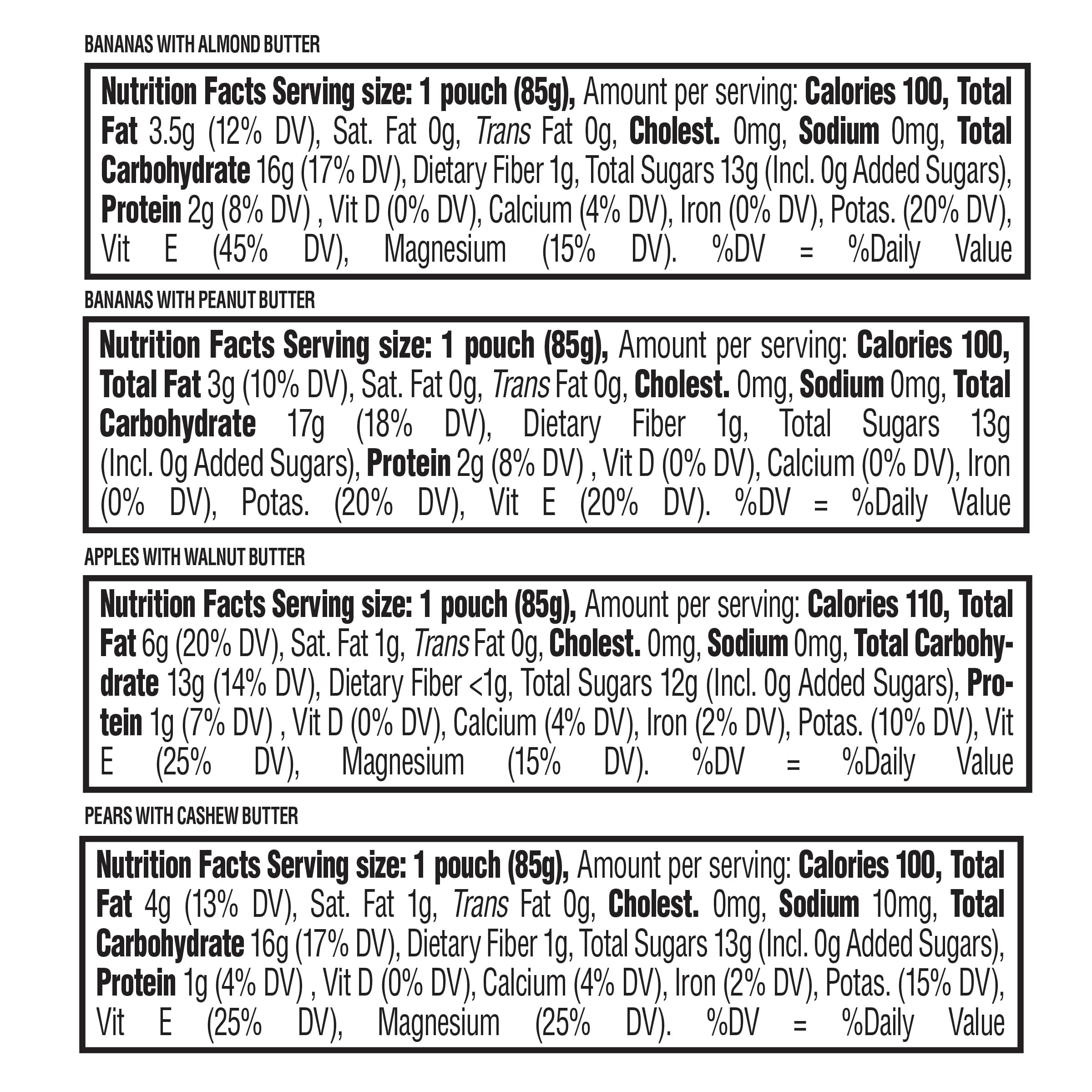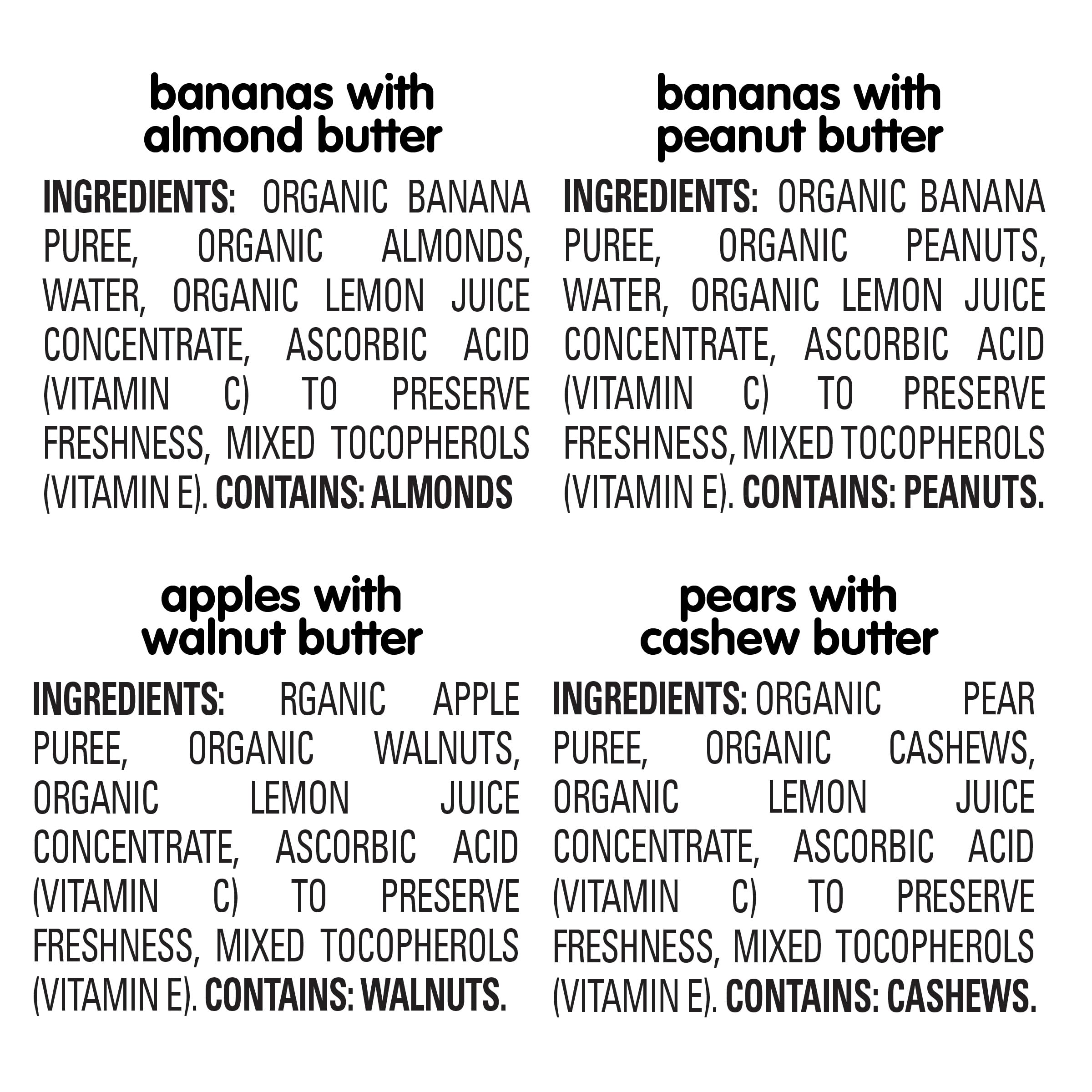 Baby-Appropriate Texture: Give baby their first taste of nut butters with these delicious twists on classic pairings of fruits & tree nuts, in a smooth texture that’s appropriate for baby. These convenient pouches make for a great snack