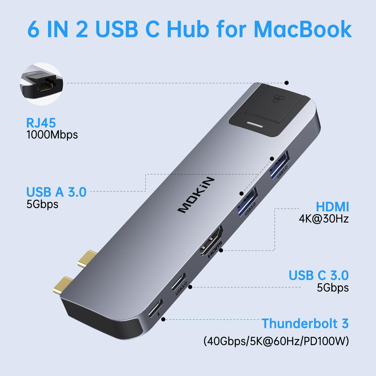 【 New 6 IN 2 USB C Adapter: Support MagSafe Charging】USB C Adapter HDMI Hub compatible with 13'' 14 ''15'' 16'' inch MacBook Pro/MacBook Air 2023 2022 2021 2020/2019/2018/2017/2016.Multiport MacBook Adapter expand your MacBook into 1 HDMI port(4K@30Hz), 1 Thunderbolt 3 port, 1 Gigabit Ethernet Port( up to 1000Mb/s), 2 USB-A 3.0 ports ,1 USB-C data port.