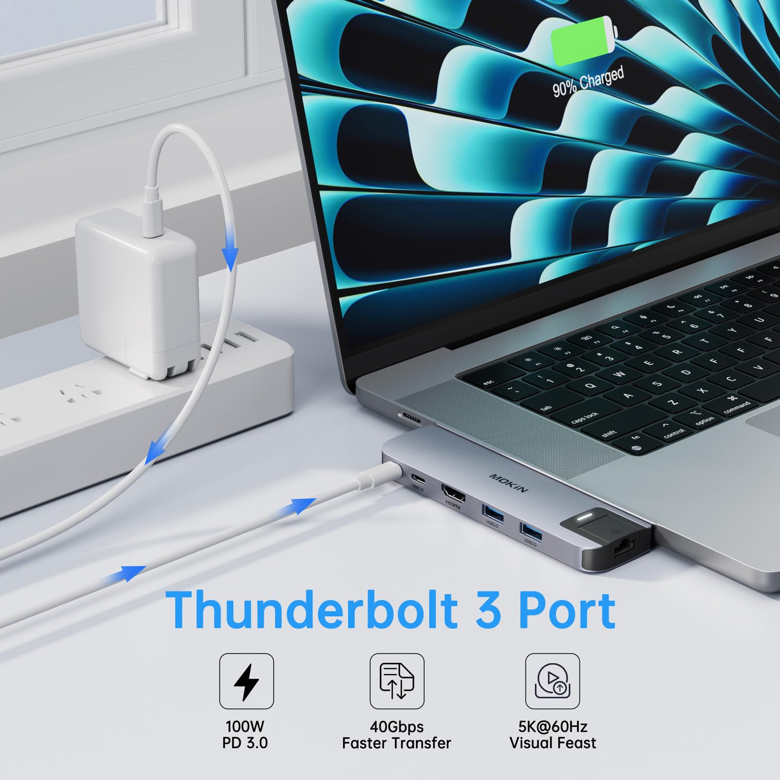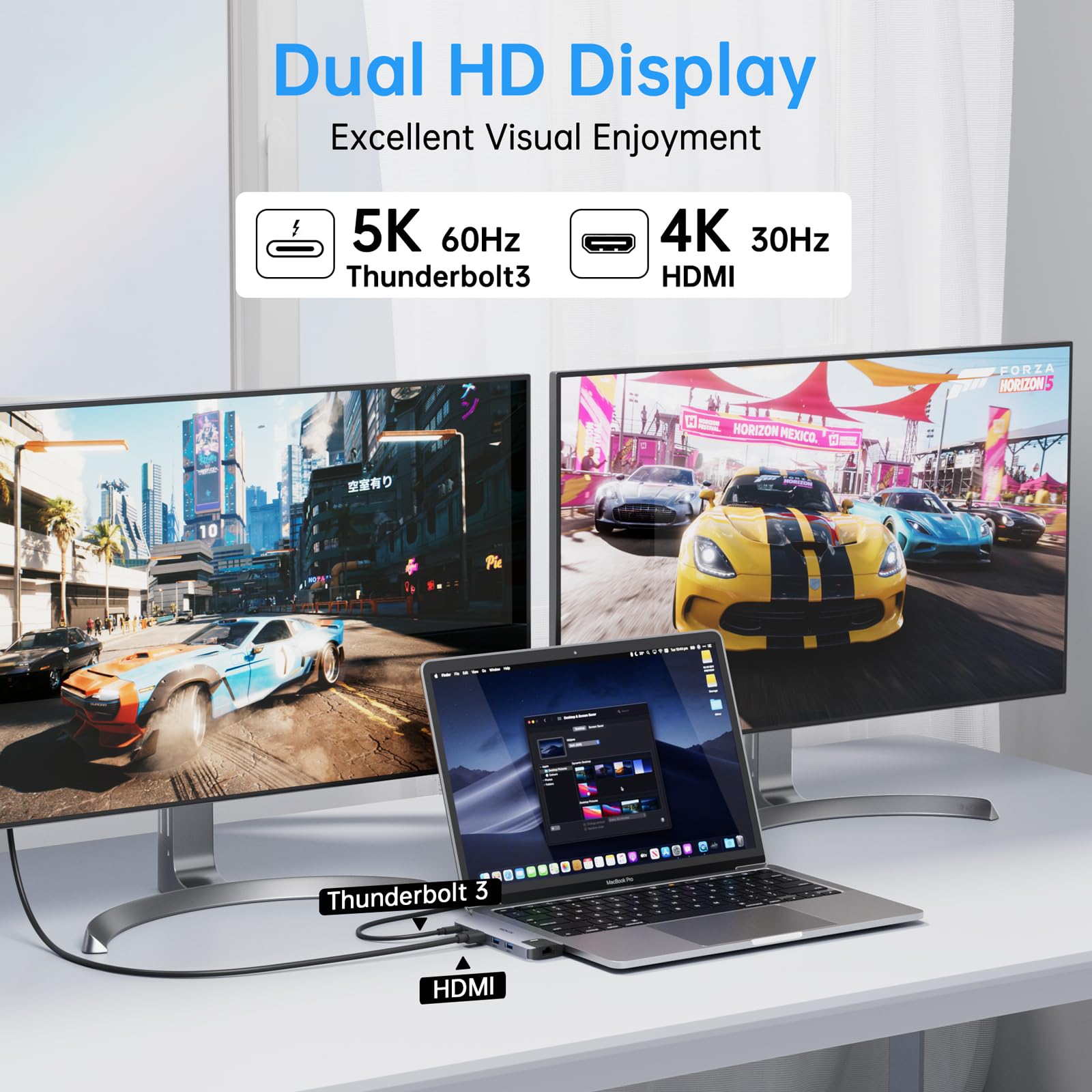 【Multi-Function Thunderbolt 3】USB C Adapter HDMI Hub with thunderbolt 3(Same as your macbook pro original thunderbolt 3) supports data transfer up to 40Gb/s, up to 5K@60Hz displays, up to 100W power.