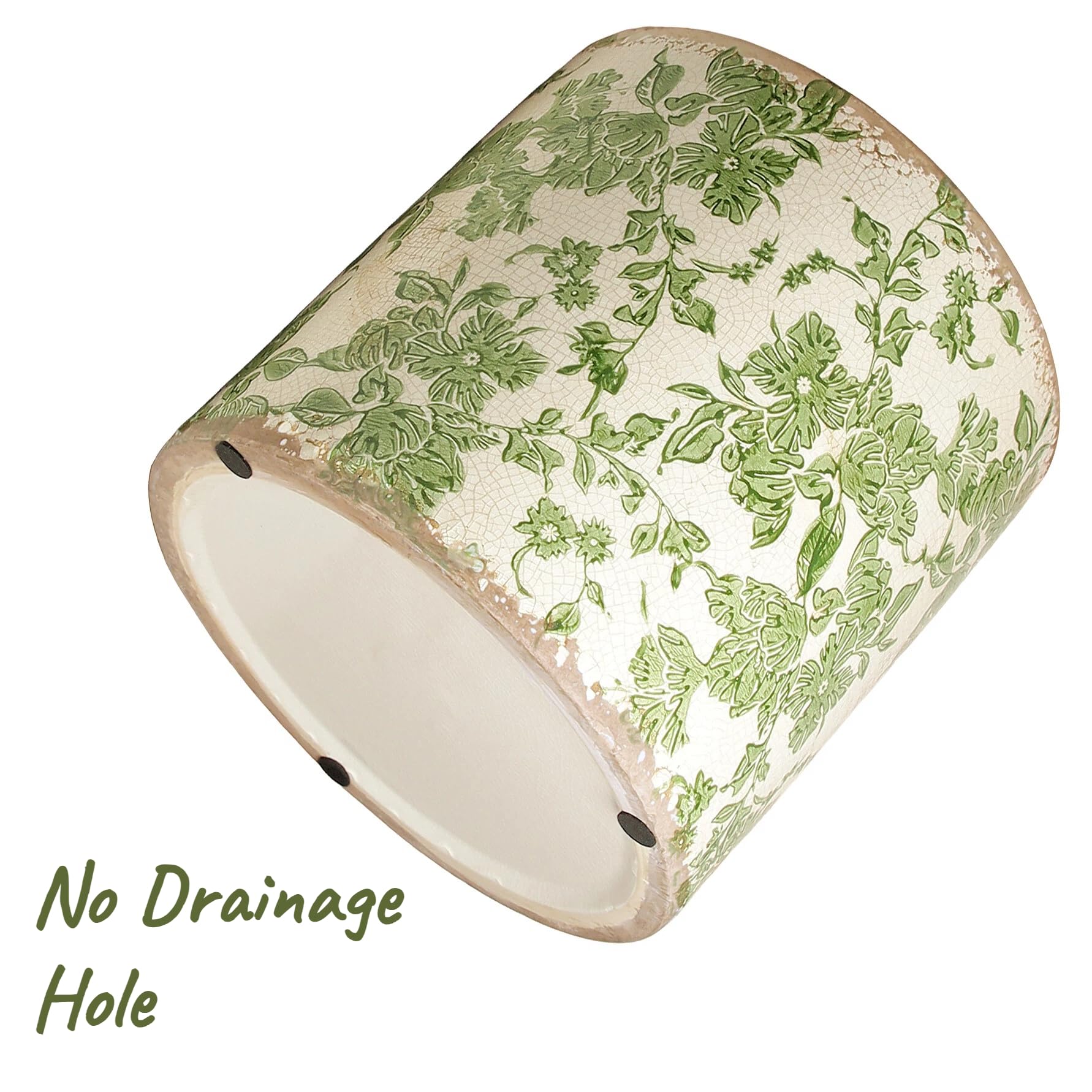 GREEN FLORAL VINTAGE LOOK: Lush green botanical pattern with a subtle crackle finish and lightly distressed rim brings a Vintage farmhouse, French Country vibe; beautiful as plant pots, flower pots, and planters.