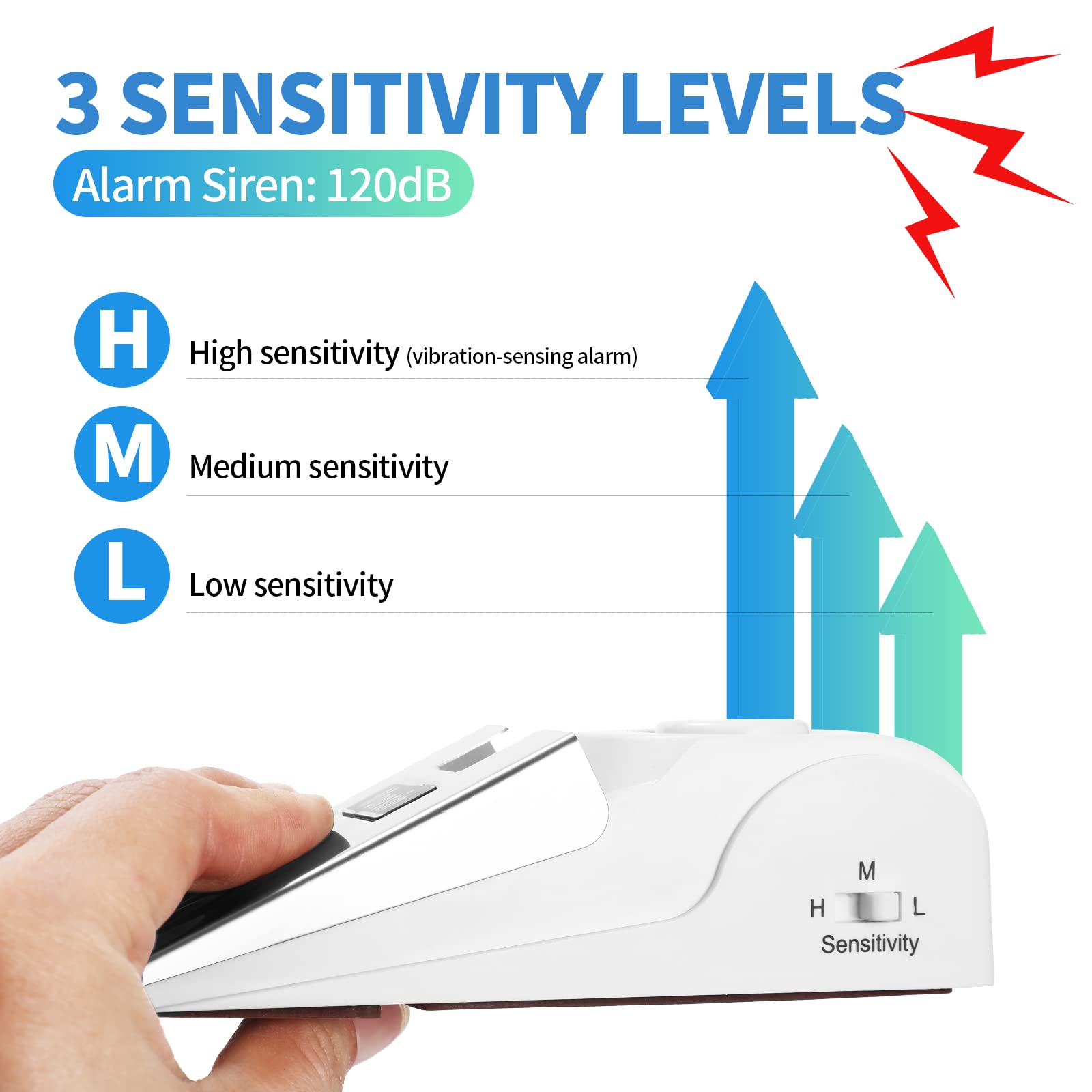 [3 Level of Sensitivities]: Hige-Midium- Low Sensitivities. Which depends on the distance door touch the door stop alarm.