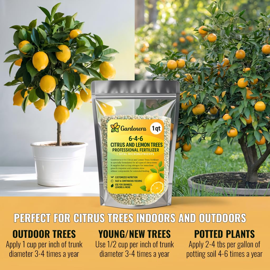 Unlock vibrant citrus growth and juicy harvests with Gardenera Citrus Fertilizer + Vital Micronutrients—a premium solution specially crafted for lemon, lime, orange, grapefruit, and avocado trees. Whether you’re caring for indoor citrus plants or cultivating a backyard orchard, this fertilizer delivers the complete nourishment your trees need for lush foliage, abundant blossoms, and flavorful fruits. Formulated with a balanced 6-4-6 NPK ratio, Gardenera provides the essential macronutrients—nitrogen, phosphorus, and potassium—needed to support strong roots, vigorous growth, and productive flowering. But we don’t stop there. This formula is enriched with vital micronutrients like magnesium, iron, zinc, boron, and copper, which are crucial for chlorophyll production, nutrient absorption, and overall plant resilience. Your citrus trees will not only grow—they’ll thrive with vibrant leaves and fragrant, flavorful fruit. Our slow-release granules ensure your plants receive a steady supply of nutrients over time, reducing the need for frequent reapplication. With each watering, nutrients are gradually released, delivering consistent, long-lasting nourishment. This makes it a perfect choice for gardeners who want results without constant upkeep. Designed for both indoor and outdoor use, Gardenera is safe when used as directed and works beautifully in potted citrus trees, raised garden beds, or larger orchards. The fertilizer comes in a resealable stand-up pouch, keeping the product fresh and easy to store. Plus, it’s proudly made in the USA, ensuring high-quality standards and dependable performance with every application. Gardenera Citrus Fertilizer is trusted by home growers and professional gardeners alike. Its easy application—just measure, sprinkle, water, and enjoy—makes it ideal for both beginners and experts. Frequently chosen as an Amazon’s Choice product, it stands out as a top-rated citrus fertilizer thanks to its powerful results.