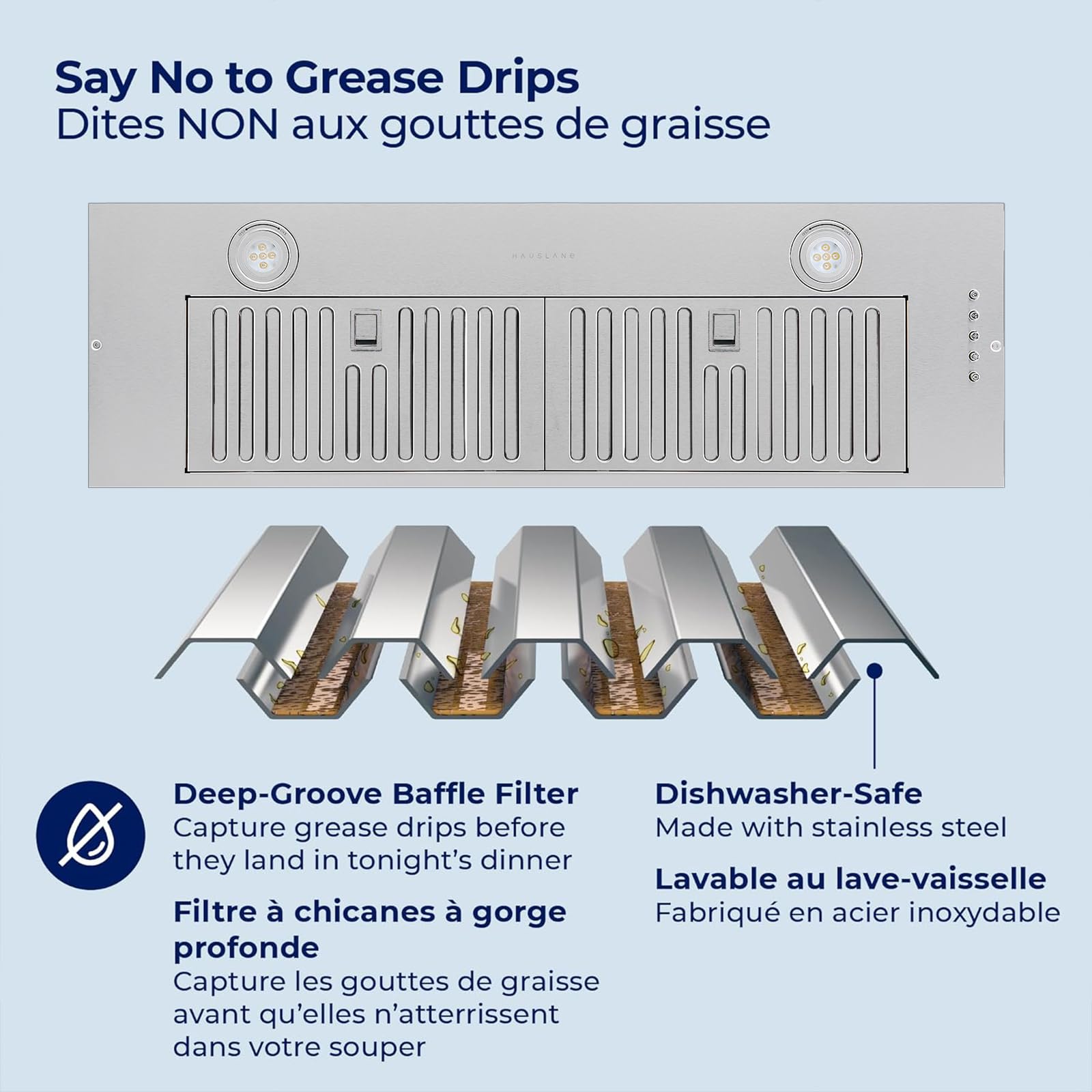 FILTERS CATCH GREASE BEFORE IT DRIPS: Don’t let grease particles stain and smell up your kitchen. The stainless steel baffle filters catch grease before they drip down on your cabinets, countertops, walls, and floors.