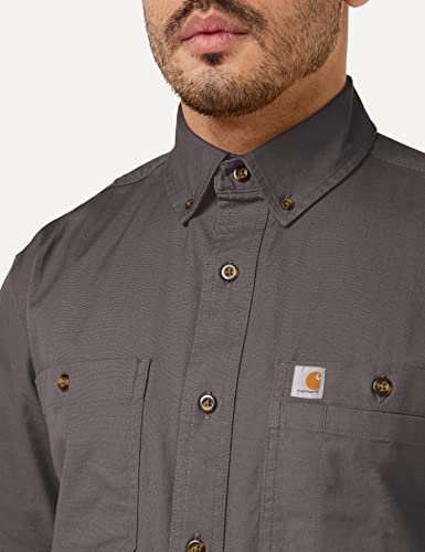 Description This durable short-sleeve work shirt comes standard with built-in stretch, so whatever you're doing, it's easier to do. Relaxed fit 6.5-Ounce, 98% cotton/2% Spandex rugged flex technology for ease of movement two chest pockets with additional left-chest pocket panel for added storage button-down collar two-button adjustable cuffs with extended plackets faux horn buttons drop-tail hem for additional coverage Carhartt-strong triple-stitched main seams imported