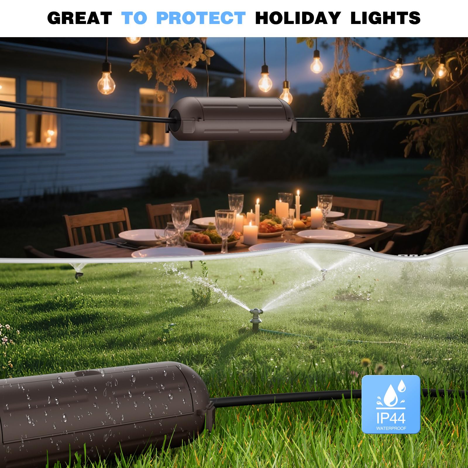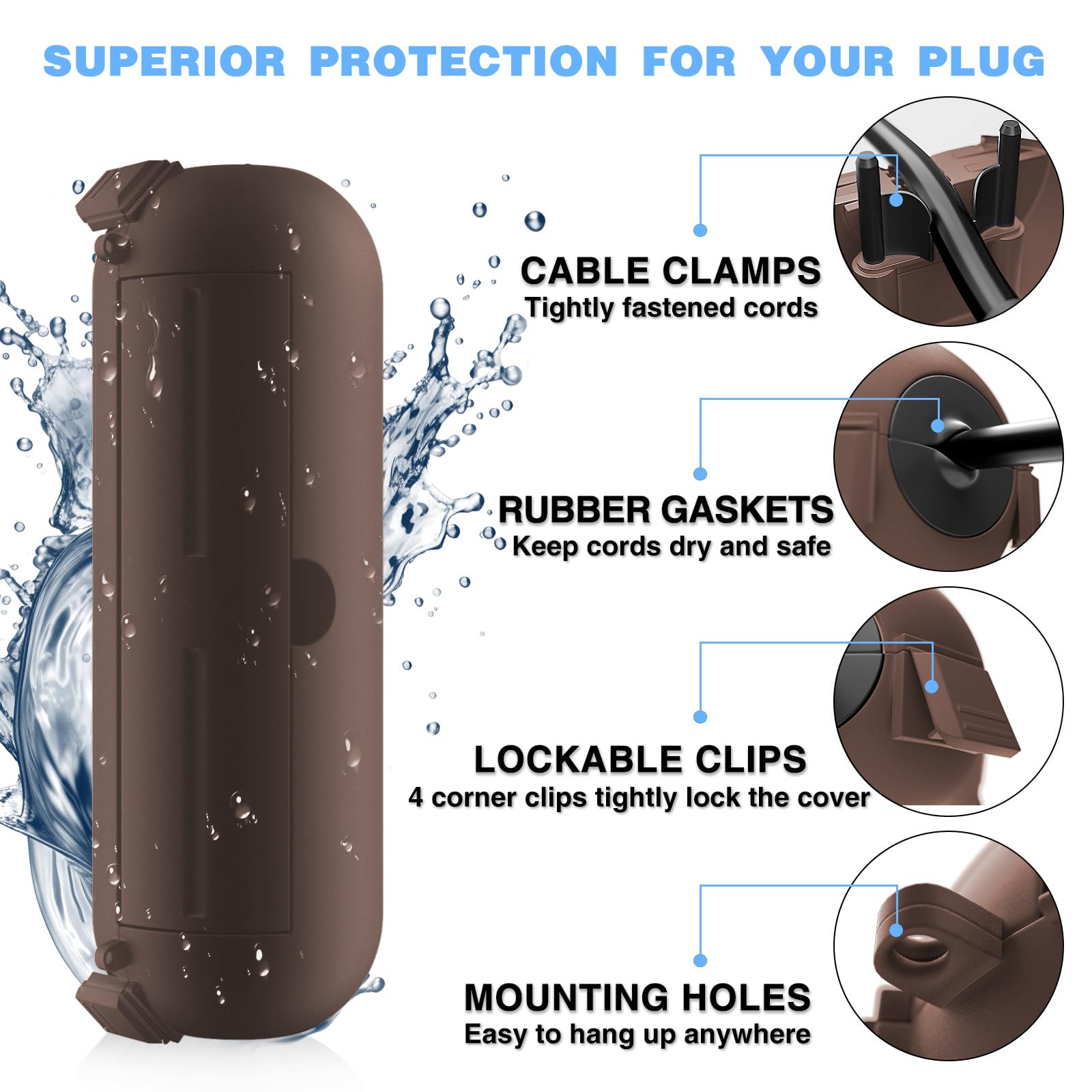 Compact size and light weight are great to protect outlet/plug/socket/connection hanging in the air. Made with heavy-duty reinforced PP material to withstand rain, snow, water, dust, dirt and more, continuously protecting outdoor connections from electrical hazard.