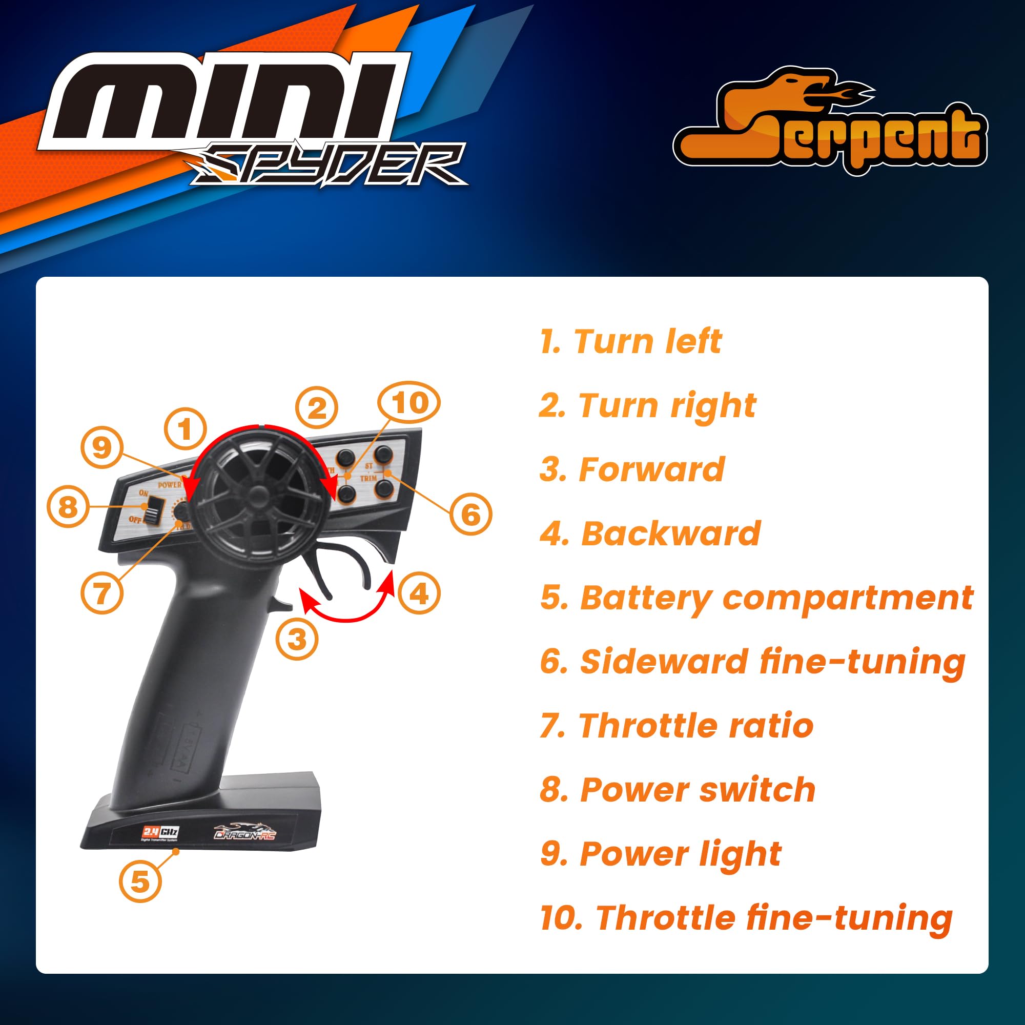 Mini Spyder Ready-to-race comes with complete kit, 1:24 Mini Spyder RTR buggy, 2.4GHz remote control, 300mAh lithium battery, USB charger, manual Full color owner's manual with information about the car and electronics including Exploded view of all simple parts. Comes with printed sheet with mini Spyder logo.