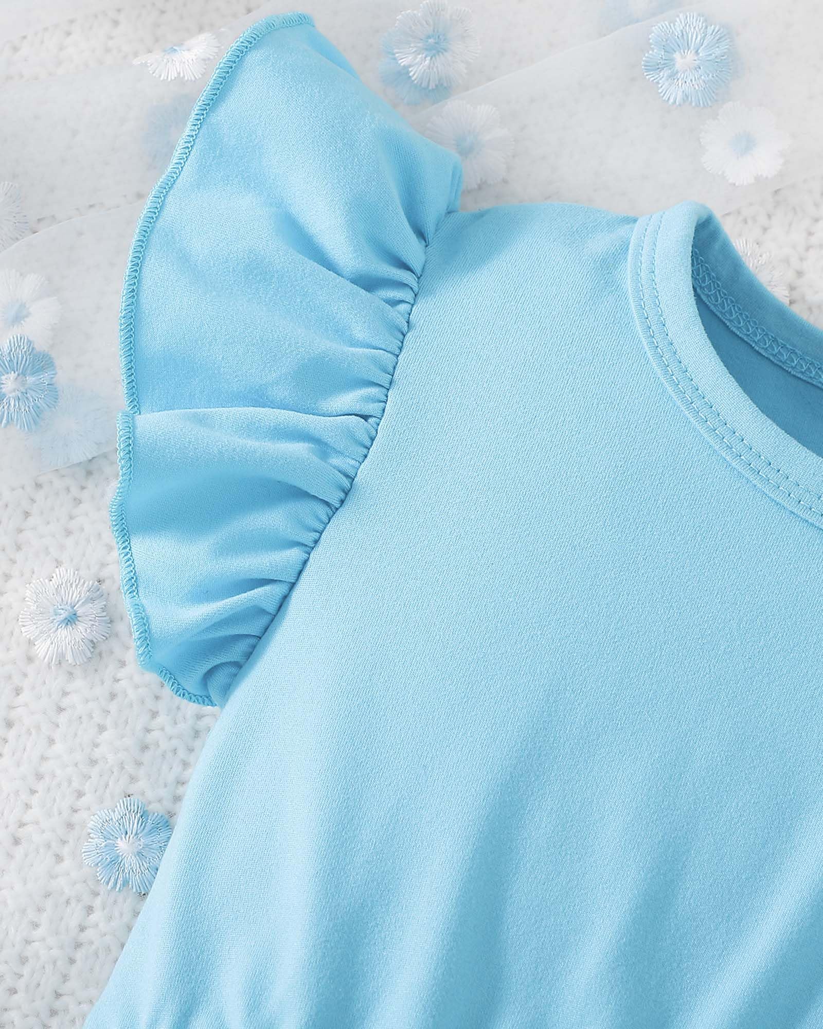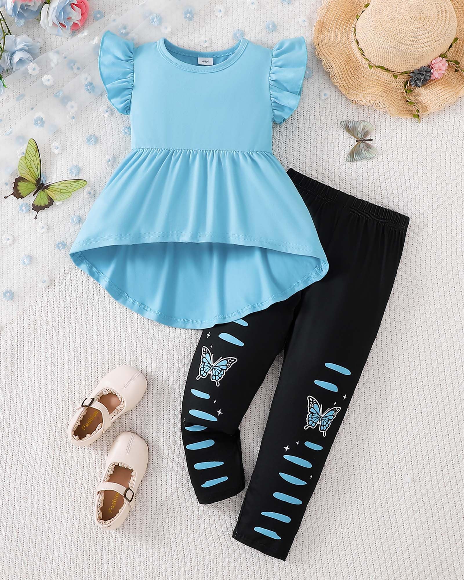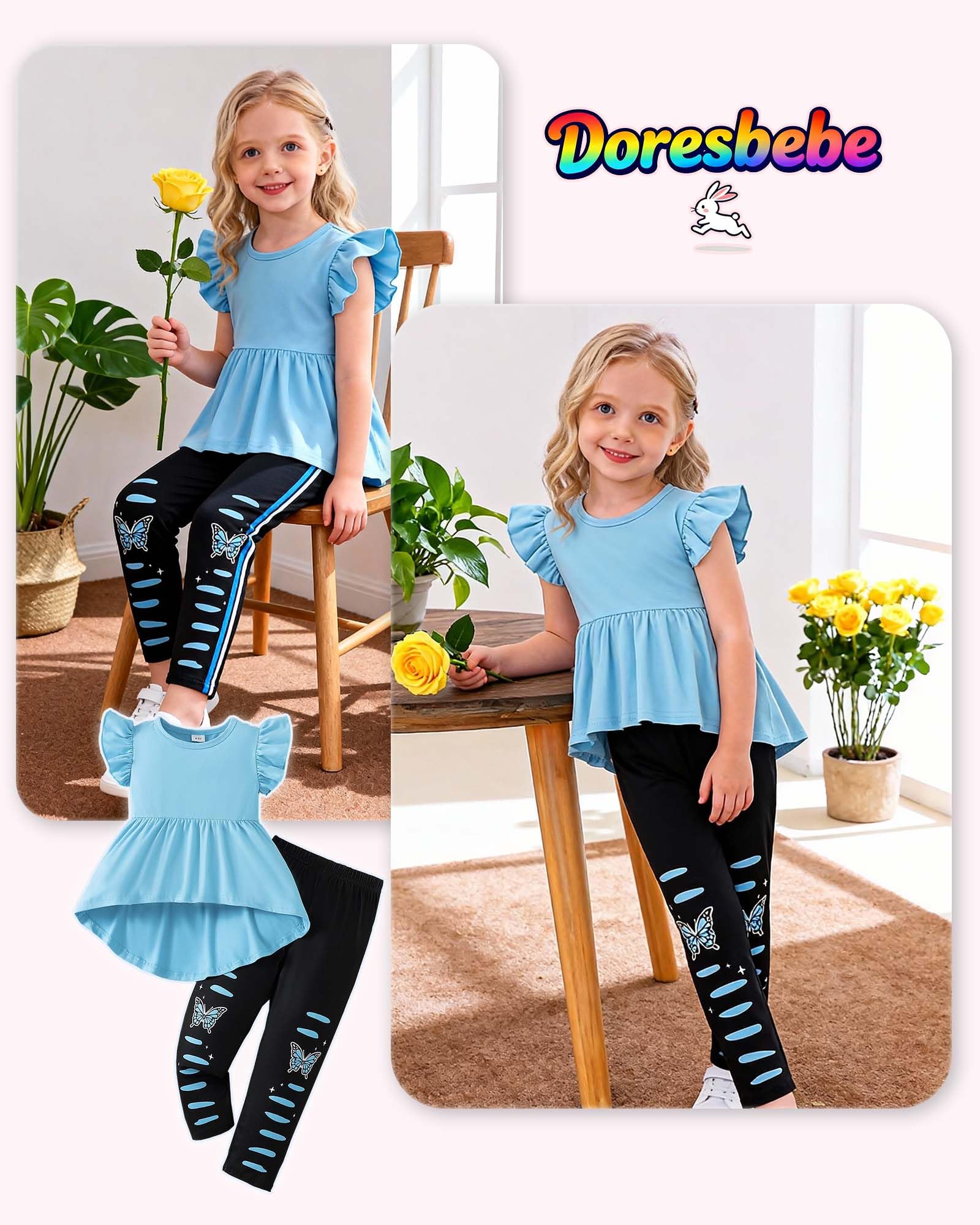 Stylish 2-Piece Outfits Design: This toddler set includes a ruffle sleeve shirt (with cute loose fit) and elastic waist pants, available in charming prints (floral, sunflower, butterfly) and vivid colors (pink, blue, yellow, rose-red).Irregular Skirt Hemline
