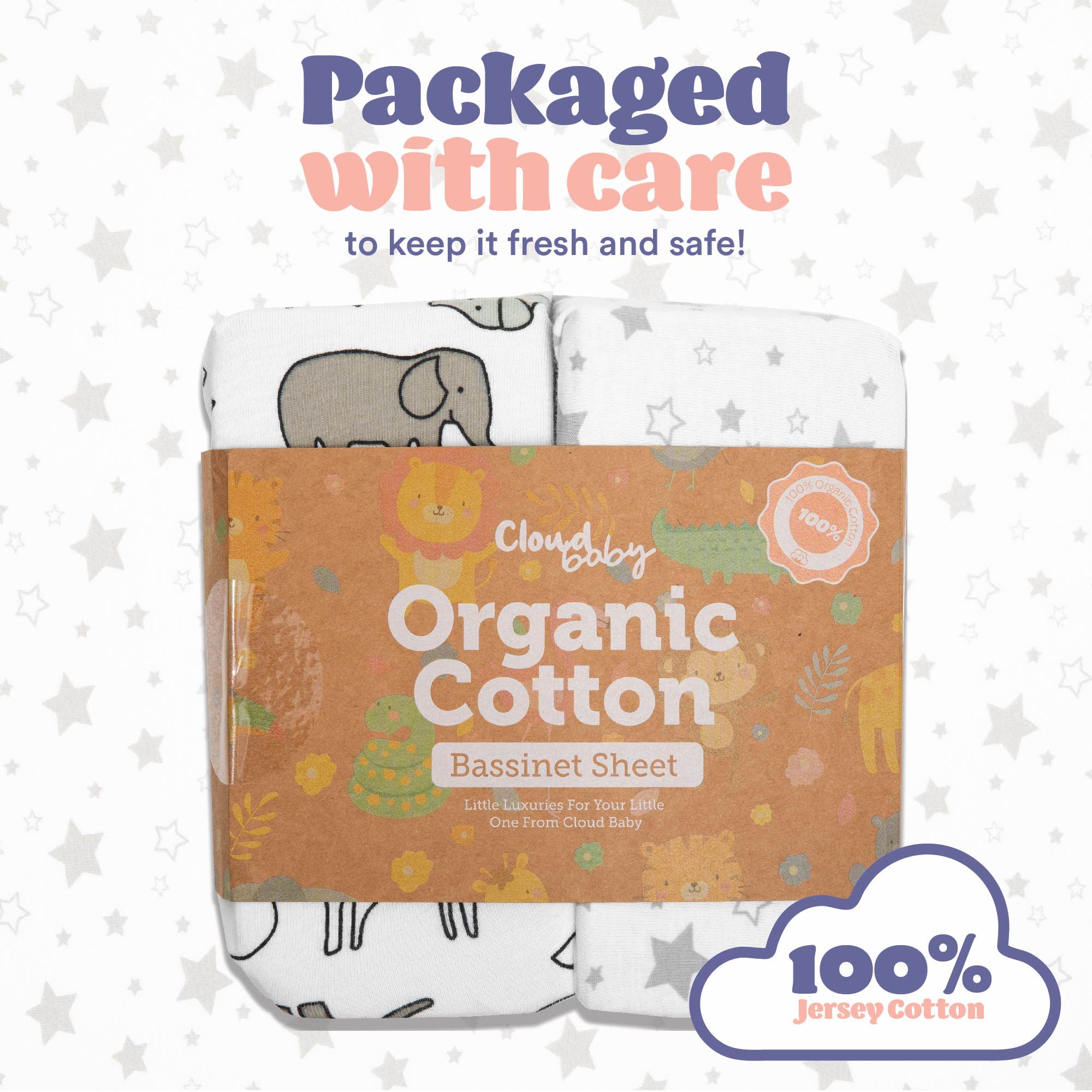Cloud Baby Bassinet Sheet 32"x16" (2 Pack) - 100% Organic Jersey Cotton, Breathable and Soft for Baby Boy Girl Newborn Infant Unisex (Zoo Animals and Stars)