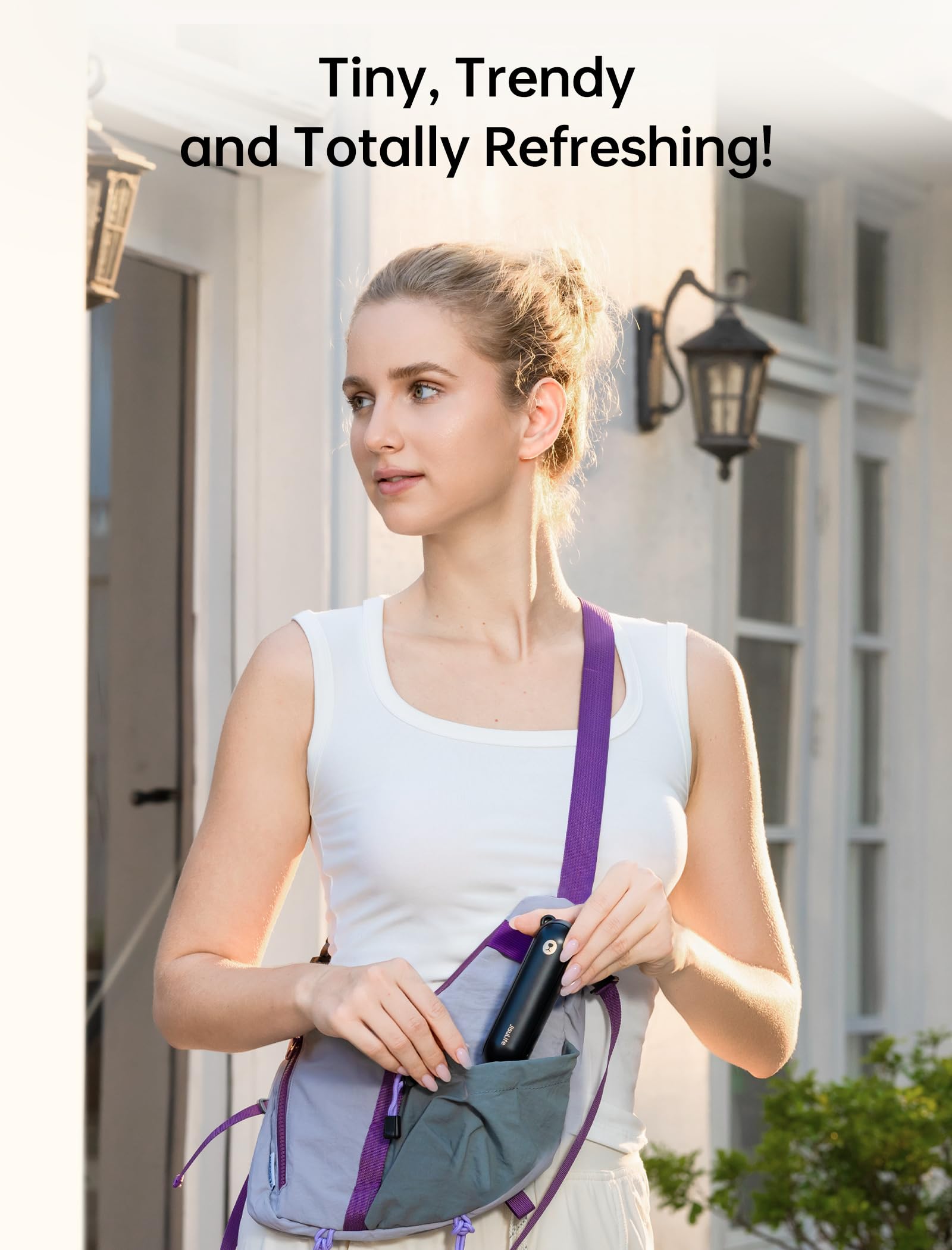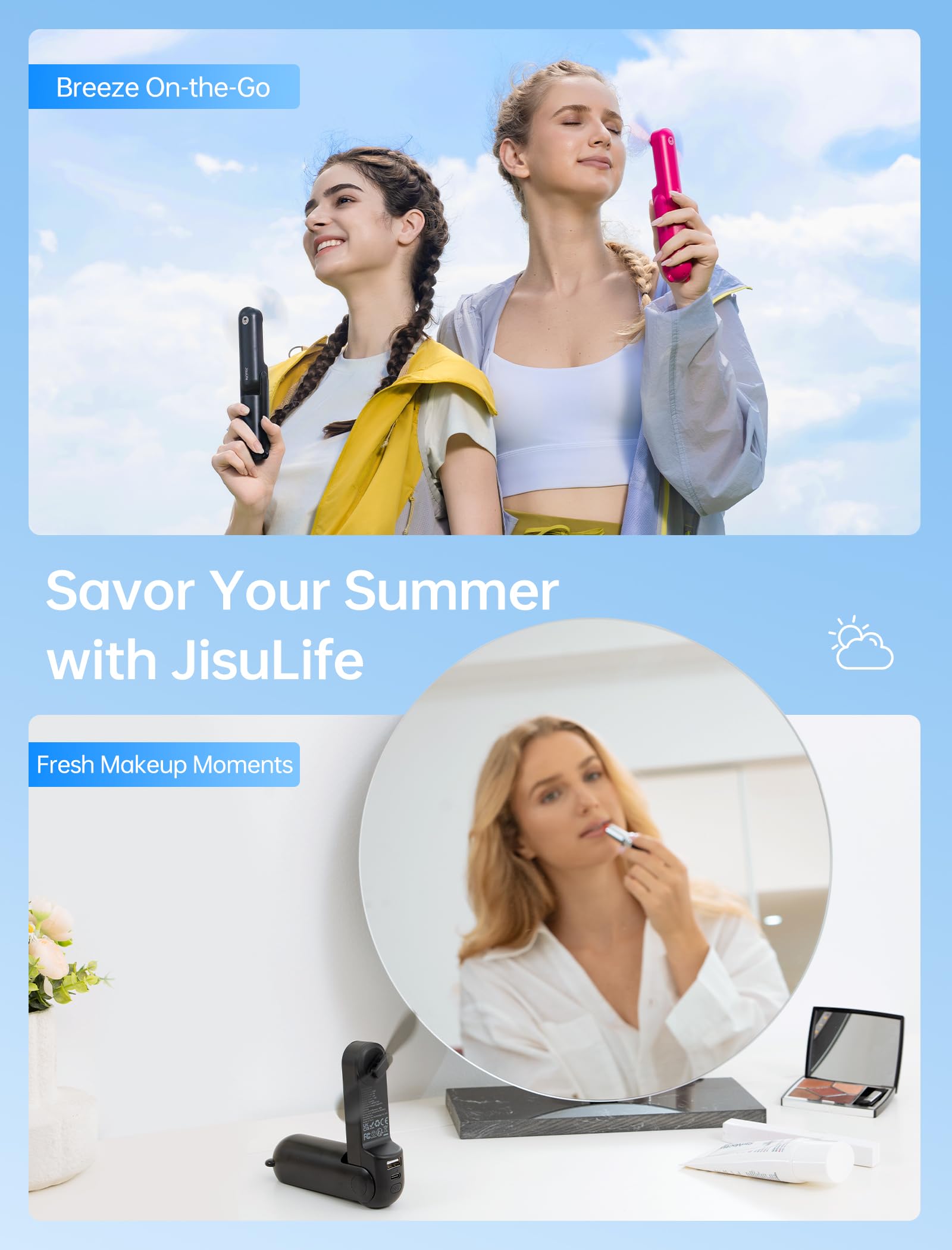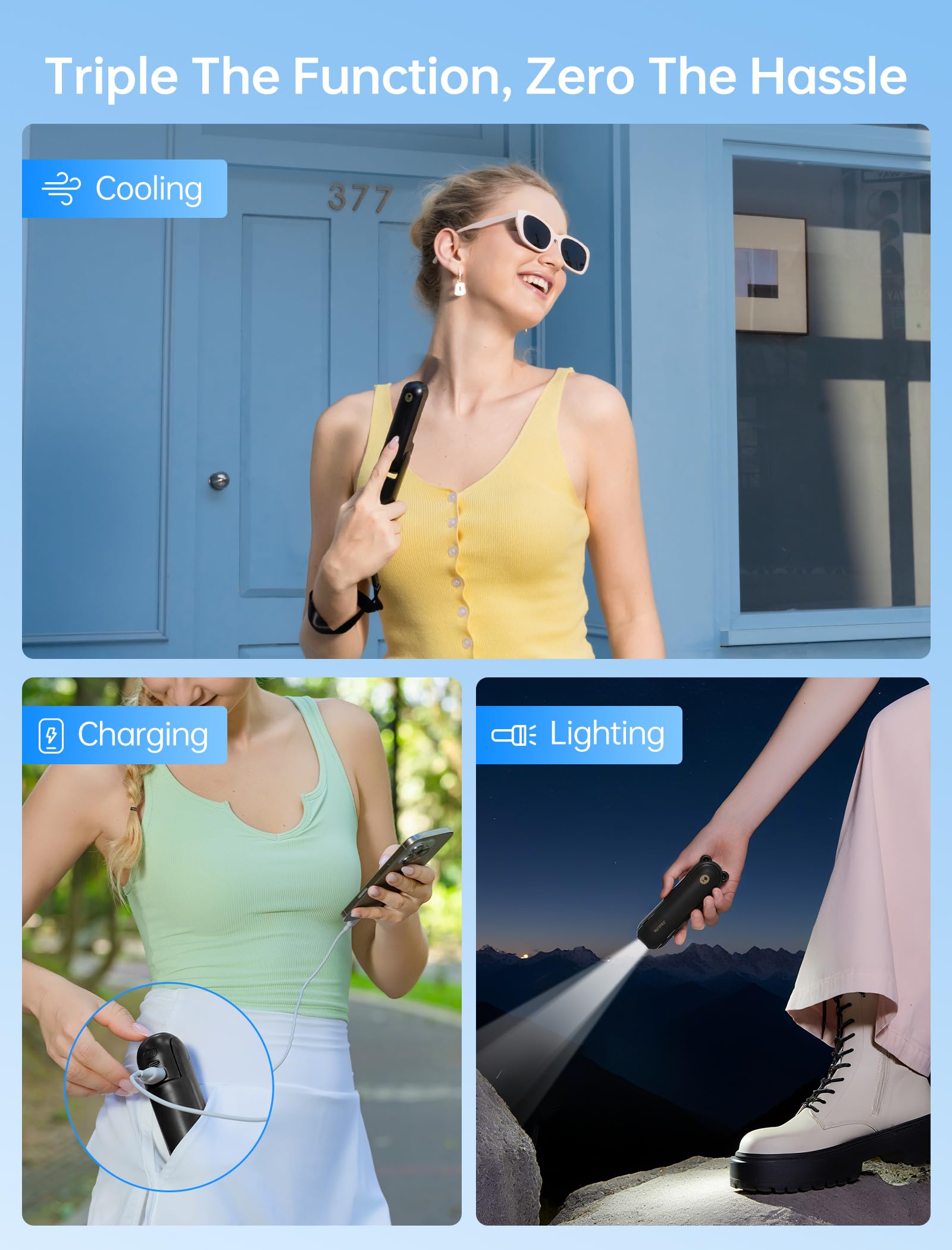 A Palm-sized Backup Charger: Designed with a pocket size, this portable fan easily fits into any bag for on-the-go convenience; Doubling as a backup power bank, it keeps your devices charged when needed, making it your travel and summer essentials