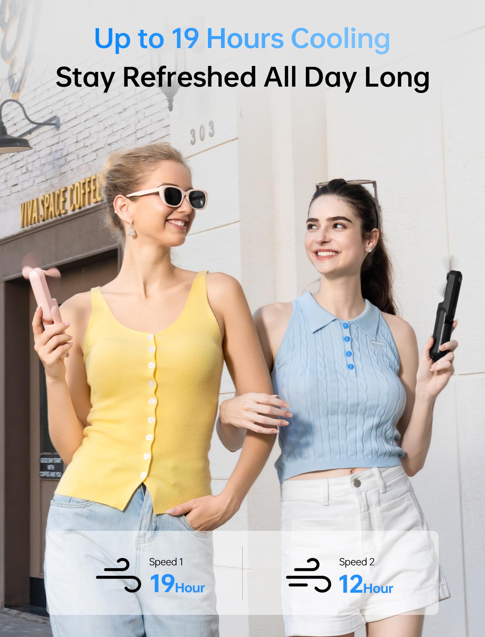 12-19 Hours Cooling Time: With up to 19 hours of cooling time on a single charge, this mini handheld fan ensures you stay refreshed during travel, concerts, and outdoor adventures; Conveniently rechargeable via USB