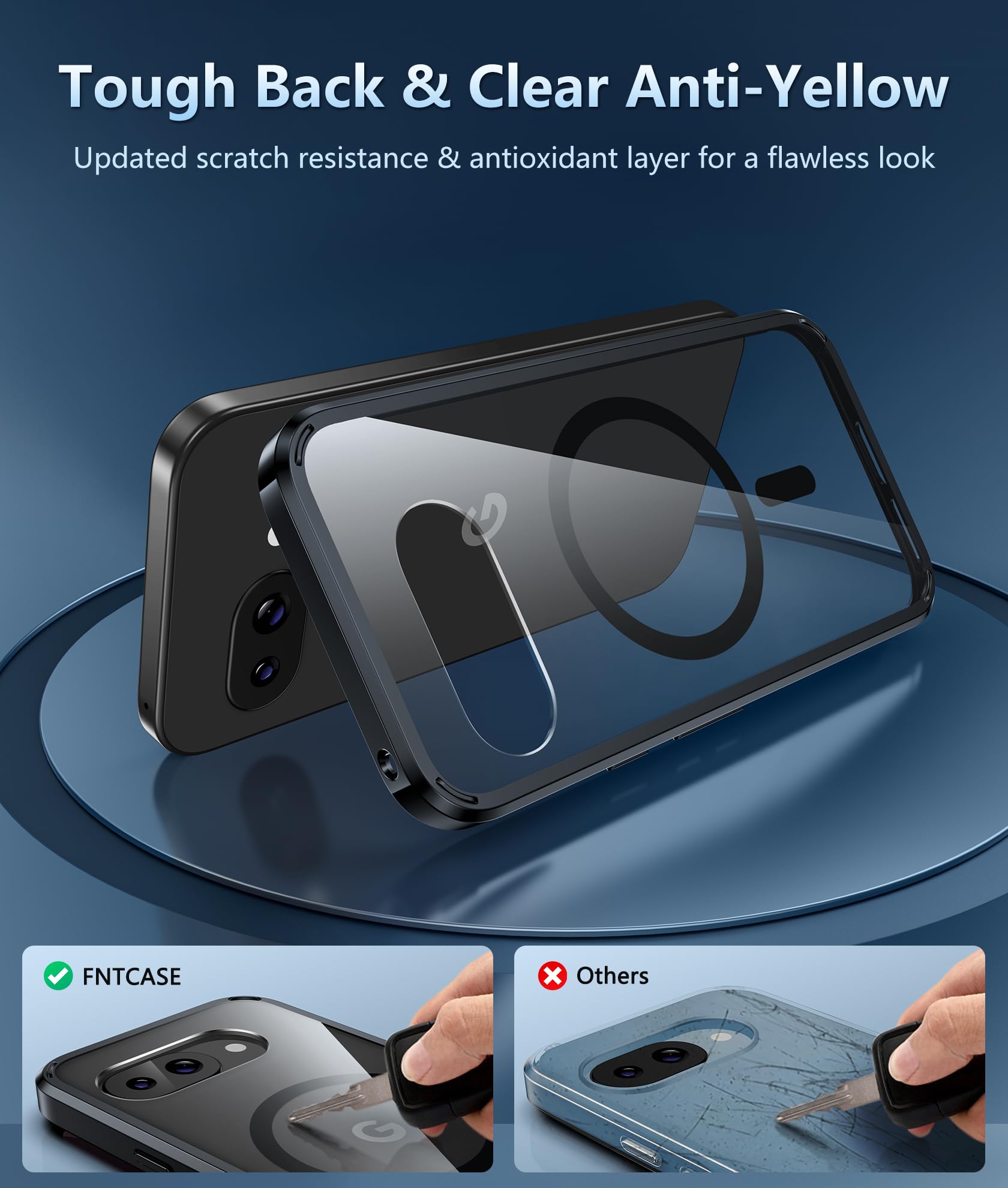 Crystal Clear & Never Yellow: Using high-grade Bayer's ultra-clear TPU and PC material, allowing you to admire the original sublime beauty for Google Pixel 9a while won't get oily when used. The Nano antioxidant layer effectively resists stains and sweat