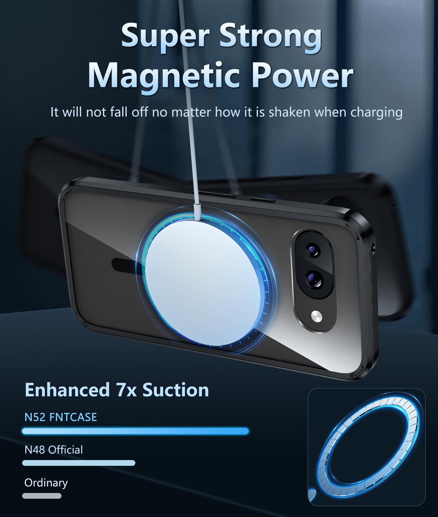 Strong Magnetic Attraction: Compatible for Magnetic chargers and other Qi Wireless chargers without signal influence. The Google Pixel 9a magnetic case has built-in 38 super N52 magnets. Its magnetic attraction reaches 2400 gf