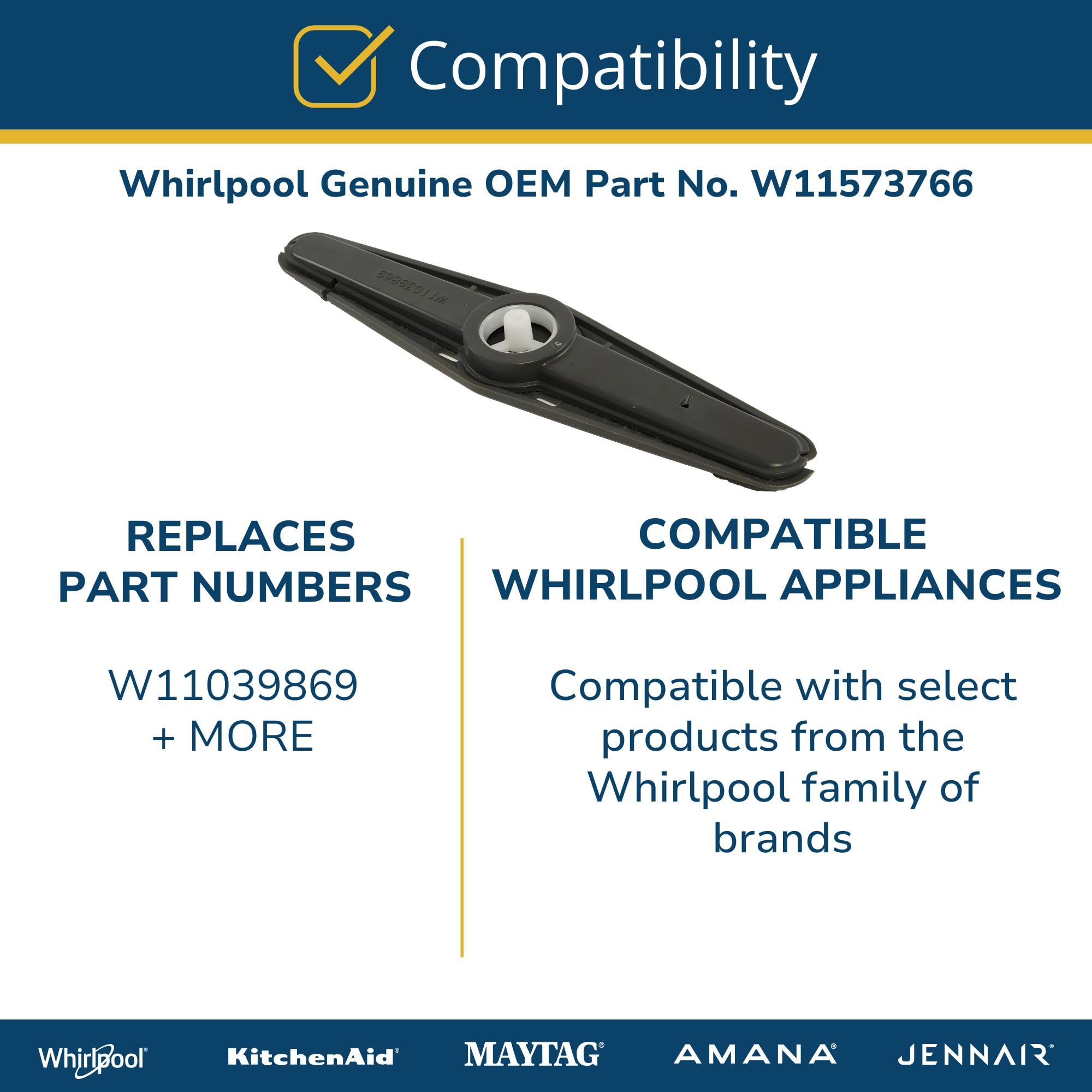 COMPATIBLE APPLIANCES: W11573766 is compatible with several major dishwasher brands, including Whirlpool, Maytag, KitchenAid, JennAir and Kenmore