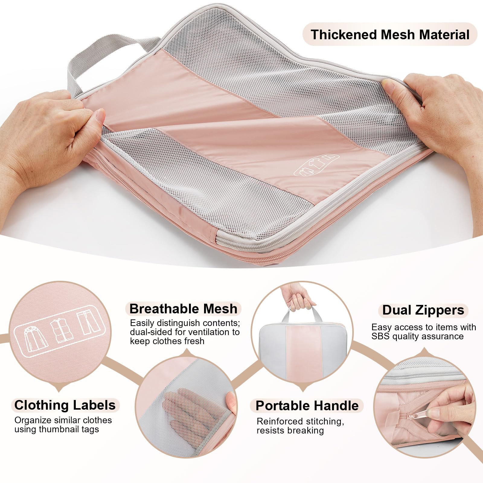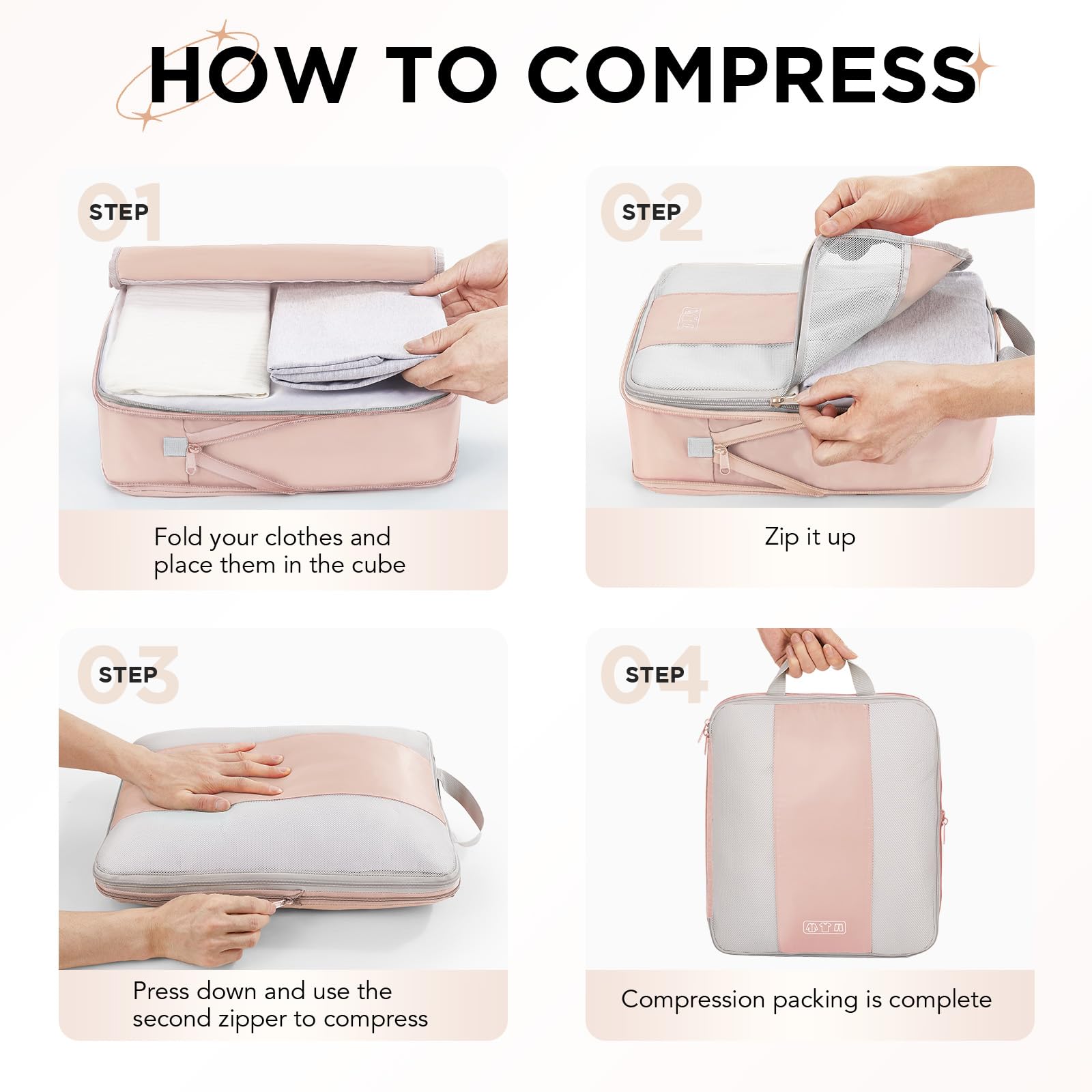 Maximize Packing Efficiency - Make every inch of your luggage count! These compression cubes work like a mini vacuum sealer, using an extra outer zipper to reduce bulk and create more space. Pack more clothes without sacrificing options—your favorite outfits, now travel-ready.