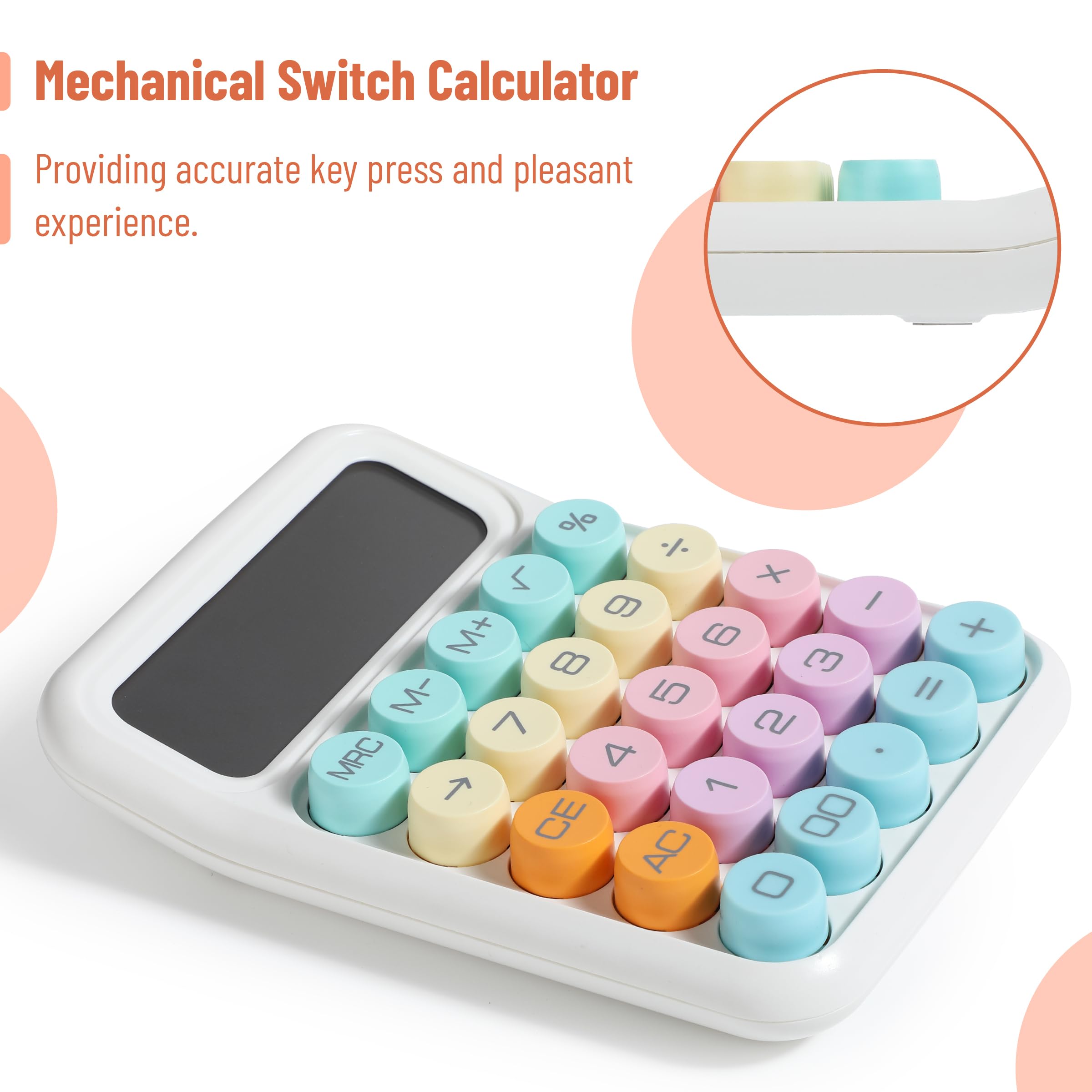 Designed with mechanical switches and round, colorful keys, this calculator offers a satisfying tactile feel and an eye-catching aesthetic.