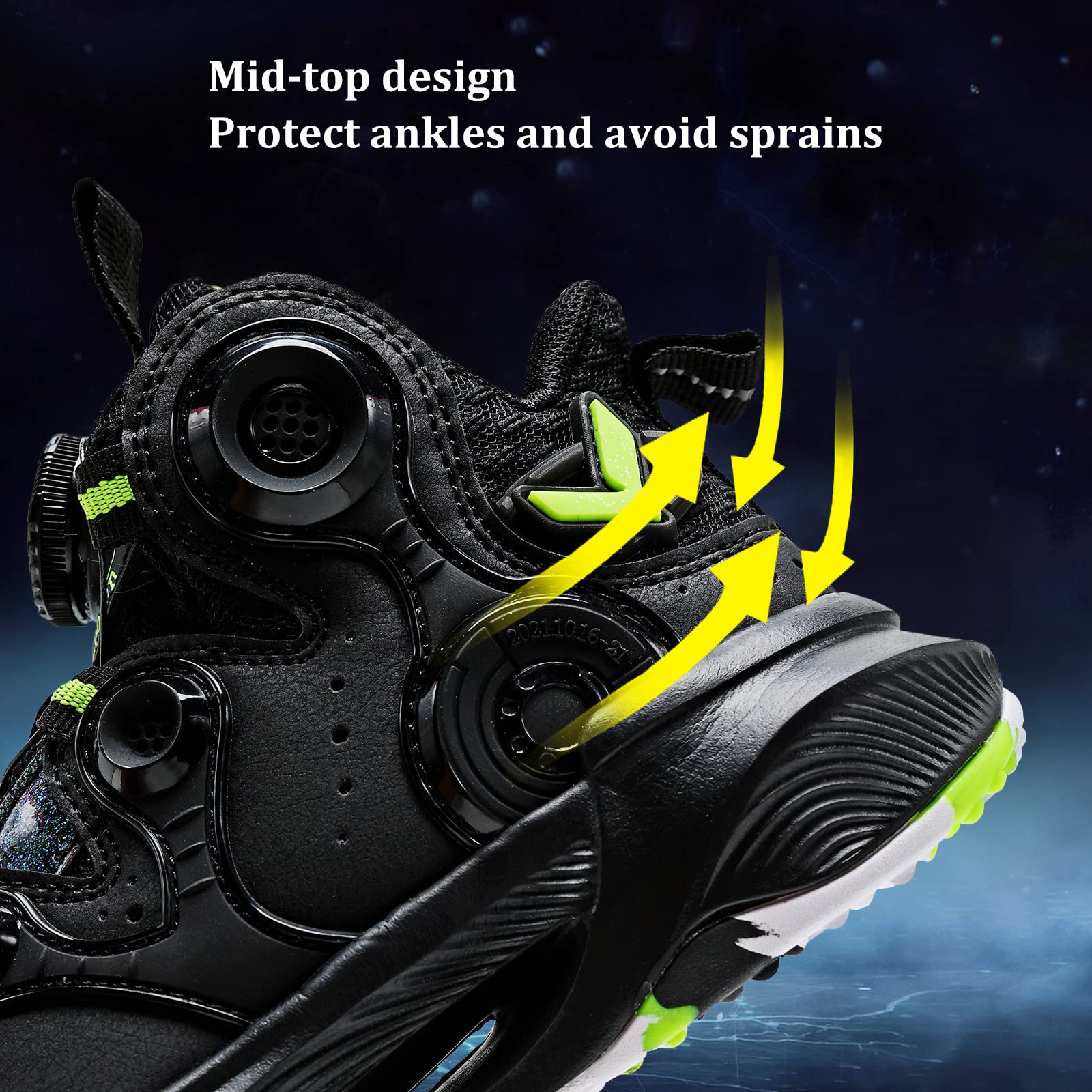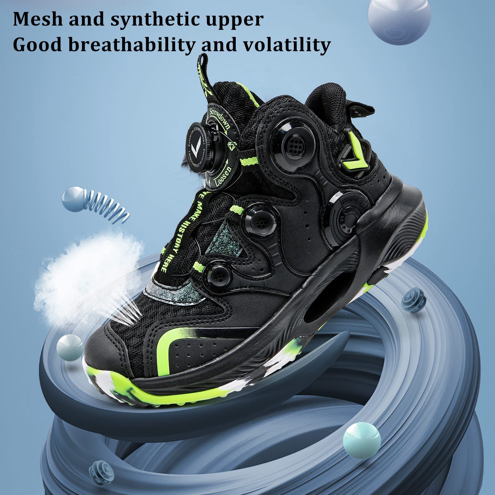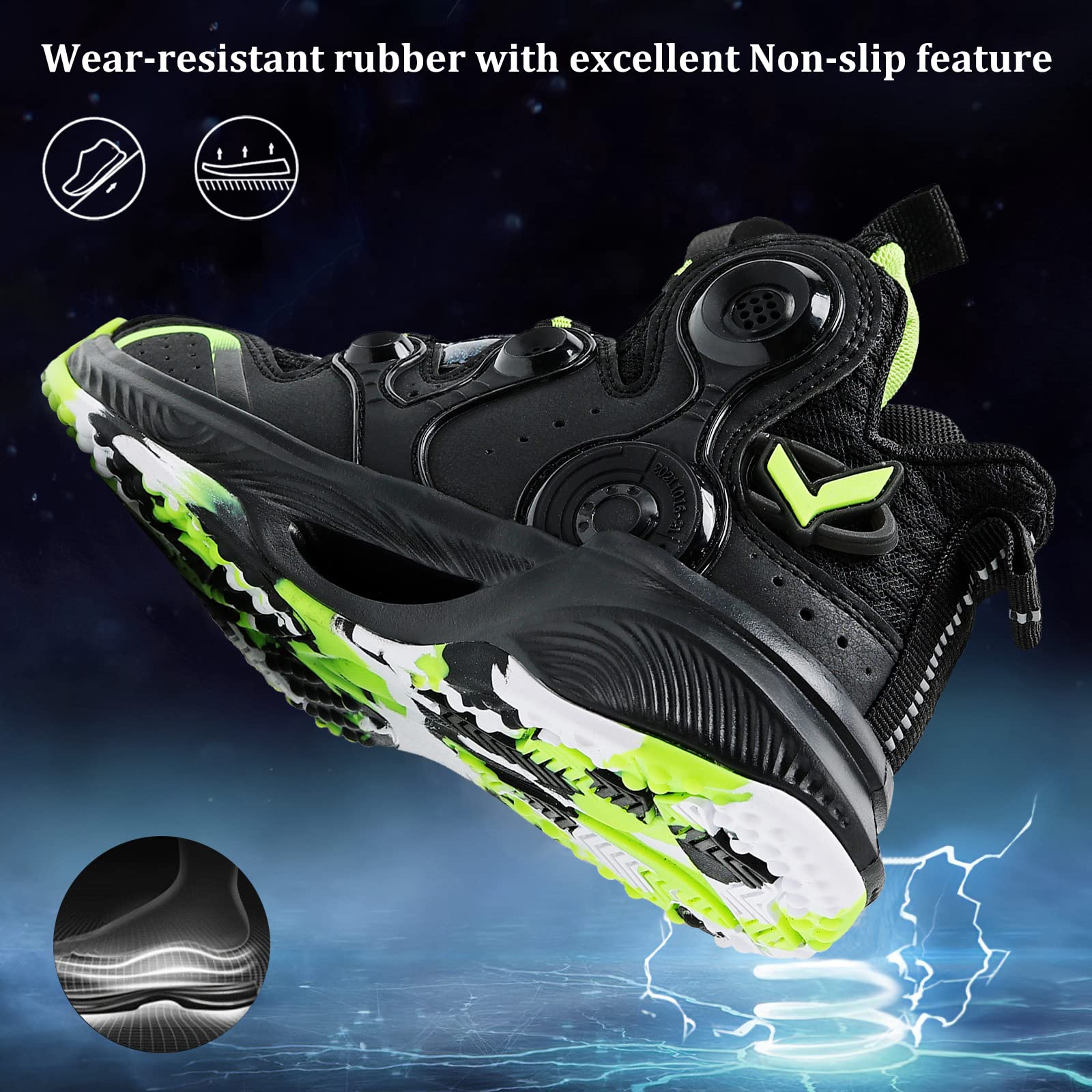 The kids basketball shoes have Rotary control system to make on-the-go Micro Adjustments with the simple of a dial. Ress to tighten, pop to release, easy on/off.