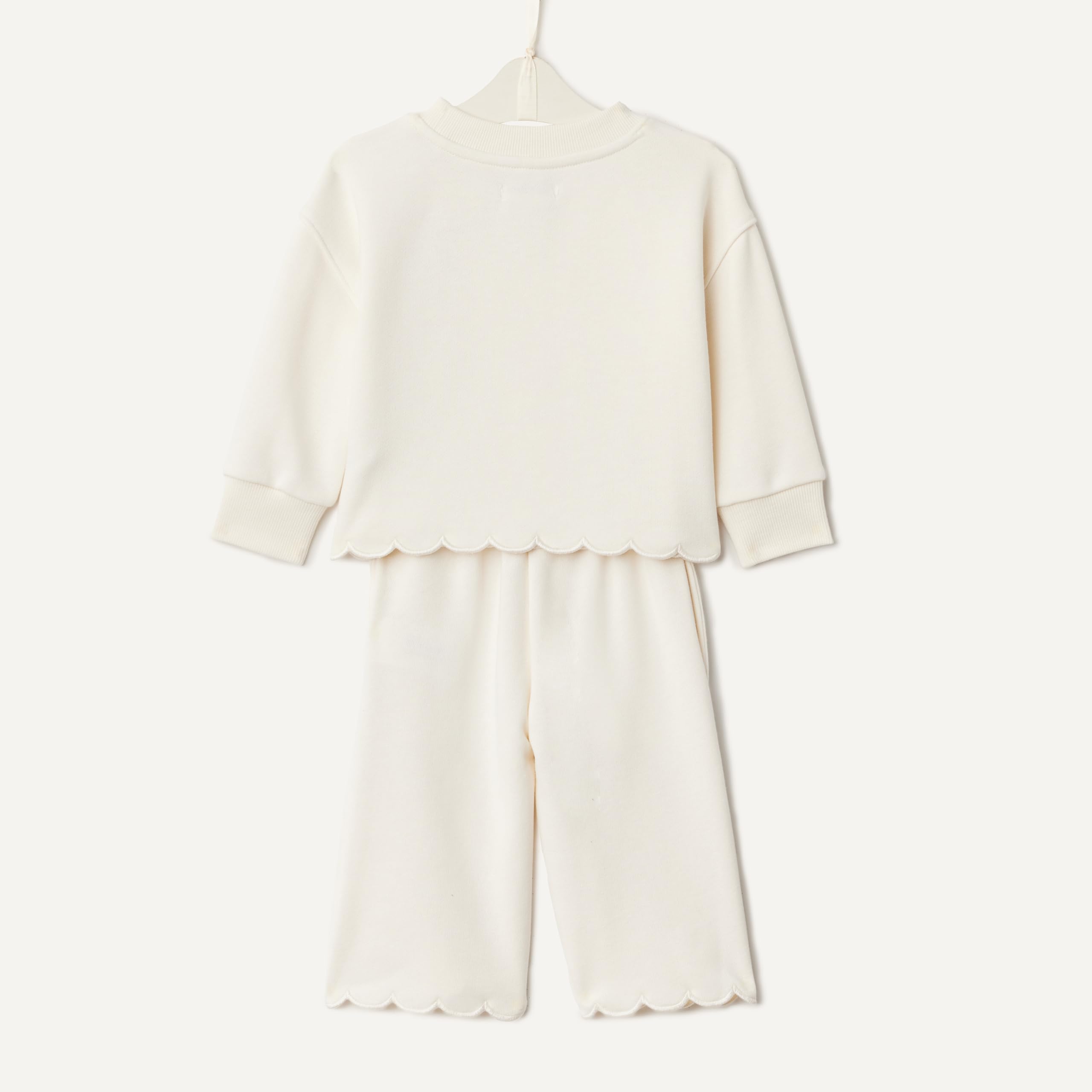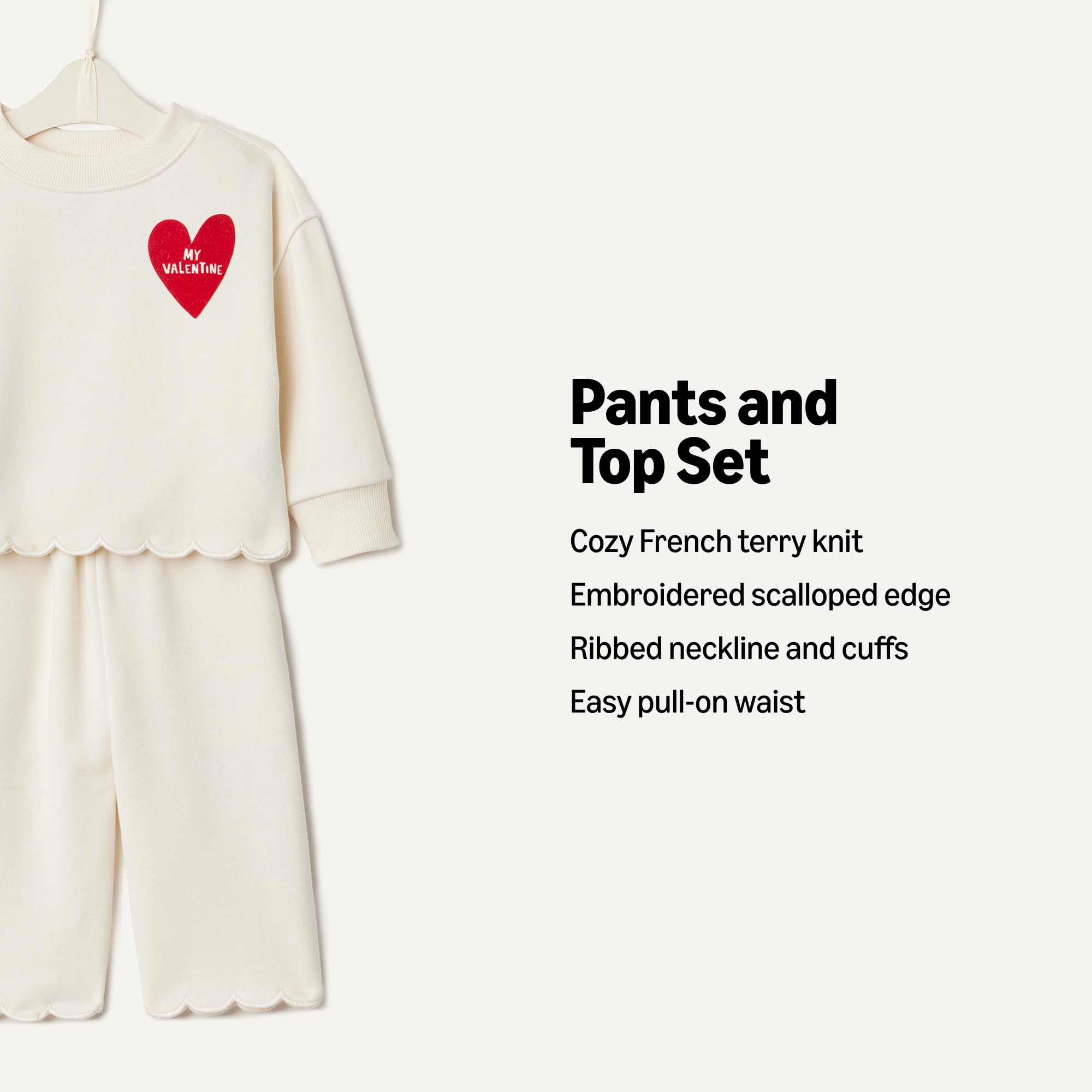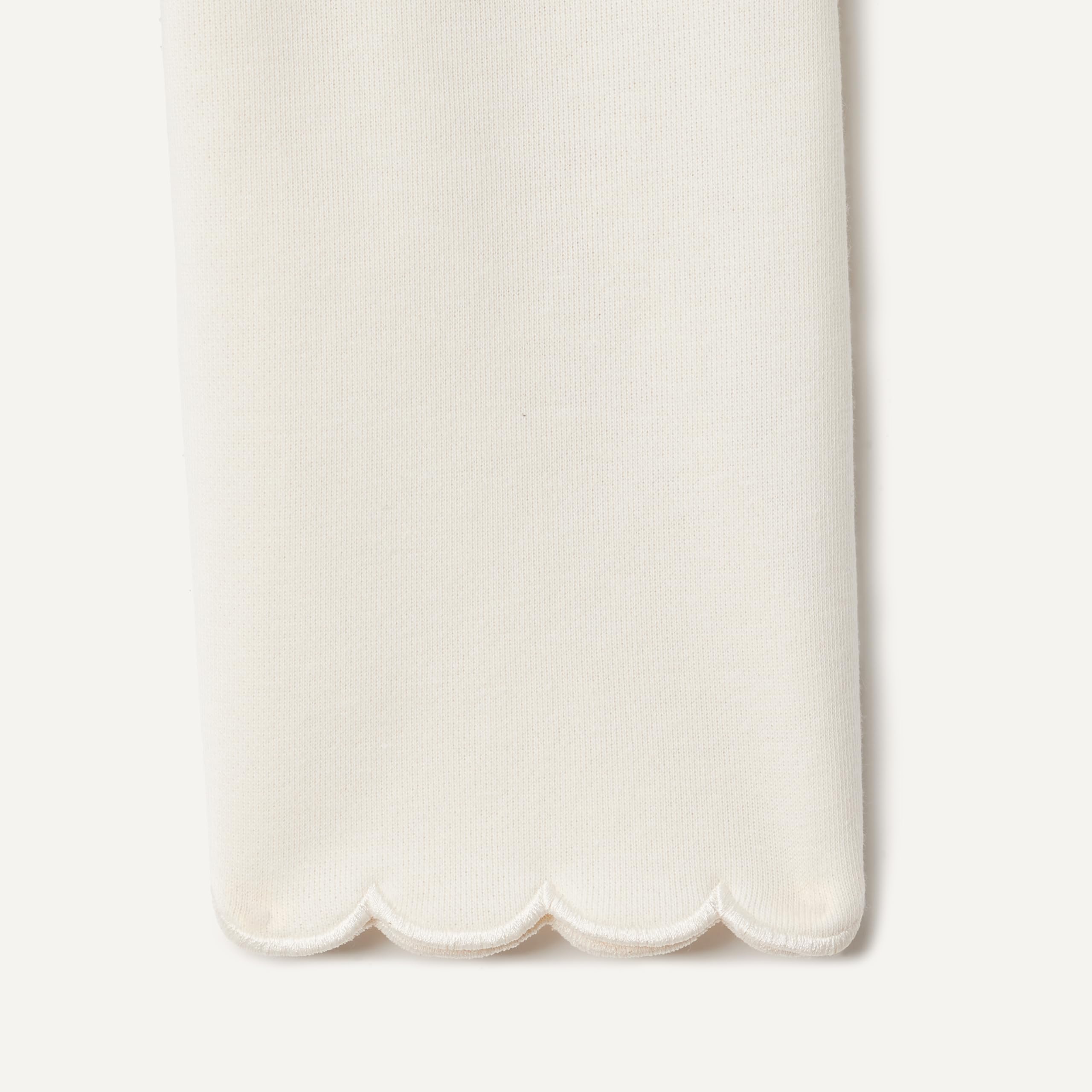 DETAILS: Embroidered scalloped edge, ribbed neckline and cuffs and easy pull-on waist with pockets