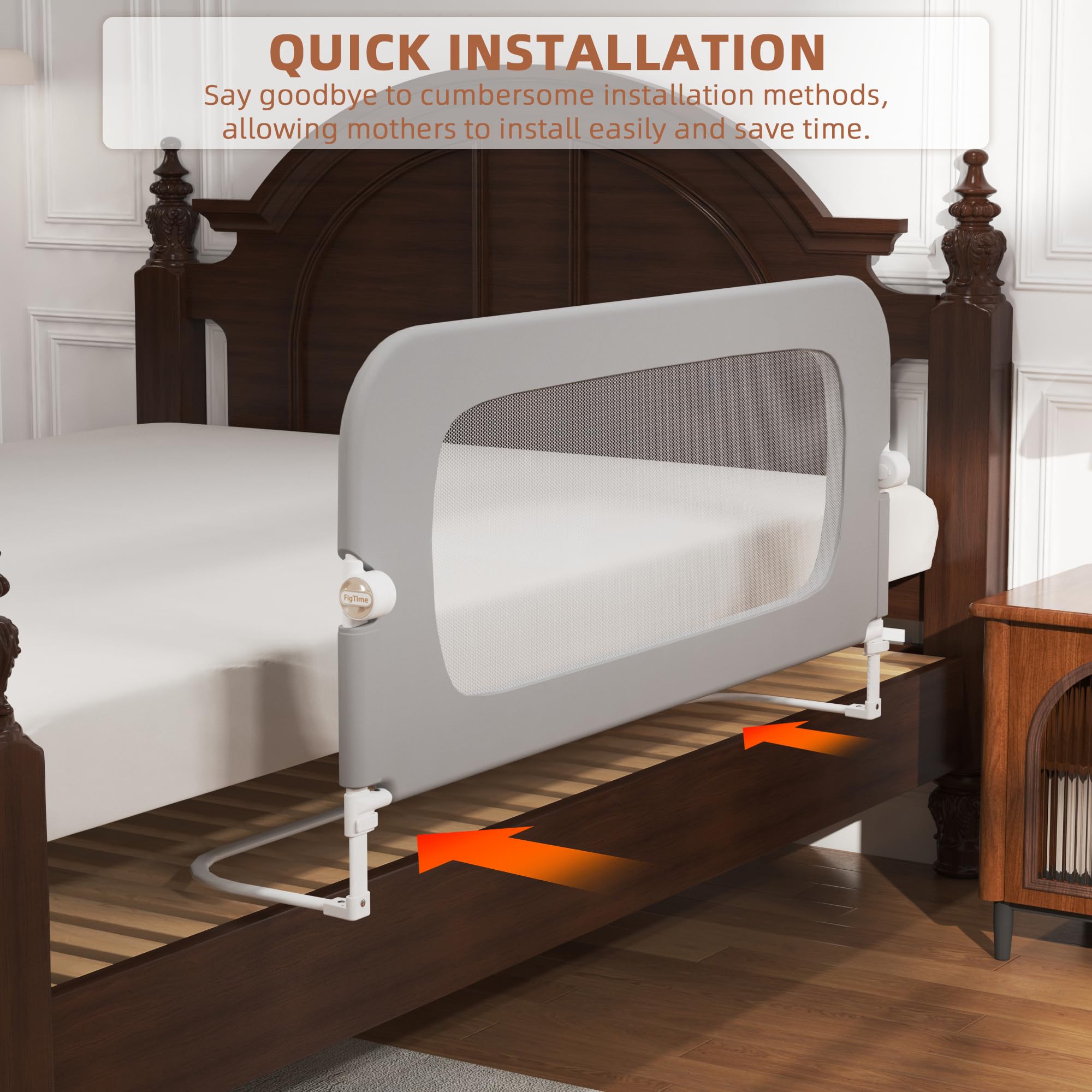 【TWO-TOUCH FOLDING】FigTime toddler bed rails are designed to fold easily, making it easier to get in and out of bed and easier for mothers to take care of their children. Both mothers and children can fold them easily, which simplifies daily work and enhances the overall user experience. The bed rail guard can be quickly installed in the bed, which saves time and effort for all parents. This design makes it an ideal choice for mothers who value convenience.