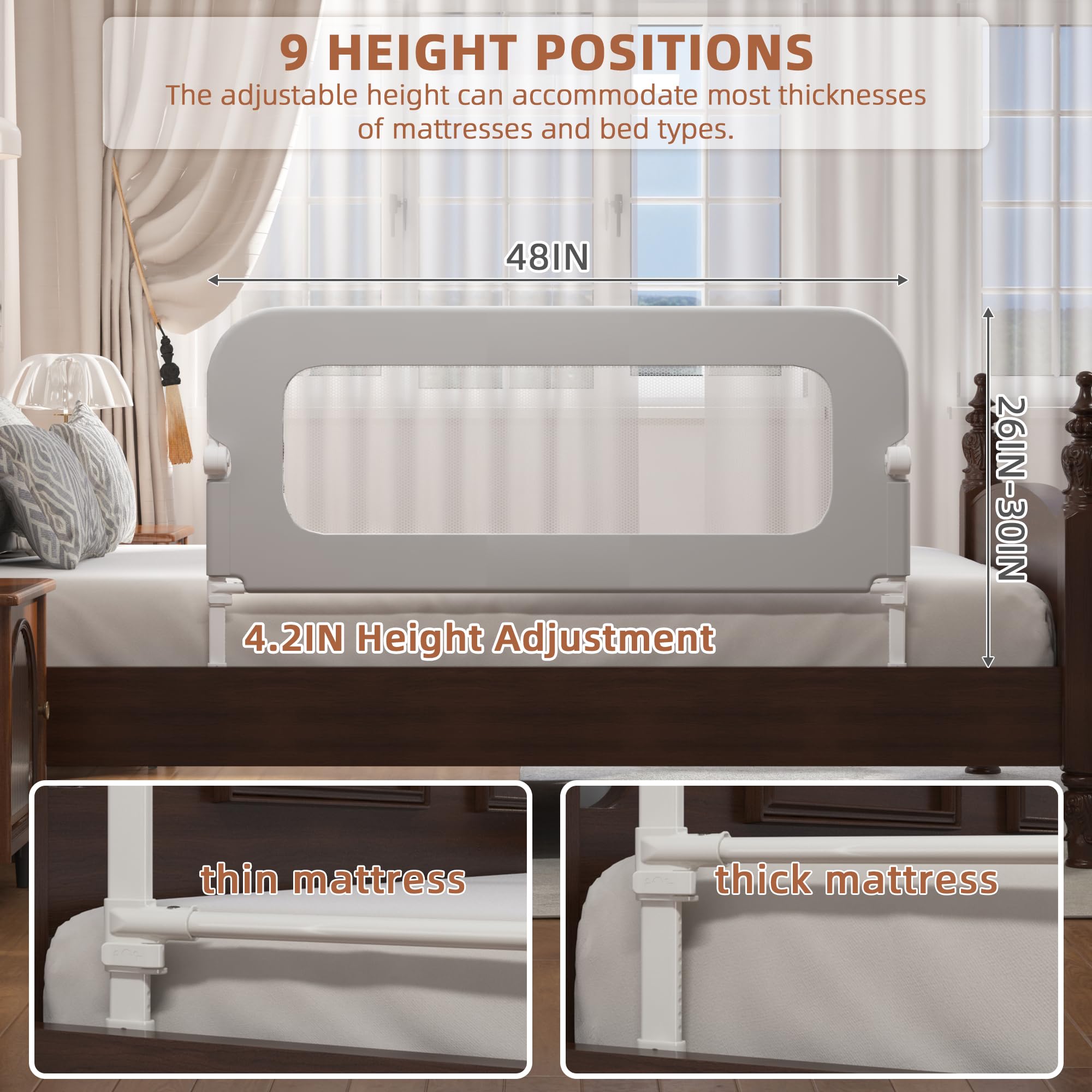 【ADJUSTABLE HEIGHT】FigTime toddler bed rails are equipped with 9 levels of adjustable height, which can flexibly adapt to various mattress heights, ensuring that the bed rails fit tightly with the mattress to achieve no gaps! As the child grows and the mattress height changes, the 26 to 32IN bed rail height can ensure comfort and safety, creating a perfect sleeping environment for your child. Suitable for most bed types on the market, such as box beds, wooden boards, flat beds, rib beds, etc.