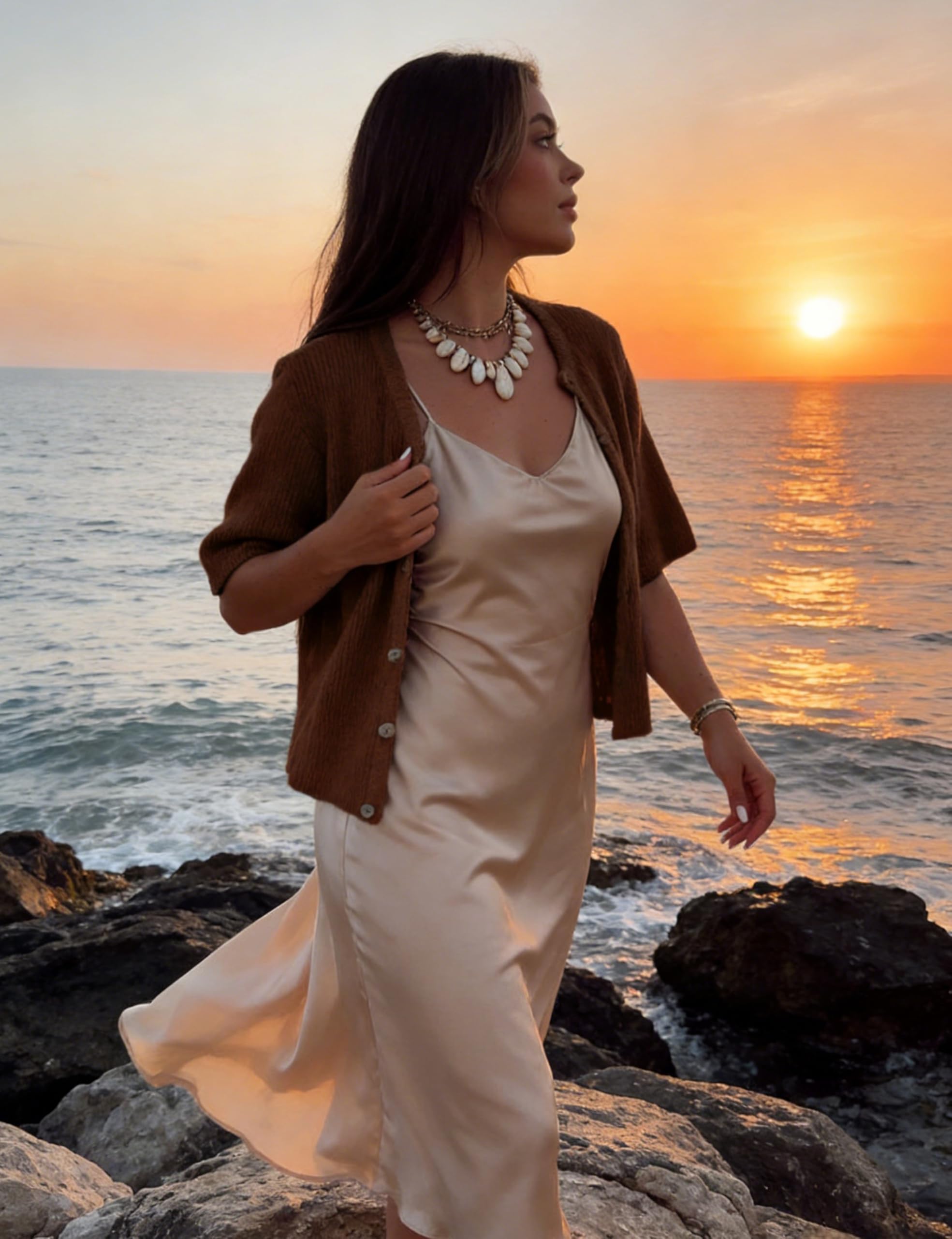 Pair this cardigan with white ruffled skirts, jeans, shorts, or layered over dresses. The neutral tone allows for easy styling with different accessories and footwear, perfect for creating an elegant, everyday look