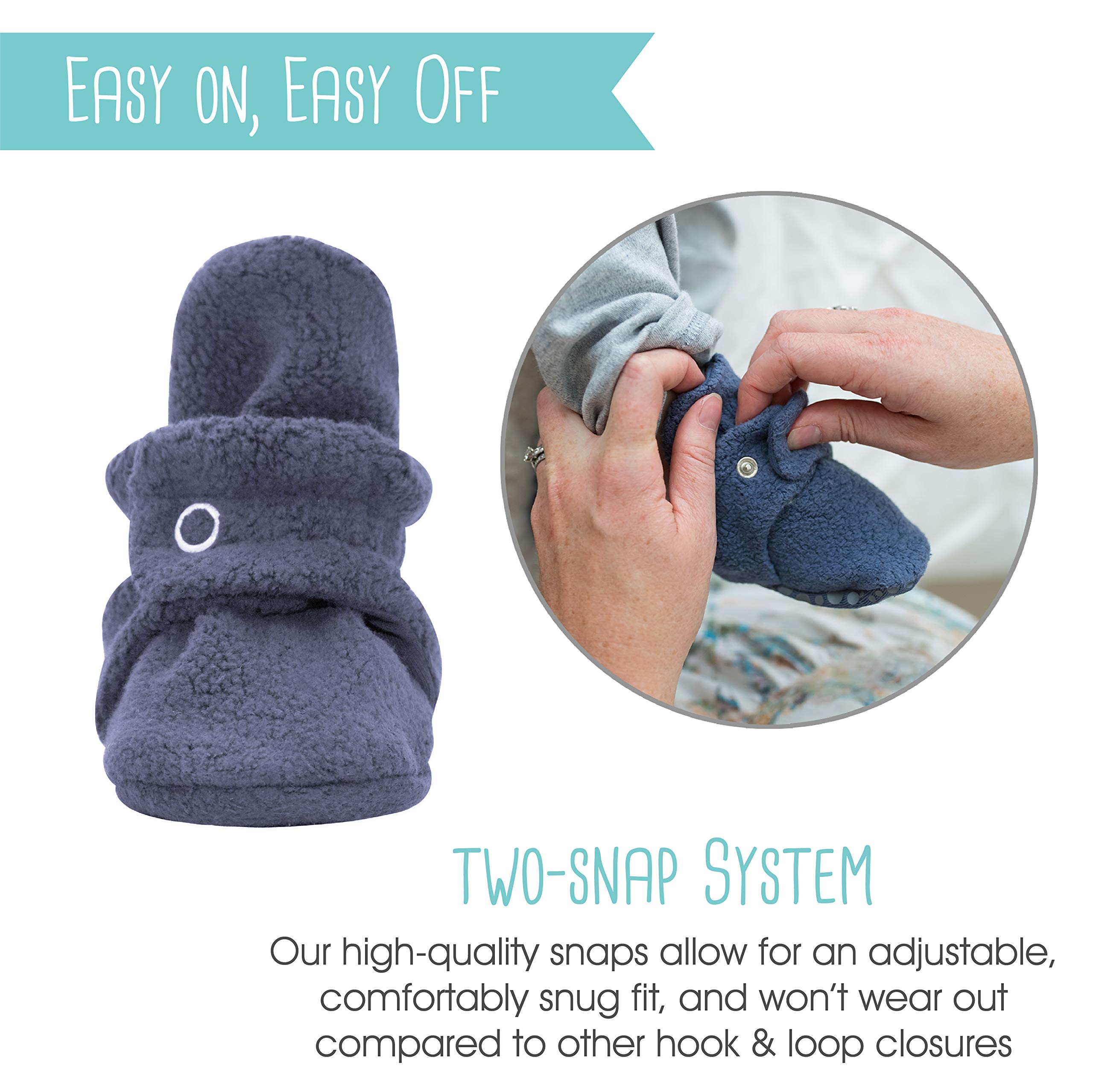 Description At Zutano, we are parents first, so we understand how important it is for your baby to be comfortable, safe, and adorable in all their clothes and accessories. Quality fabric and intuitive designs are our hallmarks, and we believe thatβs what distinguishes our products from the rest of the must-have newborn essentials on the market. Our Cozie Fleece Baby Booties are made with a high-quality blend of 70% cotton and polyester and are fully lined with 100% organic cotton to protect your babyβs delicate skin. The innovative double-snap design with gentle elastic saves mothers time and money and helps maintain their sanity by making it nearly impossible for the baby to remove these booties from their feet. No more lost socks or booties, no matter how active your little one is! Our fleece baby booties are the perfect gift to welcome a new little one to the world, making them the perfect addition to any registry for baby-shower gifts. These booties for babies are long-lasting, durable, comfortable, and cute. Theyβll become a family keepsake that can be passed down from child to child or donated in good, clean condition to benefit another family. In 1989, Zutano was founded by new parents Michael and Uli Belenky, who desired a wide selection of high-quality baby clothing for their infant daughter. Designed by Uli and hand delivered by Michael on his bicycle, Zutano products found their way into Manhattan boutiques and eventually into the hearts of parents everywhere. In its over 30 years in business, Zutano has become one of the best-known US apparel and accessory brands for children. We owe much of our success to our amazing customers, who spread the word of our dedication to quality and functionality in each of our unique products. Whether you collect our rainbow of colors or receive well-loved hand me downs, we hope our baby clothing and accessories make your day a bit less hectic.