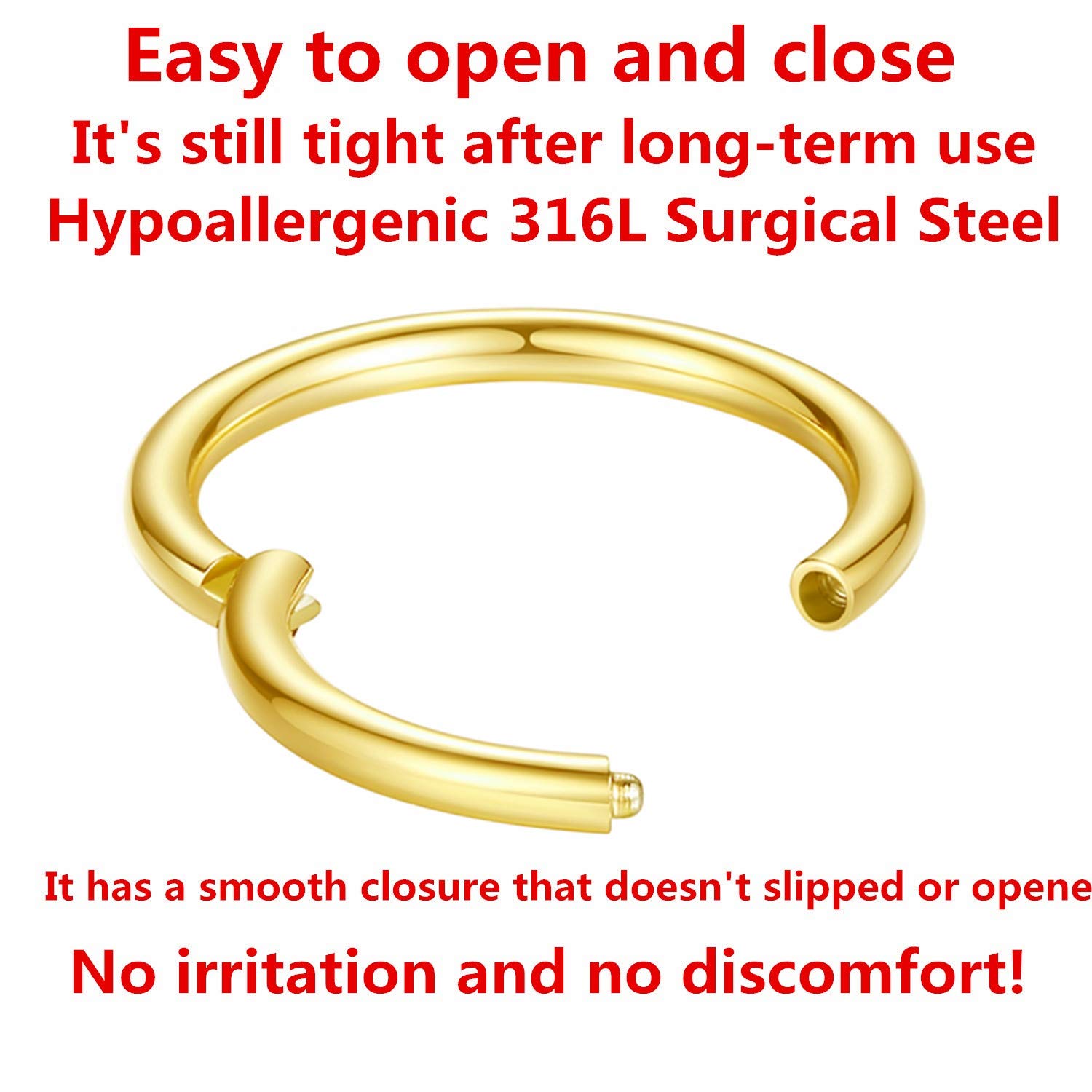 Perfect for Nose, Cartilage, Septum, Tragus Piercings,Helix Earring, Daith,Conch,Rook Ear Piercing, Lip Rings, Belly Ring,Nipple Piercing and more. Very easy to open/close a click closure by hand. Not require a tool.Smooth surface, comfortable to wear without sharp edge. Match with suitable apparel for different occasion. Smooth Surface and easy to use.